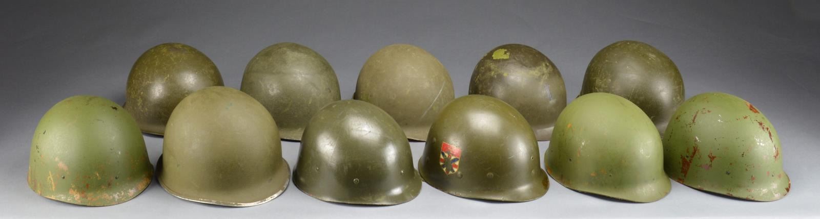 7 Helmets & 9 liners. 2 Helmets are late WWII/Korea w/ front seams. Balance of helmets post WWII w/ rear seams. Most helmets are fitted w/ chinstraps & have plain OD paint colors. Liners are mixed shades of OD Green. 8 Liners have complete suspensions w/ sweatbands.1 Liner has incomplete suspension & partly obscured fleur de lis shield decal. Helmets may have sm. dents, scratches, flaking paint & wear. Liners may have frayed suspensions, buckles may be incomplete. (02-13776-35/RW). $400-600.