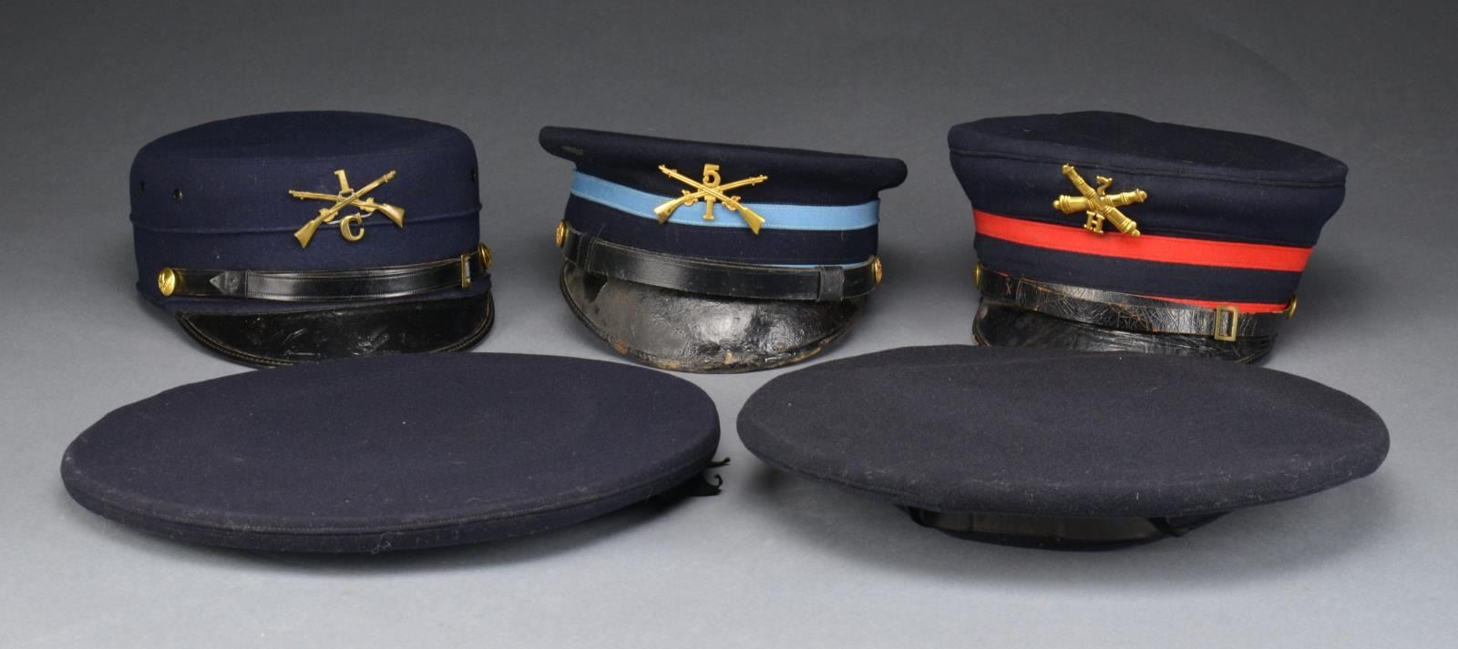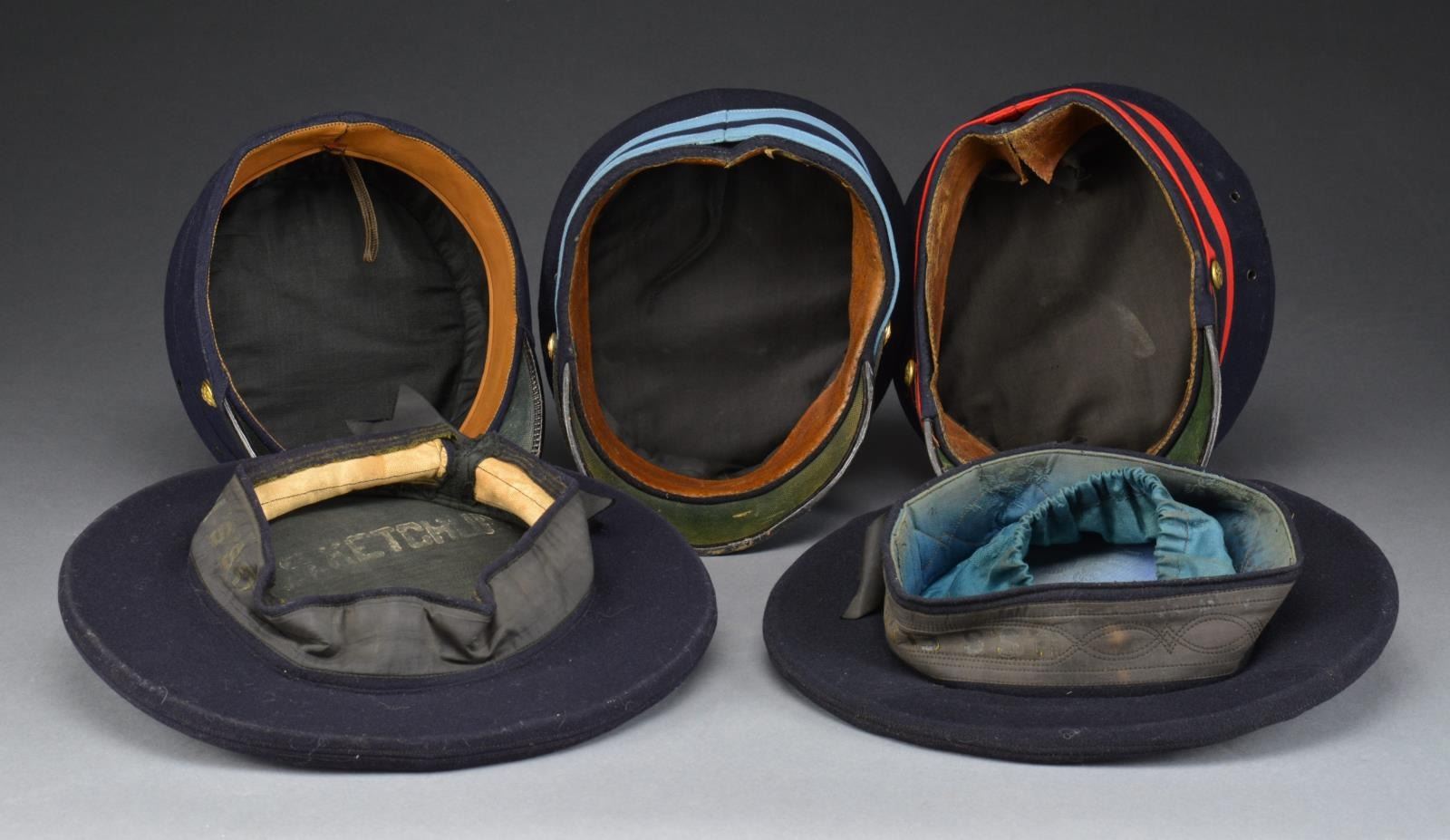 1) M1895 Enlisted forage cap w/ dark blue wool body. Cap features 2 vent holes on each side, leather chinstrap w/ eagle side buttons & a crossed rifle insignia for Company C of the 1st Infantry. Leather sweatband. Polished cotton interior lining. CONDITION: hat shows very light wear overall. 2) M1902 Army Infantry enlisted visor hat w/ a dark blue wool body. Cap features a light blue & dark blue band, leather chinstrap w/ eagle side buttons & a crossed rifle insignia on the front for Company I of the 5th Infantry. Leather sweatband. Polished cotton interior lining. CONDITION: hat shows light to moderate wear. Sweatband has a sm. tear. 3) M1902 Army Artillery enlisted visor hat w/ a dark blue wool body. Cap features a red & dark blue band, leather chinstrap w/ eagle side buttons & a crossed cannon insignia on the front for Company H of the 7th Artillery. Leather sweatband. Polished cotton interior lining. CONDITION: hat shows light to moderate wear. 4) Spanish American War to WWI era Navy enlisted flat hat w/ a cap talley that reads, “U.S.S. ELCANO”. The Elcano was a gunboat captured from the Spanish Navy during the Spanish American War. The gunboat was officially commissioned in the U.S. Navy in the year 1902. She served for many years on the Yangtze Patrol seeing significant action against various pirates & warlords. CONDITION: hat shows very light wear. Lettering on cap talley is a bit light. 5) WWI era enlisted flat hat w/ a cap talley that reads, “U.S.S. VIRGINIA”. The battleship Virginia served in the Atlantic Fleet & took part in the 1907-09 cruise of the Great White Fleet around the work. The ship was involved in the Mexican Revolution of 1913-14 including the occupation of Veracruz, Mexico. She also served as a training ship & a convoy escort during WWI. CONDITION: hat shows light wear overall. Lettering on cap talley is a bit light. (02-14157/BF). $600-800.