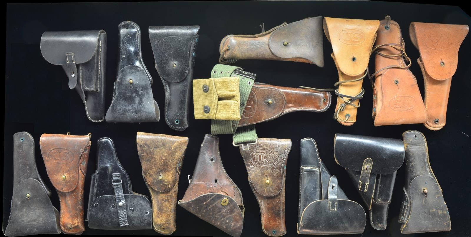 U.S. MARKED FLAP HOLSTERS: brown Hoyt 1917 good plus w/ 0-225837 under flap & 2 stamped inked nos. Unmarked green web belt (good) w/ Russell May 19 dated dual mag. pouch (very good) / fair brown w/ belt loop removed / fair black Warren Leather Goods w/ white painted A4 between loops / black over brown Warren Leather Goods w/ wire loop cut out / fair brown S& R J.P.C.; no wire loop / 2 tan very good Boyt 44s; “SANDY” under one flap / tan 1944 very good Milwaukee Saddlery / fair oiled dark brown 1943 Grafton & Knight; broken stitching at bottom / good Hoyt 1918 J.J.M. / fair to good brown 1917 Perkins Campbell / good dark brown Clinton 1911. ASSORTED HOLSTERS: fair makeshift holster w/ Lift The Dot snap for flap & double belt loops on back. Consignor states for 16 shot LeTerrible / very good black P.38 holster marked on back between loops “joa/1943/WaA706”; double flap w/ stud strap retention; belt loops installed w/ brown showing & black inside. Includes P.38 marked 8 rd. mag. w/ eagle “359” proofs on spine plus base marked “5879f” / good plus black post war P.1 German police holster dated 3/67. Drop design w/ stud strap retention. Includes parkerized Walther banner P.38 marked 8 rd. mag. / very good black double flap P.38 holster marked ”jhg/44/WaA41” / good black double flap P.38 holster marked “0/0833/0007” over “ P38” over eagle police symbol. CONDITION: varies from fair to very good. (02-14086/NW). $400-700.