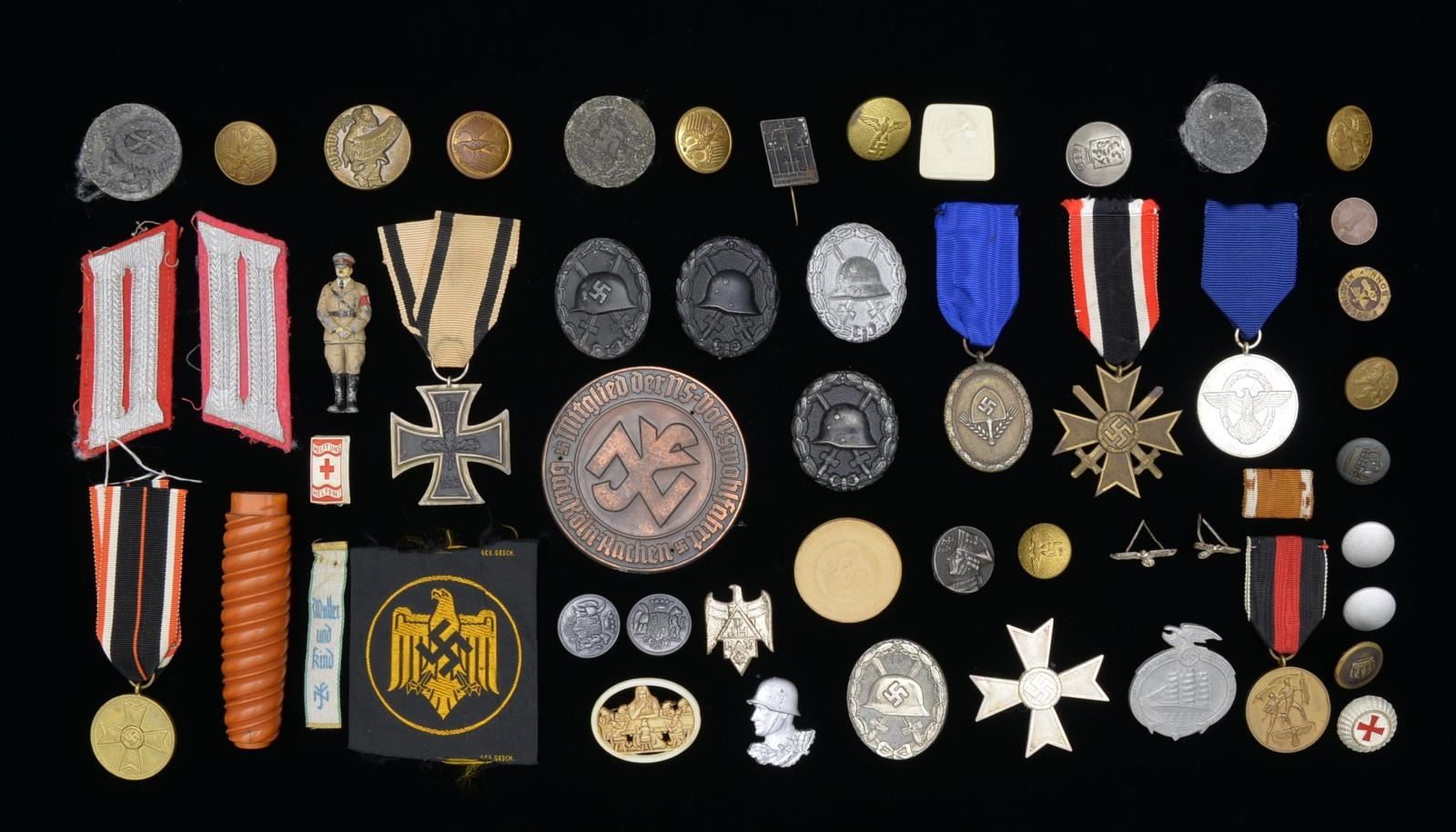 INSIGNIA. This varied group includes but is not limited to a WWI 2nd Class Iron Cross w/ next of kin ribbon. / WWII Police 8 Year Long Service medal w/ ribbon. / Sudetenland medal w/ ribbon. / WWII War Merit Cross w/ swords & ribbon. / RAD Loyal Service medal w/ ribbon. / 1st Class War Merit Cross without swords. / WWII War Merit medal w/ ribbon. / 2 WWI Black Wound badges. / WWI Silver Wound badge. / WWII Black Wound badge. / Orange grip for an Army dagger. / 2 1/2" Metal, full color standing Hitler. / WWII NSV award plaque. / Lot further includes various tinnies, buttons, collar tabs & more. CONDITION: all items show light wear. Pot metal tinnies show corrosion. (02-14164/BF). $500-800.