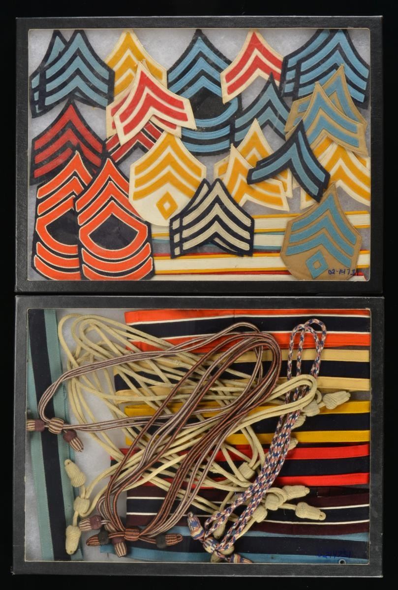 & HAT BANDS. This group consists of infantry, cavalry, artillery, signal corps & engineer chevrons of the M1902 style along w/ service sleeve hash marks. / There are also 7 M1902 hat bands for the cavalry, signal corps, artillery & several more branches. / There are a number of hat cords for various branches of the service. CONDITION: all items show only storage wear & are likely unissued. (02-14731/BF). $ 200-400.