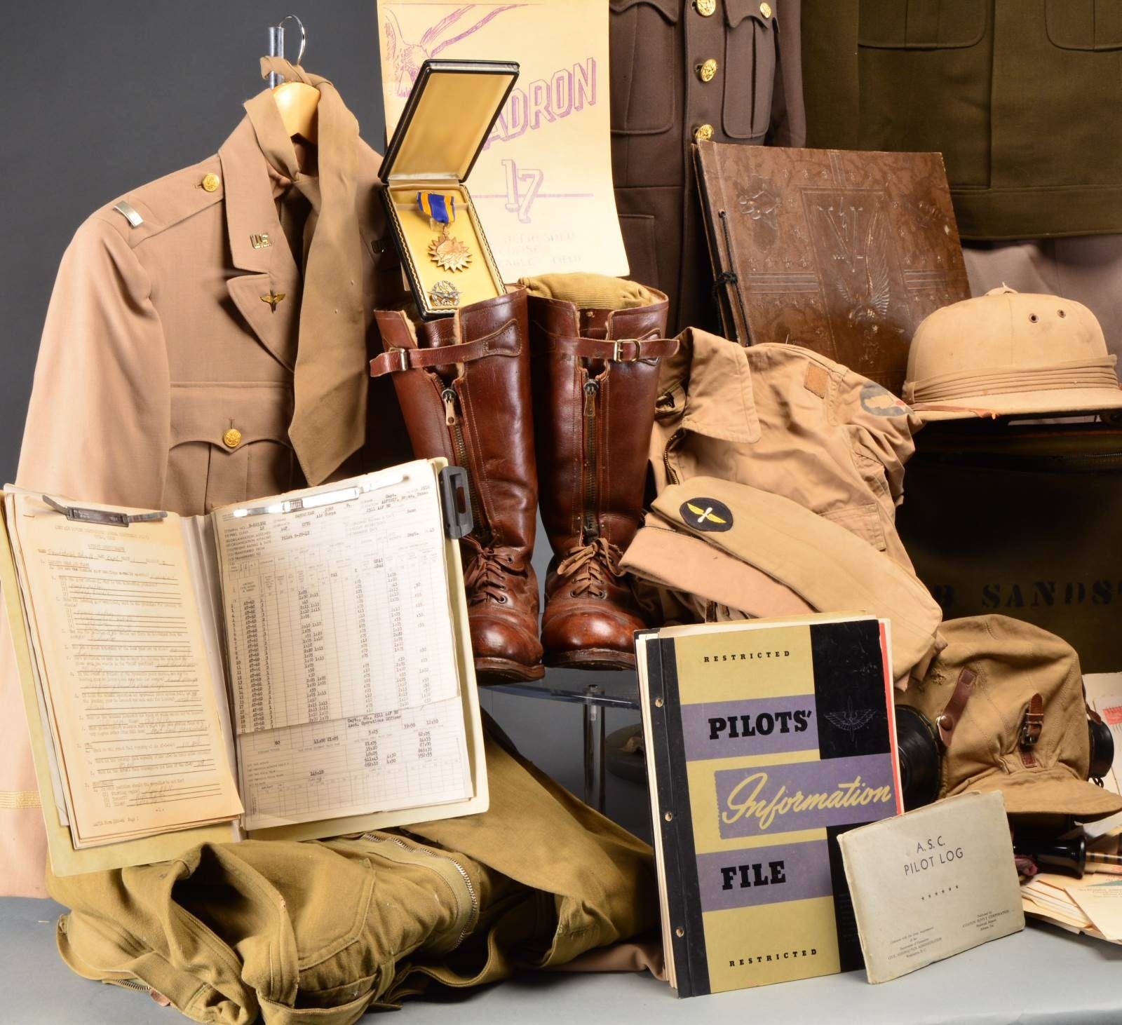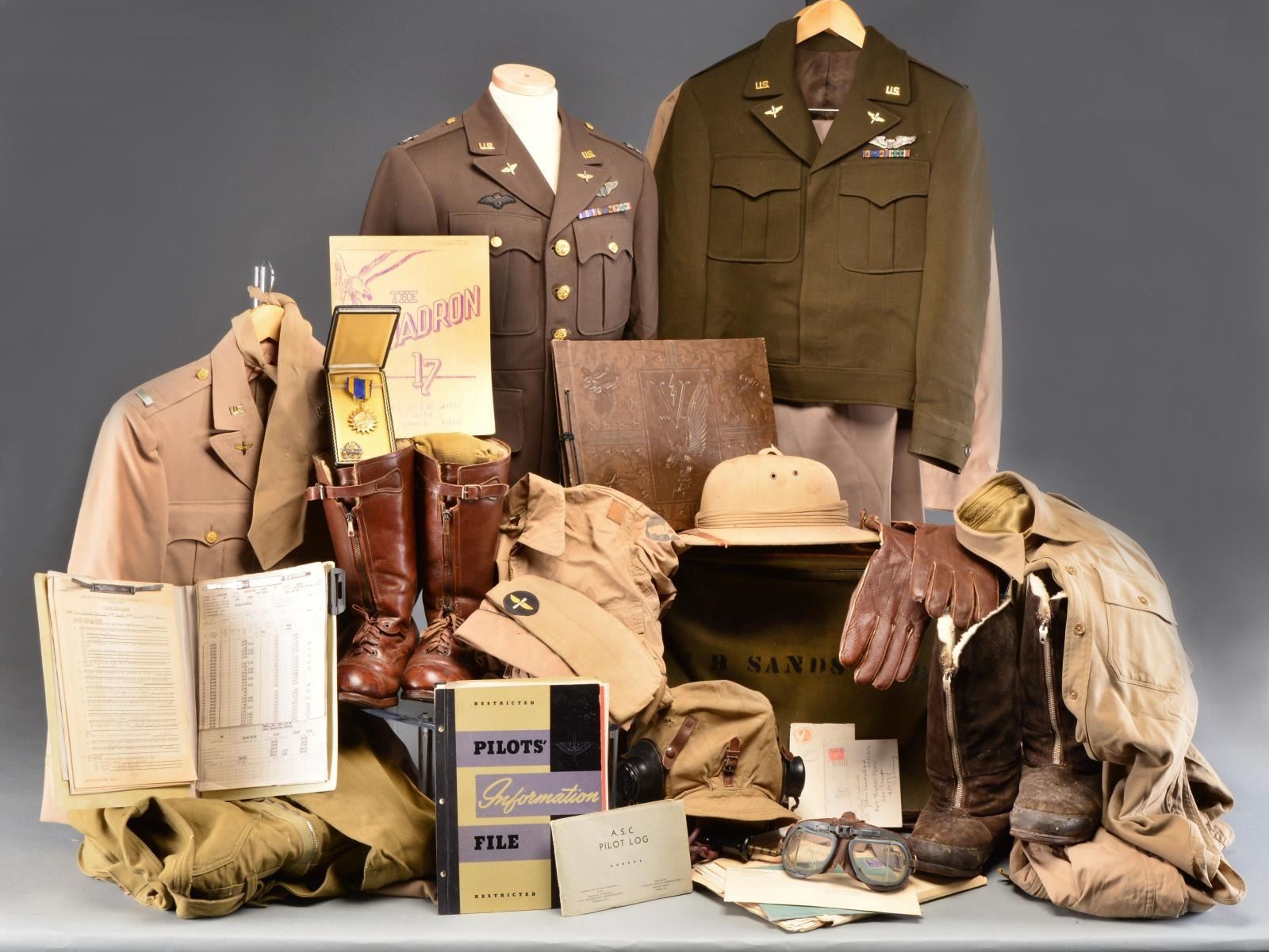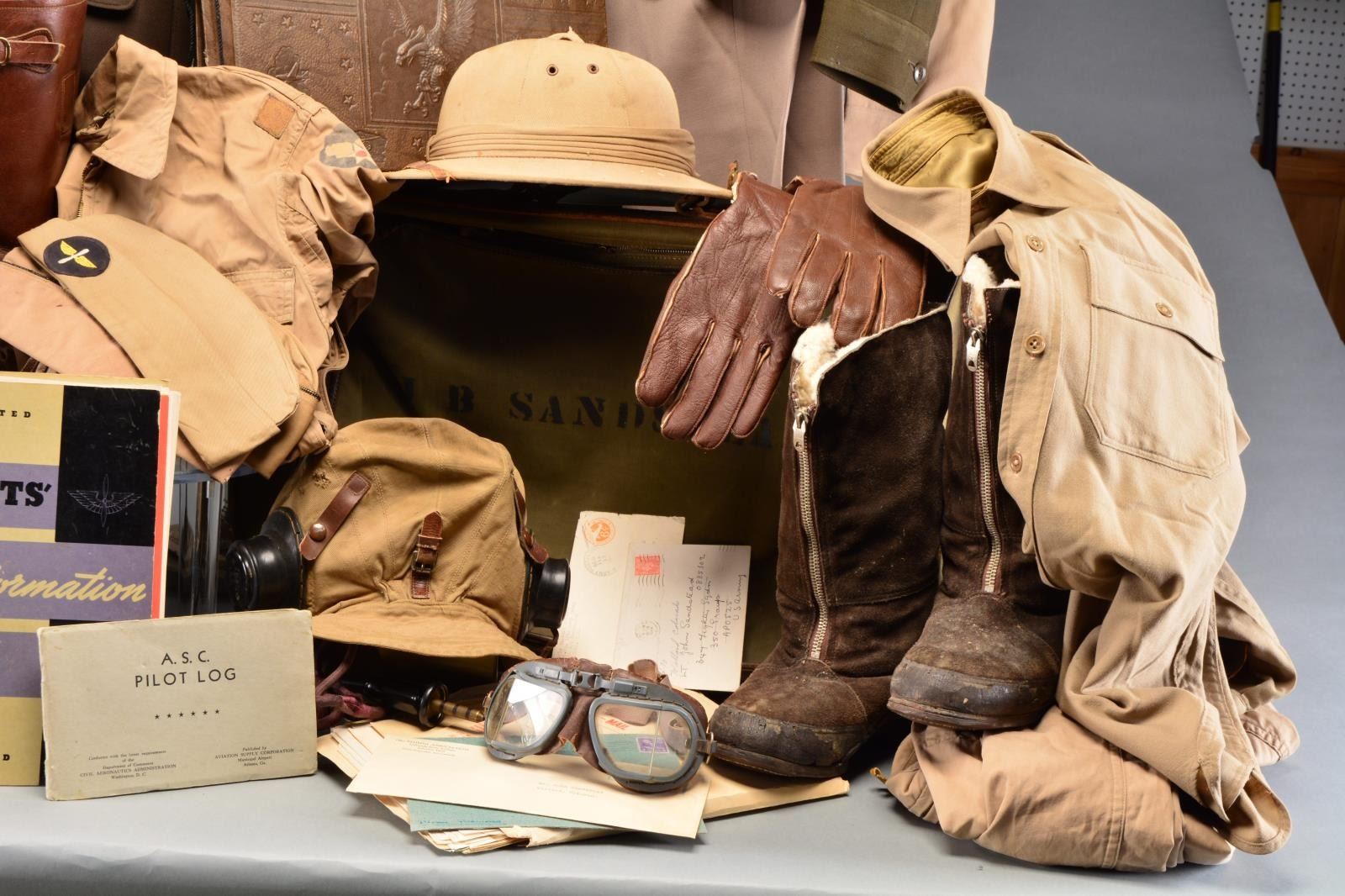 This extensive group belonged to First Lieutenant Captain John B. Sandstead. Sandstead was an American pilot serving w/ a British squadron prior to the US declaring war. He subsequently returned to America & was a pilot in the US Air Corps. Besides a voluminous amount of paperwork relating to Sandstead & his service, the group contains his flight bag stenciled “JB SANDSTEAD”. / Sheepskin lined American flight boots. / Sheepskin lined British flight boots. / Khaki pith helmet. / Leather British flight gloves. / US dark green captain’s uniform with pin on sterling US pilot wings above a 3 award medal bar that includes Distinguished Flying Cross, Air Medal with 3 oak leaves, European Theater medal with 3 bronze stars. Above the right breast pocket is his sew on bullion RAF wings. There are captain’s bars on the shoulders. Left sleeve has 6 service bars. / US Khaki first lieutenant’s uniform with sterling pilot’s wings above 3 award ribbon bar that includes DFC, Air Medal with 1 oak leaf & ETO with 3 bronze stars. Pants included. / Officer’s khaki Ike jacket with sterling pin back pilot wings above a 3 award ribbon bar that includes Air Medal, Purple Heart & ETO with 3 bronze starts. Pants included. / Captain’s dark green Ike jacket with pin on sterling pilot wings above a 2 award ribbon bar that includes Air medal with 3 oak leaves & ETO with 3 bronze stars. Pants included. / Zipper front khaki coveralls with belt. Stenciled Army Air Force on the left sleeve. / Type A4, zipper front, olive drab wool coveralls with belt. / Flight goggles with 1 cracked lens. / 1 Khaki overseas cap with a gold winged, white propeller on round black patch attached to the front. / 2 Officer’s overseas caps. / 4 Pair of khaki socks. / British flight helmet with ear phones, throat mike & cords. / 2 Khaki neck ties. / Zipper front, khaki coveralls with belt. / Wool khaki dress shirt. / Cased Air Medal. / Sterling RAF 1942 badge. / Photo album containing numerous photos of Sandstead & his associates, many with planes. An extremely lg. archive & uniform group belonging to long serving WWII pilot. CONDITION: items generally show light wear w/ no notable damage. Boots show moderate wear. 1 Necktie is quite tattered. There are no sew on patches on any of the uniforms. Paper is in very good condition & well preserved. (02-13501/BF). $1,750-2,250.