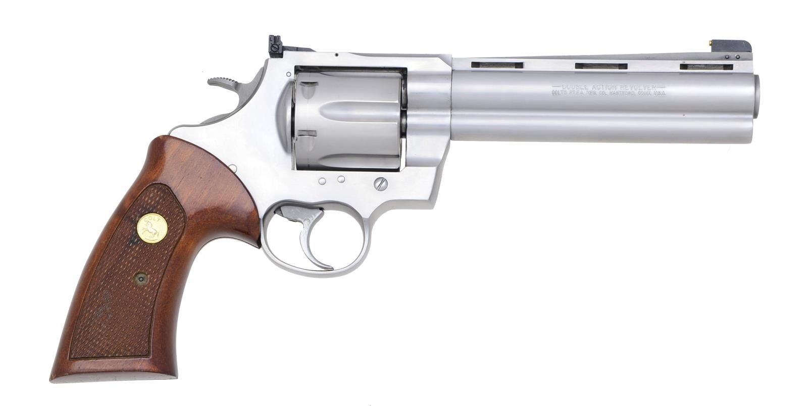 Cal. 45 Colt. S# MM64510. Bbl. 6" w/ VR & full length lug. McGivern bead front sight w/ white outline adj. rear sight. 6 Shot fluted cyl. Stainless steel construction. 2 Piece checkered walnut grips w/ Rampant Colt medallions. 1994 Mfg. CONDITION: stainless finish shows scattered sm. scratches & sm. w/ cyl. drag line. Grips show a few sm. handling marks. Bright near excellent bore. Smooth mechanics. (20-2409/DS). MODERN. $1,200-1,800.