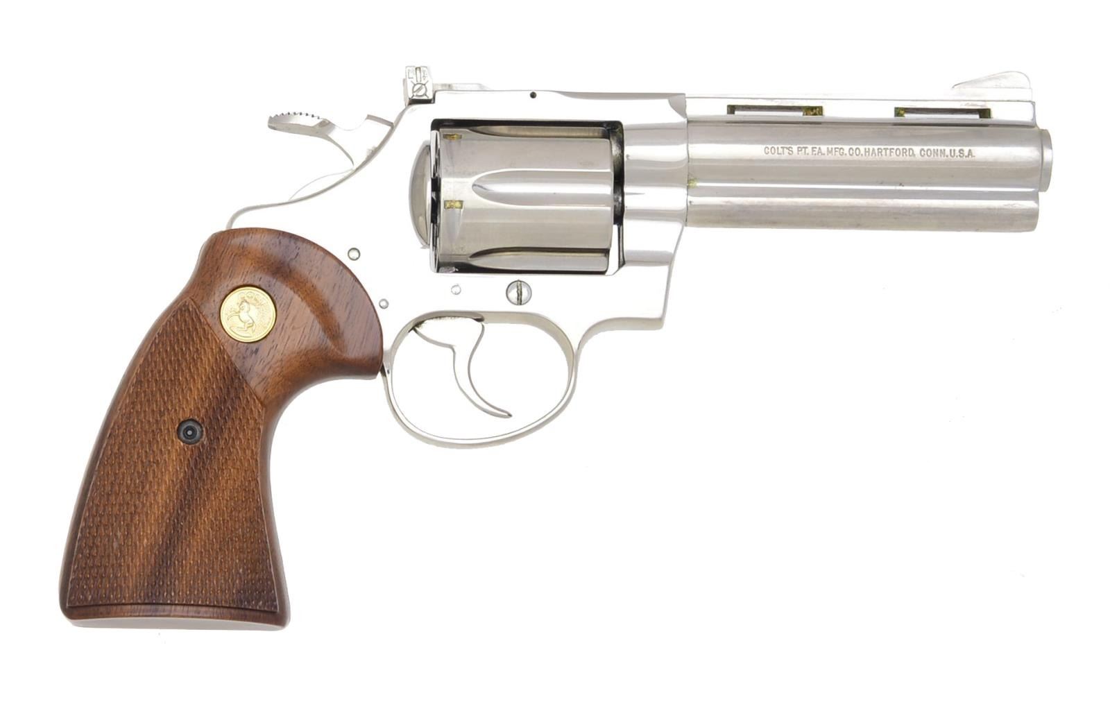 Cal. 38 Spl. S# R02475. Bbl. 4" w/ VR & full length ejector lug. Serrated ramp front sight w/ added orange paint & square notch adj. rear sight. 6 Shot fluted cyl. Nickel finish. 2 Piece checkered walnut grips w/ Rampant Colt medallions. 1977 Mfg. CONDITION: over 98% nickel finish showing a cyl. drag line. Very good grips. Bright near excellent bore. (20-3315/DS). MODERN. $800-1,200.