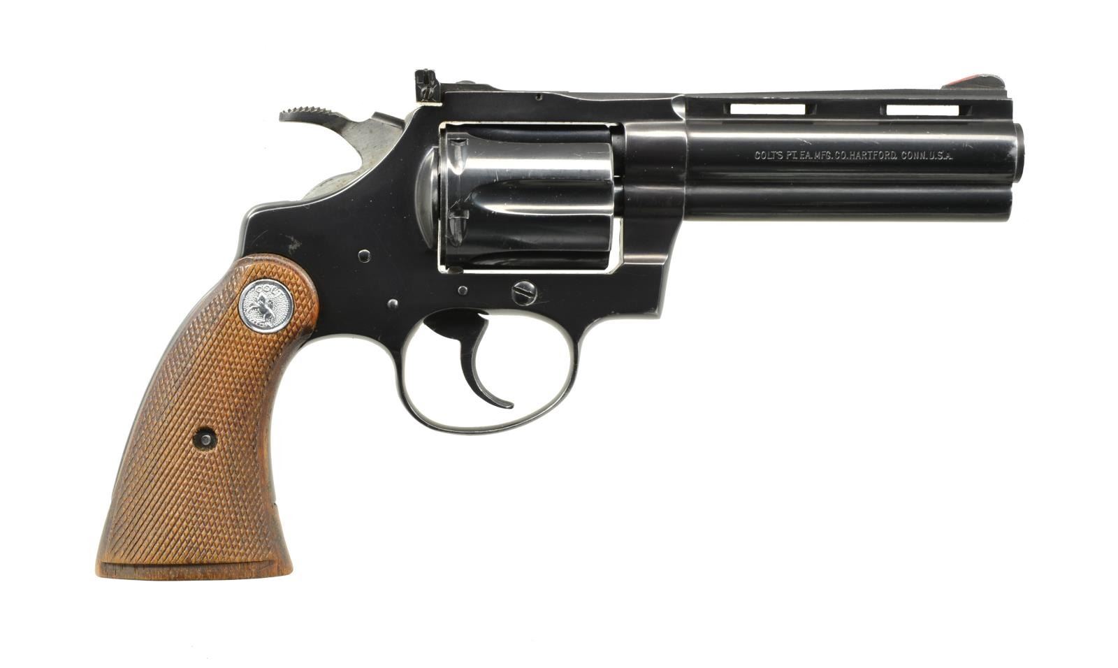 Cal. 22 LR. S# P02956. Bbl. 4" w/ VR & fully shrouded ejector. Serrated ramp front sight w/ added red paint & square notch adj. rear sight. 6 Shot fluted cyl. Blue finish. 2 Piece checkered walnut grips w/ Rampant Colt medallions. 1981 Mfg. CONDITION: 85% lightly worn blue showing muzzle & edge wear w/ scattered light scratches & marks. Grips show light wear. Smooth mechanics. Bore retains strong rifling. PROVENANCE: From the Frederic W. Thrane Collection. (20-2433/DS). MODERN. $700-1,000.