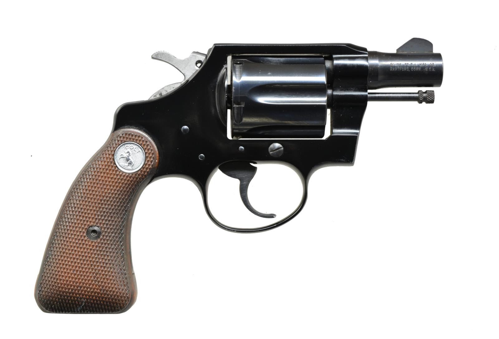 Cal. 38 Spl. S# 217453-LW. Bbl. 2" w/ serrated ramp front sight. 6 Shot fluted cyl. Black finished alloy action. 2 Piece checkered walnut grips w/ Rampant Colt medallions. 1966 Mfg. CONDITION: over 98% metal finish showing spots of freckling on polished sides of hammer. Very good grips. Bright near excellent bore. (20-3362/DS). CURIO. $500-800.