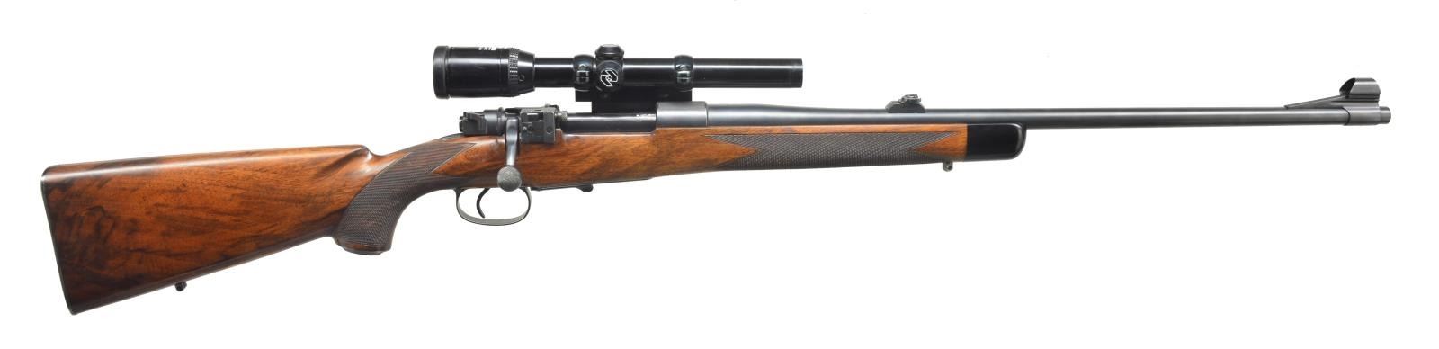Cal. 7x57. NSN. Bbl. 24". This rifle w/ the look & styling of Griffin & Howe appears to have been done by either Seymour Griffin after leaving Abercrombie & Fitch, or by his protégé, Norris Morgan (See other Morgan rifles in this auction). The stock of 1950s & early ‘60s styling shows some of Norris Morgan’s stylistic differences from Griffin & Howe w/ shadowline of cheekpiece ending about an inch from the point of comb & fairly deep forend. The bolt handle is also beveled on top edges, similar to many other Norris Morgan rifles. Rifle presently has 24" medium weight sporter bbl. fitted by Fred Richardson III, locally renowned gunsmith of Essex, Massachusetts & past proprietor of Netherfield firearms. His signature is on left rear of bbl. Bbl. is fitted w/ Lyman island base w/ flip up rear sight & silver bead front & sleeved on ramp. Model 98 lg. ring action has top of receiver stippled. Lyman 57 receiver sight is installed along w/ base for Griffin & Howe side mount. Bolt knob is checkered in 2 panels & an FN type bolt shroud w/ model 70 safety fitted. A commercial trigger has been fitted. Bottom metal w/ hinged floorplate retained by lever at rear has some light scroll engraving & geometric borders. Stock of lightly marbled & somewhat figured European walnut measures 13 5/8" over steel model 70 type buttplate. Stock features swept shadowline right hand cheekpiece, steel grip cap, ebony forend tip, & well cut point pattern checkering at grip & around forend. A vacant gold oval & sling eye are on toeline. Rifle is fitted w/ “Zeiss” Diavari-C 1.5-4.5 scope w/ duplex reticle in Griffin & Howe rings & slide. CONDITION: very good as refinished, most probably when new bbl. was installed. Metal parts retaining nearly all of a rust blue w/ some scattered marks. Engraving on bottom metal somewhat softened. Stock w/ old oil refinish w/ a few minor dents & scratches. Checkering lightly worn. Bore is excellent, action is smooth. Scope has some light marks in exterior lacquer, optically clear. (20-3978/MGM112). CURIO. $1,500-2,500.