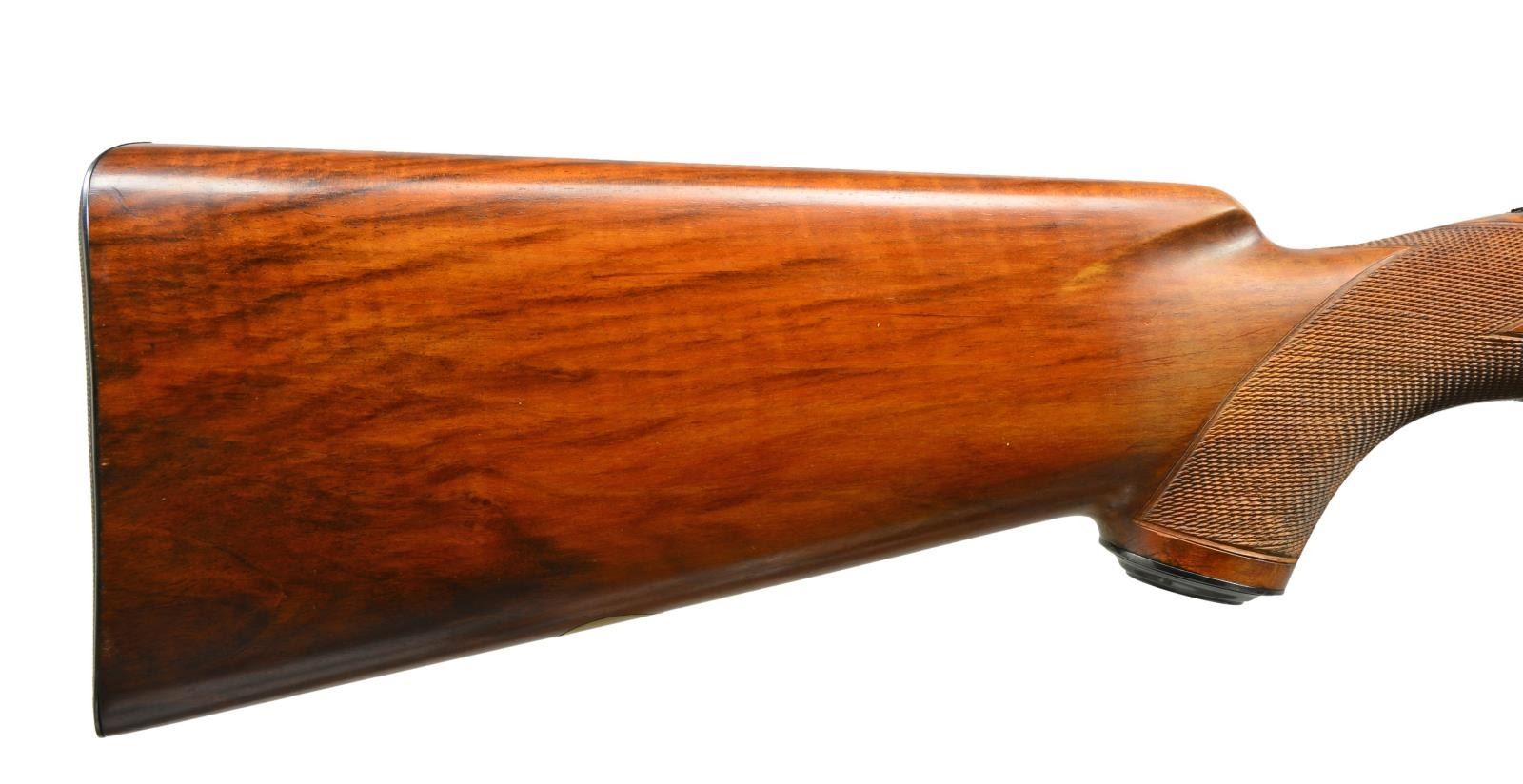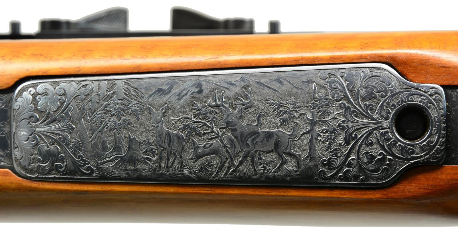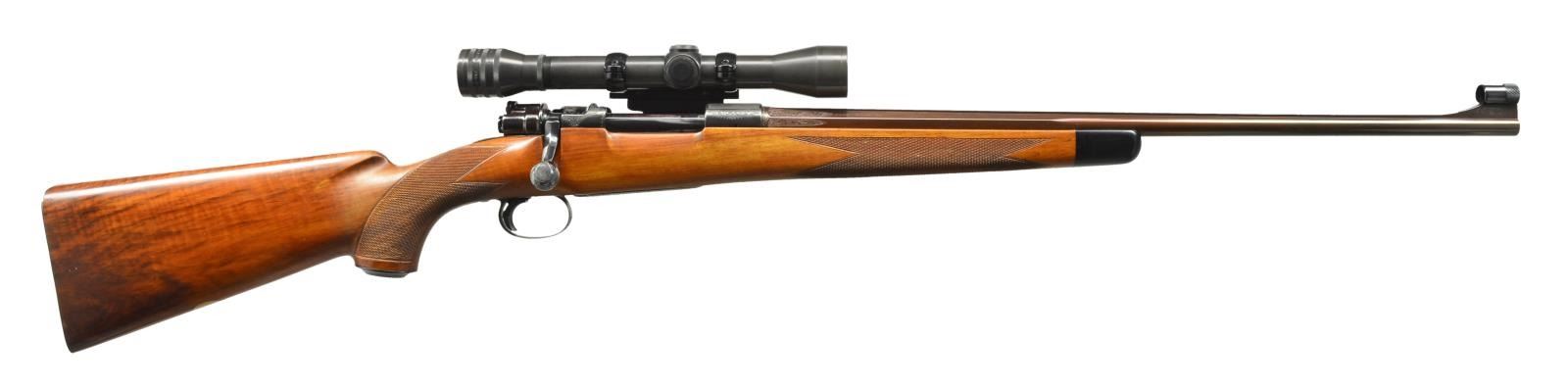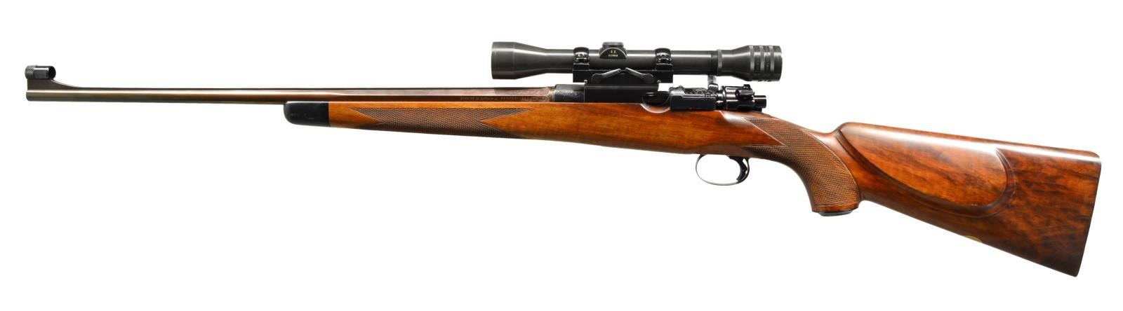 RIFLE W/ 1/3 OCTAGON RIBBED BBL., FINE FRENCH WALNUT STOCK & WELL DETAILED GAME SCENE ENGRAVING BY JOE FUGGER W/ SCOPE. Cal. 250-3000. S# Not Visible. Bbl. 22 1/2", 1/3 octagonal w/ integral matted rib is marked Boehler Antinit w/ cal. on top of left side breech section & "FR. WILH. HEYM" on right. There are nicely detailed tendrils of shaded scroll extending 2" down bbl. on flats. Intermediate length sm. ring model 98 Mauser w/ gas vents is fitted w/ G&H side bmount holding 4x Kollmorgan "Bearcub" scope in G&H rings & slide. Bolt has lowered diamond section handle w/ 4 checkered panels on pear shaped knob. Flag safety is gold inlaid "FIRE" & "SAFE". A canjar set trigger has been fitted. Standard bottom metal has been very finely engraved w/ exceptionally well cut & shaded scrolling acanthus surrounding game scenes on floorplate & trigger guard bow. Floorplate portrays lifelike scene of huge white tail buck w/ 2 does & alpine meadow w/ tall mountains in background. A fox is on trigger guard bow. Receiver is also engraved w/ sprays of scroll, receiver ring matted. Norris Morgan's notes indicate that all this fine engraving is by the revered Joe Fugger, Griffin & Howe's top engraver through the 50s, though no signature is found. Norris Morgan took special care in building the stock for this rifle & used a very fine piece of smoky marbled & nicely fiddle figured French walnut w/ perfect grain structure through grip into forend. Lines & shaping are clean & precise & nearly equal to that of Griffin & Howe's best craftsmen. Stock measures 13 5/8" over checkered steel buttplate & features swept right hand shadowline cheekpiece, ebony forend tip, engraved steel grip cap, very well cut classic point pattern checkering w/ mullered borders at grip & around forend & a gold oval on toeline. UNATTACHED ACCESSORIES: Norris Morgan's inventory sheet for this rifle. CONDITION: excellent. Metal parts retaining essentially all their custom finishes w/ the exception of loss of blue on bolt stop. Immersion blued antimit bbl. is a purple hue. Stock has only a few very light handling marks in its original hand rubbed oil finish. Bore is excellent, action is smooth. Scope is very fine, optics a bit hazy. (20-1671/MGM54). CURIO. $3,000-6,000.