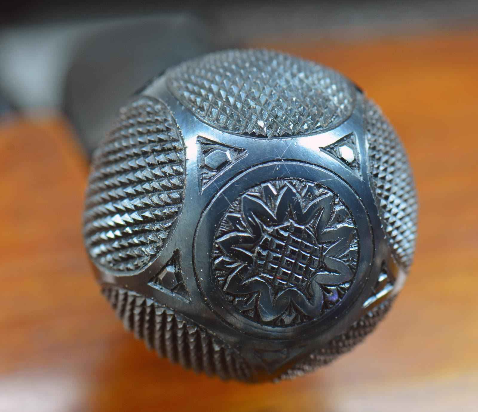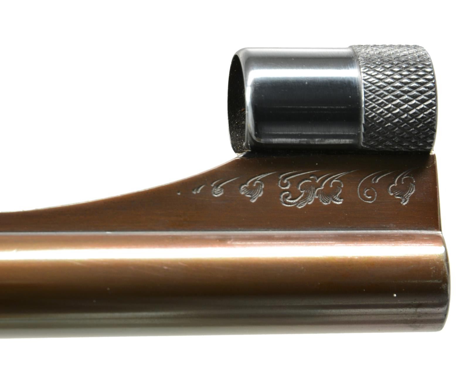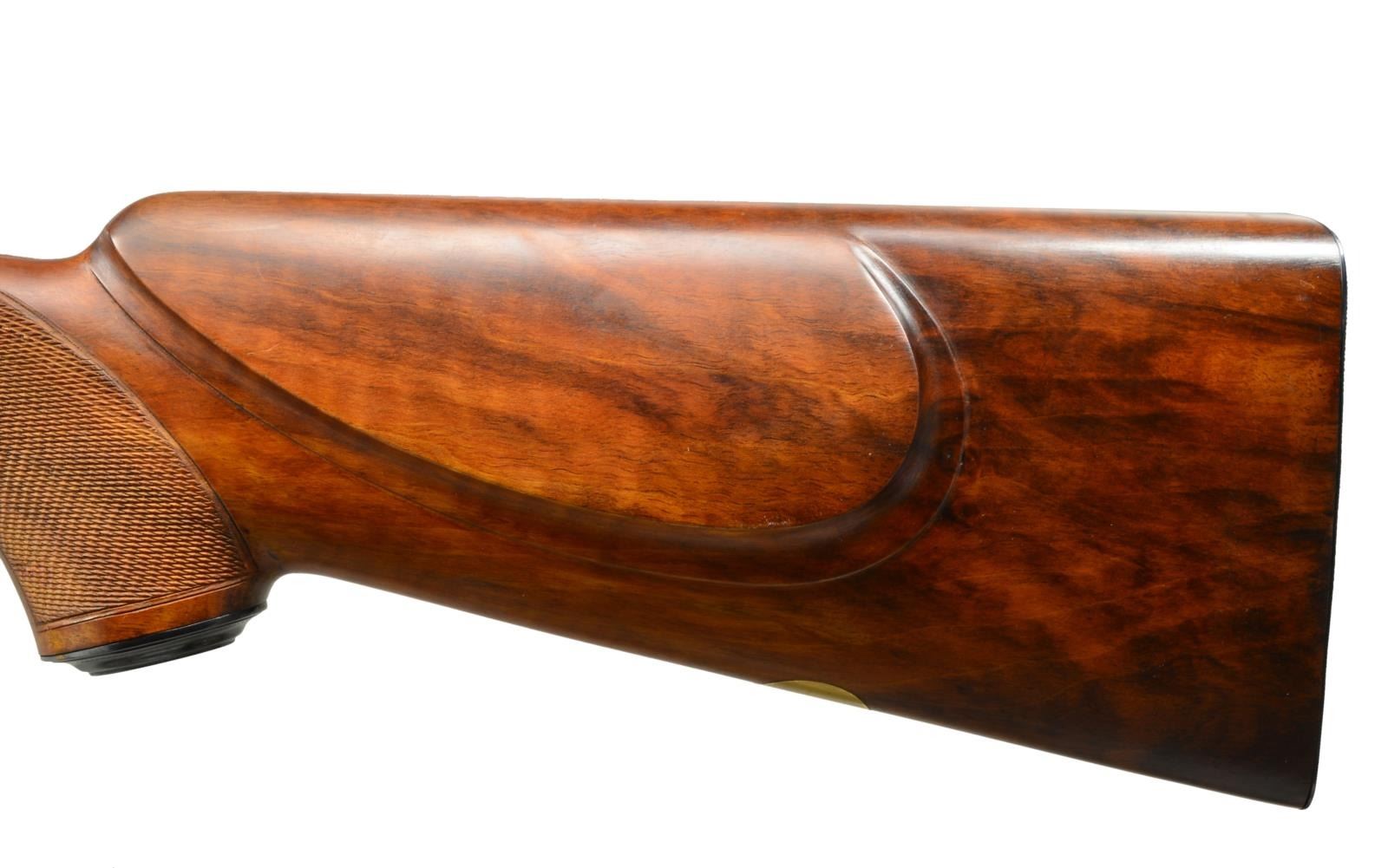 RIFLE W/ 1/3 OCTAGON RIBBED BBL., FINE FRENCH WALNUT STOCK & WELL DETAILED GAME SCENE ENGRAVING BY JOE FUGGER W/ SCOPE. Cal. 250-3000. S# Not Visible. Bbl. 22 1/2", 1/3 octagonal w/ integral matted rib is marked Boehler Antinit w/ cal. on top of left side breech section & "FR. WILH. HEYM" on right. There are nicely detailed tendrils of shaded scroll extending 2" down bbl. on flats. Intermediate length sm. ring model 98 Mauser w/ gas vents is fitted w/ G&H side bmount holding 4x Kollmorgan "Bearcub" scope in G&H rings & slide. Bolt has lowered diamond section handle w/ 4 checkered panels on pear shaped knob. Flag safety is gold inlaid "FIRE" & "SAFE". A canjar set trigger has been fitted. Standard bottom metal has been very finely engraved w/ exceptionally well cut & shaded scrolling acanthus surrounding game scenes on floorplate & trigger guard bow. Floorplate portrays lifelike scene of huge white tail buck w/ 2 does & alpine meadow w/ tall mountains in background. A fox is on trigger guard bow. Receiver is also engraved w/ sprays of scroll, receiver ring matted. Norris Morgan's notes indicate that all this fine engraving is by the revered Joe Fugger, Griffin & Howe's top engraver through the 50s, though no signature is found. Norris Morgan took special care in building the stock for this rifle & used a very fine piece of smoky marbled & nicely fiddle figured French walnut w/ perfect grain structure through grip into forend. Lines & shaping are clean & precise & nearly equal to that of Griffin & Howe's best craftsmen. Stock measures 13 5/8" over checkered steel buttplate & features swept right hand shadowline cheekpiece, ebony forend tip, engraved steel grip cap, very well cut classic point pattern checkering w/ mullered borders at grip & around forend & a gold oval on toeline. UNATTACHED ACCESSORIES: Norris Morgan's inventory sheet for this rifle. CONDITION: excellent. Metal parts retaining essentially all their custom finishes w/ the exception of loss of blue on bolt stop. Immersion blued antimit bbl. is a purple hue. Stock has only a few very light handling marks in its original hand rubbed oil finish. Bore is excellent, action is smooth. Scope is very fine, optics a bit hazy. (20-1671/MGM54). CURIO. $3,000-6,000.