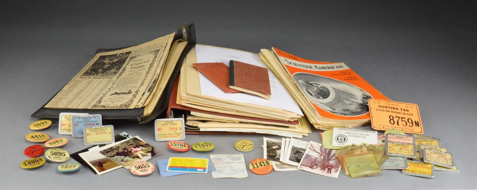 & NOTES INCLUDING SEYMOUR GRIFFIN ITEMS, GRIFFIN & HOWE PAPERWORK & "ILLUMINTOR" DRAFTS. Items of note include Seymour Griffin's personal account of the history of Griffin & Howe & other correspondence regarding his leaving of Griffin & Howe. There is also a large number of state of Connecticut resident hunting & fishing licenses from the '20s through the '60s, both pin-on buttons are metal cased, family photographs, etc. CONDITION: most items appear to be in good condition. (02-13885/MGM60). $500-800.