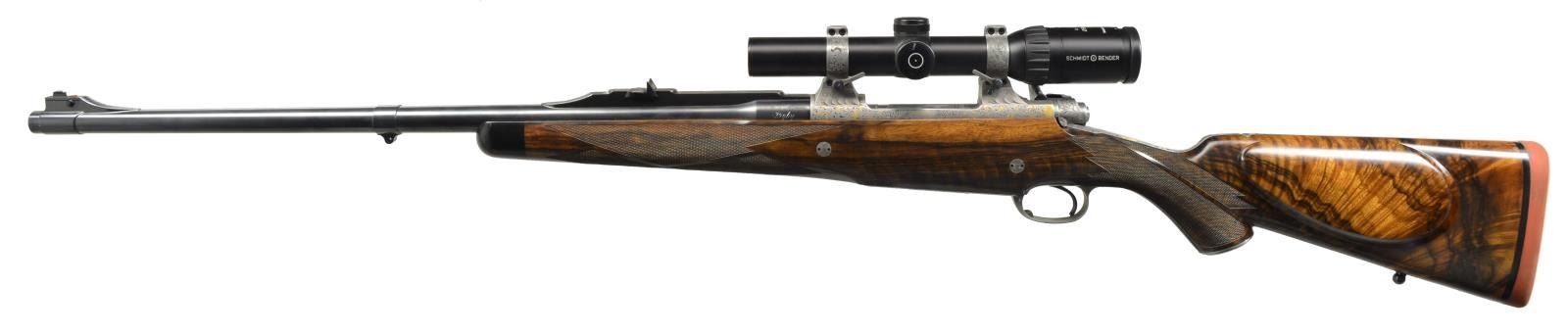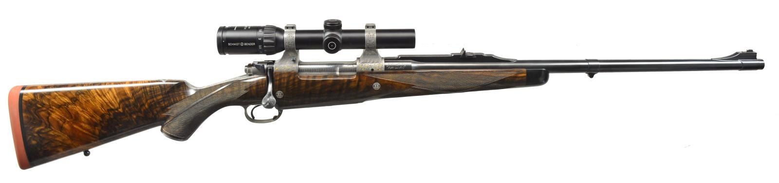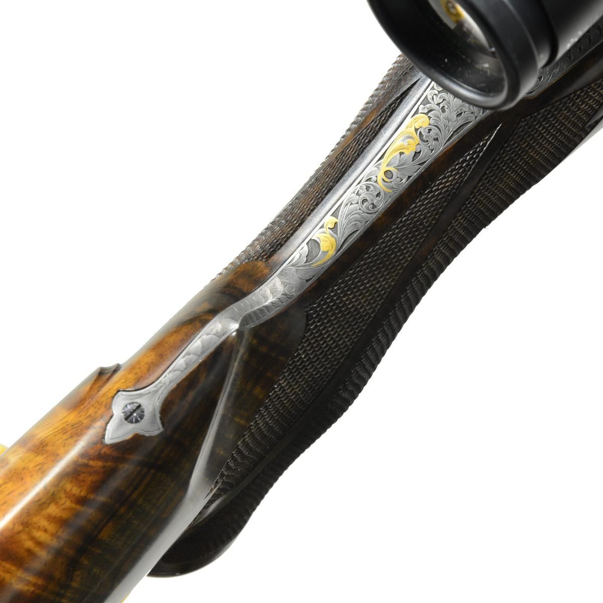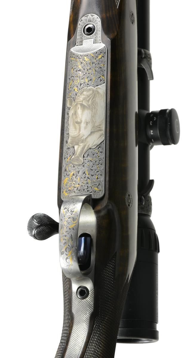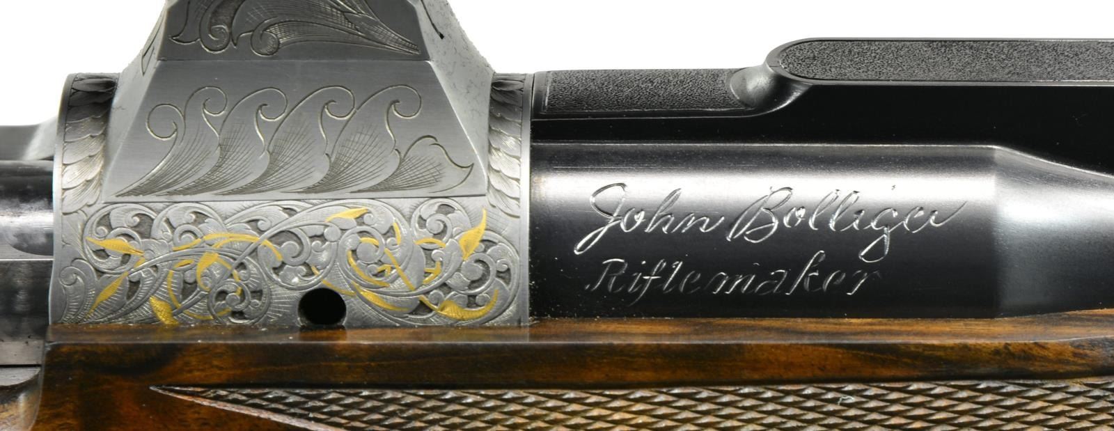 BOLLIGER W/ EXQUISITE GOLD INLAY & BULINO ENGRAVING BY THIERRY DUGUET W/ SCOPE. Cal. 416 Rigby. S# G31680. Bbl. 24". This superb creation by two of the most highly regarded craftsmen of the present day started w/ a new model 70 "classic" action. A nicely detailed many stepped matted quarter rib holding 1 standing 1 folding leaf express rear sight was fitted to 24" tapered rnd. bbl. Gold bead front sight w/ flip up night bead is longitudinally dovetailed into sleeved on short ramp. A sleeved on sling eye is also fitted. Rear portion of bbl is engraved w/ "caliber" on left & John Bollinger's signature & "riflemaker" on right. French gray action has been fitted w/ custom scope bases. Top strap has been extended & climbs over comb, in H&H fashion terminating in a fleur-de-lis. Bolt knob has been checkered in four teardrop panels w/ square bottom panel. Trigger & safety lever are fire blued. Bottom metal has drop box magazine w/ hinged floorplate w/ release button in trigger guard bow. Rear tang has been checkered & extends to steel grip cap. Engraving on action & bottom metal is of the highest order, consisting of a background of extremely well cut & finely shaded varying sized classic scroll interspersed w/ sprigs & tendrils of gold inlaid foliage. Floorplate has raised & silver inlaid quartering portrait of white rhino w/ superb bulino details. Bottom of grip cap has another fine portrait of lioness w/ 2 cubs. This fine work is by Thierry Duguet of Charlottesville, VA. Stock by John Bolliger is of an exceptional exhibition grade piece of European walnut w/ spectacular crotch figure & exquisite dark marbling through butt & relatively straight grain running from grip into forend. Stock measures 14" over red Decelerator pad & features classic shadowline right hand cheekpiece, 2 recoil bolts through stock, black ebony forend tip, & exceptionally well cut point pattern checkering at grip & forend which has sections of pattern separated by ribbons. A Schmidt & Bender 1.1-4x "Zenith" scope w/ 3 post & crosshair reticle is in custom rings which are engraved matching action. CONDITION: exceptionally fine, very close to "as new", possibly unfired w/ only 1 or 2 of the faintest handling & assembly marks in all wood & metal finishes. Mechanically crisp. Scope is also near new & optically clear. PROVENANCE: From the Frederic W. Thrane Collection. (20-2447/MGM36). MODERN. $7,000-12,000.