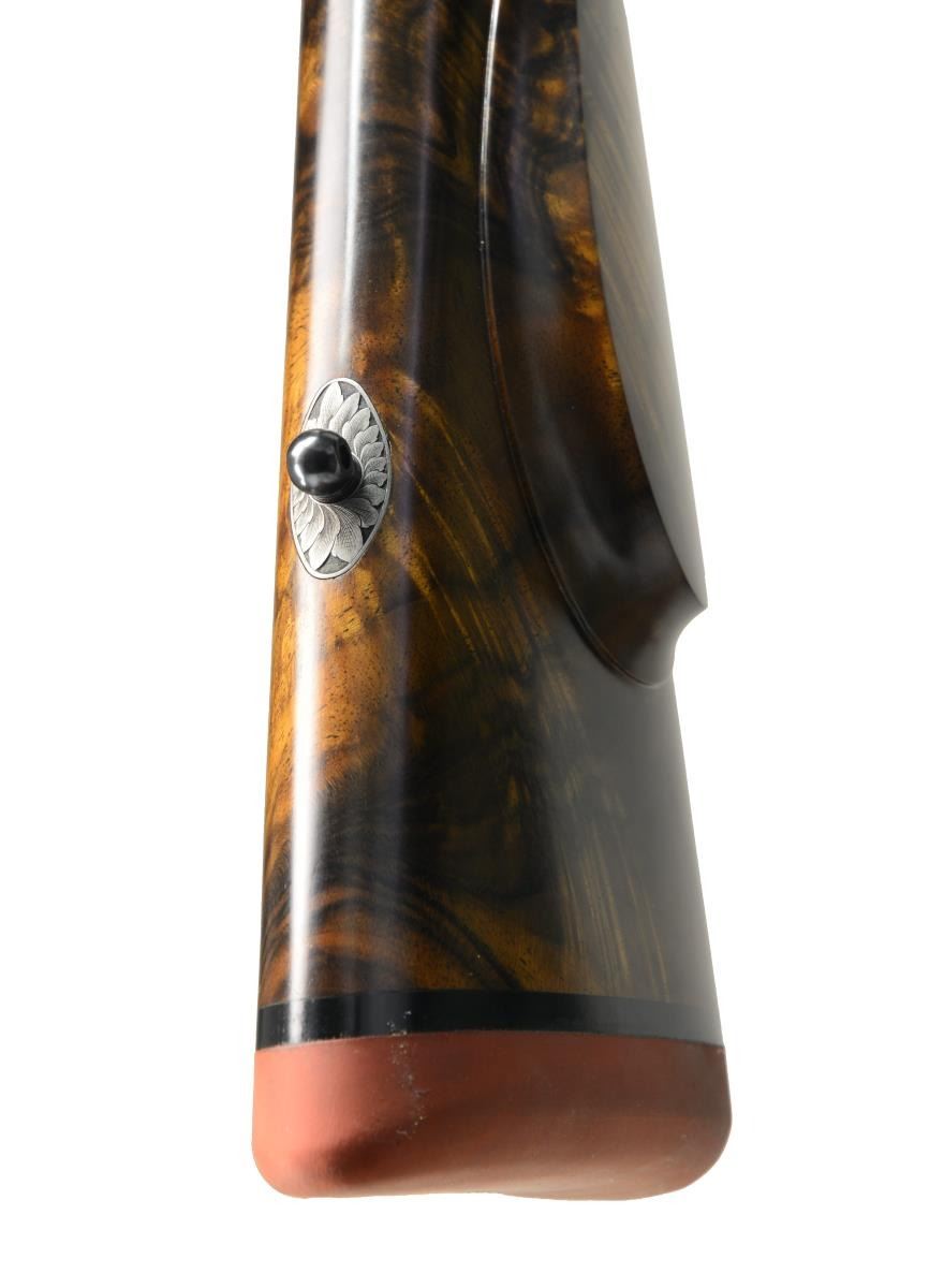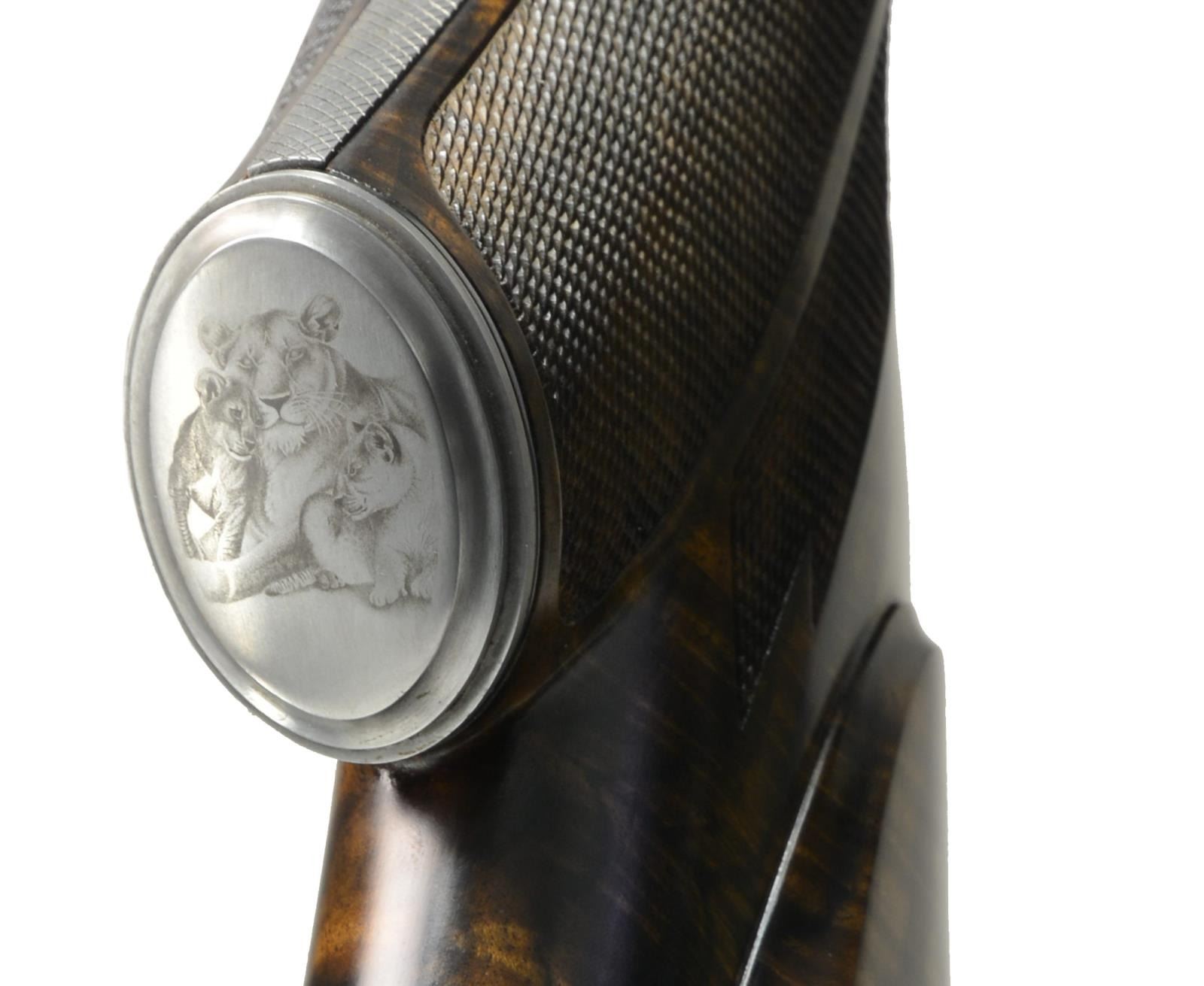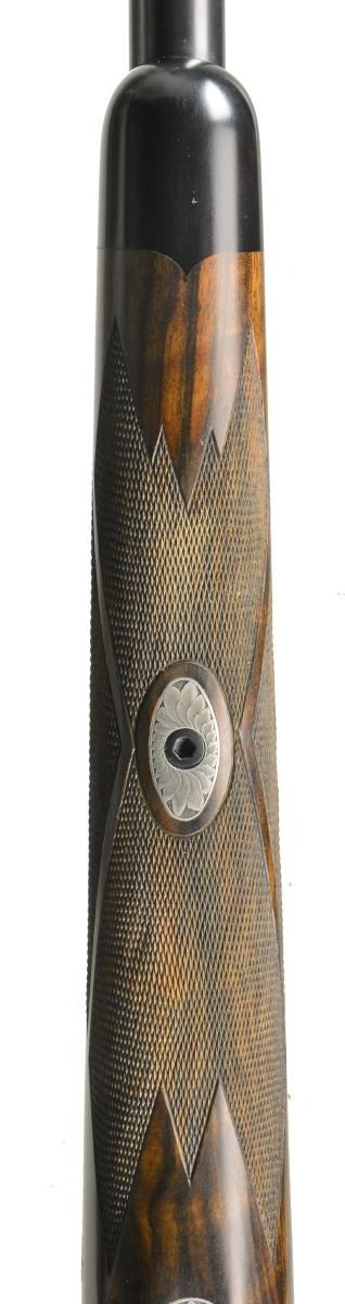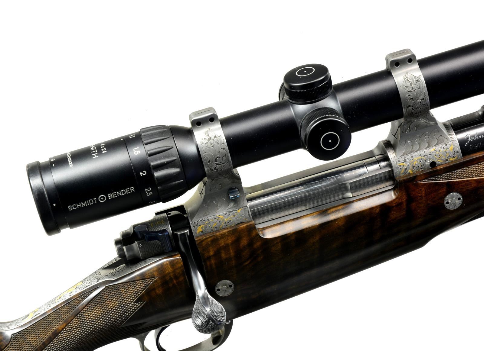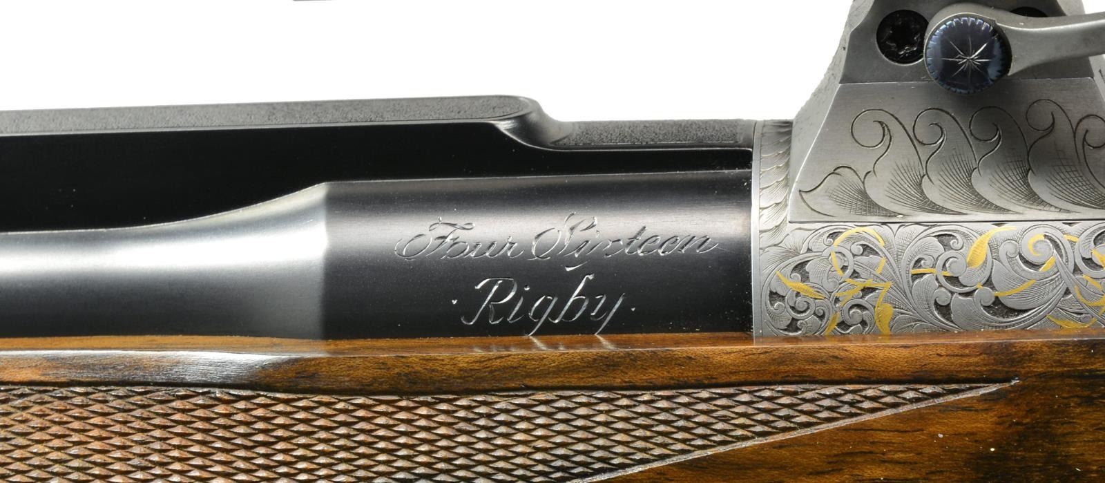 BOLLIGER W/ EXQUISITE GOLD INLAY & BULINO ENGRAVING BY THIERRY DUGUET W/ SCOPE. Cal. 416 Rigby. S# G31680. Bbl. 24". This superb creation by two of the most highly regarded craftsmen of the present day started w/ a new model 70 "classic" action. A nicely detailed many stepped matted quarter rib holding 1 standing 1 folding leaf express rear sight was fitted to 24" tapered rnd. bbl. Gold bead front sight w/ flip up night bead is longitudinally dovetailed into sleeved on short ramp. A sleeved on sling eye is also fitted. Rear portion of bbl is engraved w/ "caliber" on left & John Bollinger's signature & "riflemaker" on right. French gray action has been fitted w/ custom scope bases. Top strap has been extended & climbs over comb, in H&H fashion terminating in a fleur-de-lis. Bolt knob has been checkered in four teardrop panels w/ square bottom panel. Trigger & safety lever are fire blued. Bottom metal has drop box magazine w/ hinged floorplate w/ release button in trigger guard bow. Rear tang has been checkered & extends to steel grip cap. Engraving on action & bottom metal is of the highest order, consisting of a background of extremely well cut & finely shaded varying sized classic scroll interspersed w/ sprigs & tendrils of gold inlaid foliage. Floorplate has raised & silver inlaid quartering portrait of white rhino w/ superb bulino details. Bottom of grip cap has another fine portrait of lioness w/ 2 cubs. This fine work is by Thierry Duguet of Charlottesville, VA. Stock by John Bolliger is of an exceptional exhibition grade piece of European walnut w/ spectacular crotch figure & exquisite dark marbling through butt & relatively straight grain running from grip into forend. Stock measures 14" over red Decelerator pad & features classic shadowline right hand cheekpiece, 2 recoil bolts through stock, black ebony forend tip, & exceptionally well cut point pattern checkering at grip & forend which has sections of pattern separated by ribbons. A Schmidt & Bender 1.1-4x "Zenith" scope w/ 3 post & crosshair reticle is in custom rings which are engraved matching action. CONDITION: exceptionally fine, very close to "as new", possibly unfired w/ only 1 or 2 of the faintest handling & assembly marks in all wood & metal finishes. Mechanically crisp. Scope is also near new & optically clear. PROVENANCE: From the Frederic W. Thrane Collection. (20-2447/MGM36). MODERN. $7,000-12,000.