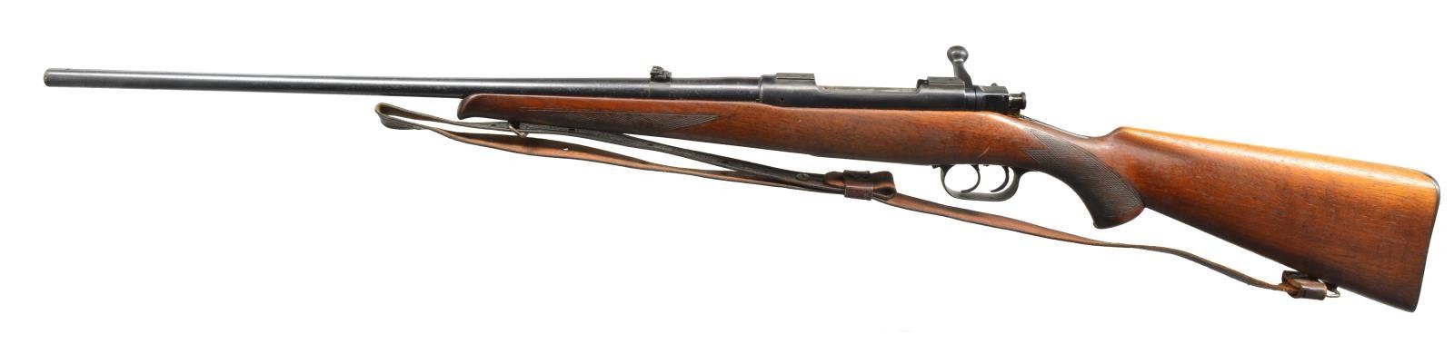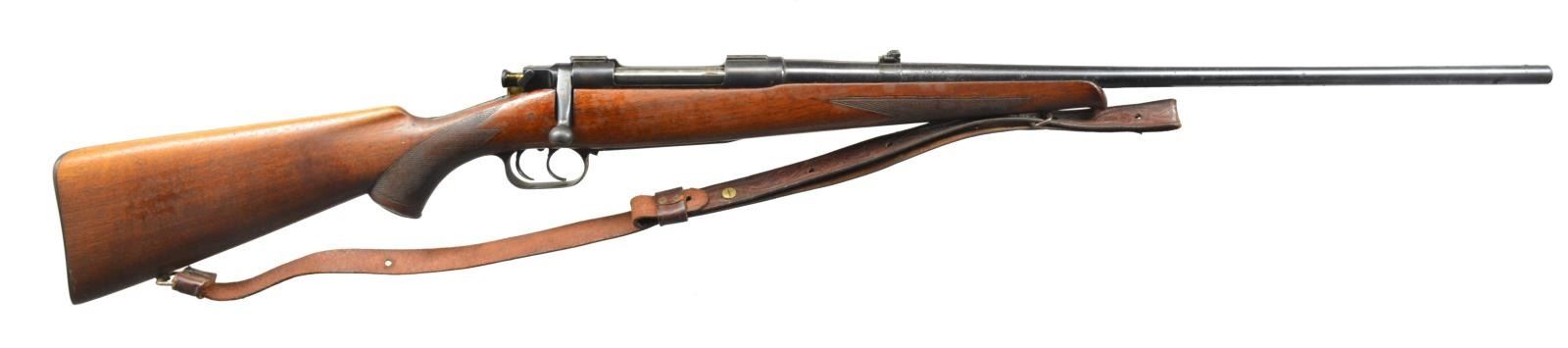Cal. 256 Newton. S# 3540. Bbl. 24" of light sporter weight. Bbl. is marked “NEWTON ARMS CO., INC. / BUFFALO, N.Y. / 256 NEWTON”. Front sight is removed. Replacement folding leaf rear sight. Action features 2 rows of 3 locking lugs, Mauser style long extractor, knurled cocking piece, checkered bolt handle, rotating safety on bolt shroud & dbl. set triggers. Stippled front & rear receiver rings are drilled & tapped for scope w/ plug screws. Schnabel tipped straight comb walnut Classis style sporter stock w/ hand checkering, steel grip cap & checkered buttplate. Hand tooled leather sling on original swivels. CONDITION: 90% blue showing surface corrosion. Stock has moderately worn finish & checkering showing some handling marks. Worn bore w/ dark grooves. (20-2734/DS). CURIO. $700-1,000.