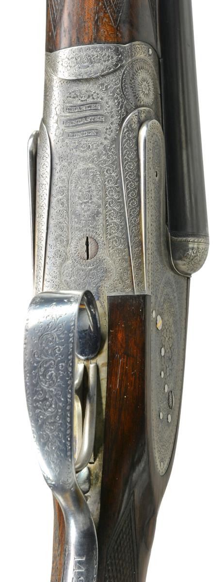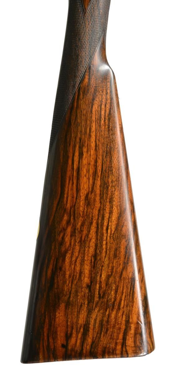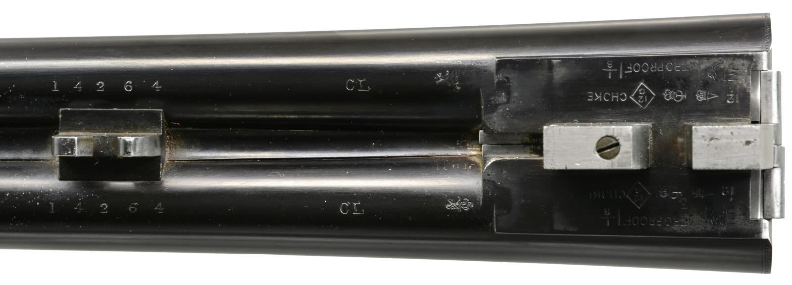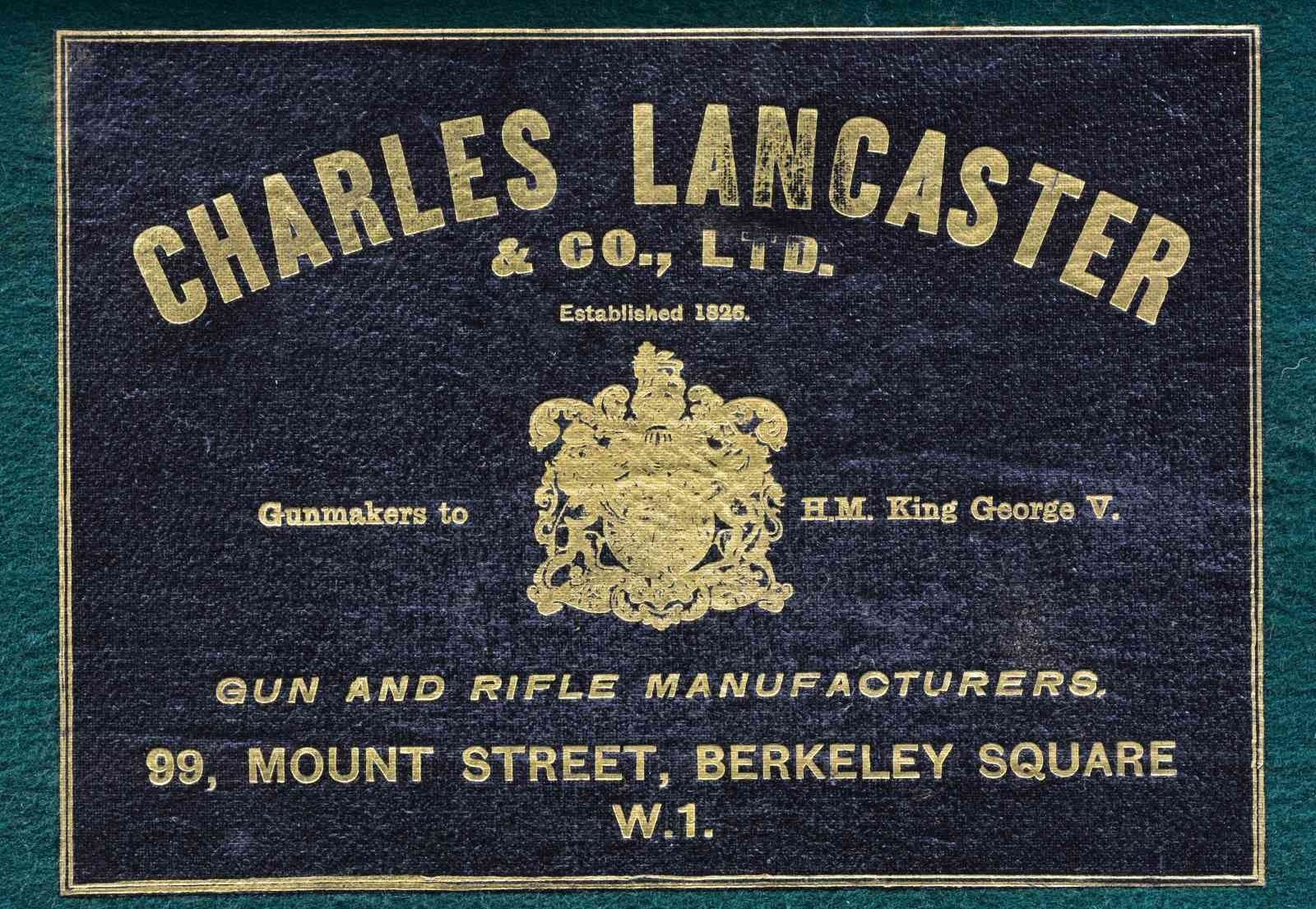 GAME GUN W/ CASE & ACCESSORIES, INCLUDING A LANCASTER CARTRIDGE MAGAZINE. Cal. 12 Ga. S# 14264. (1924). Bbls. 29" Chopperlump, are engraved "Charles Lancaster, 99 Mount Street Berkeley Square, London." on slightly swamped narrow game rib. Bbl. flats are stamped w/ London nitro proofs for 2 1/2" chambers. Case hardened sidelock action is stocked to the fences & features automatic safety (safe inlaid in gold), bushed strikers & double triggers. Action is very nicely filed w/ traditional beads & fillets around locks & on to bottom. Action is engraved w/ near full coverage very cleanly & delicately cut traditional rose & scroll. "Charles Lancaster" is on each lockplate & also in coiled ribbon device on bottom of action over "London". Trigger guard has large open scroll on bow. S# is on tang. Very nicely streaked & lightly figured European walnut straight grip buttstock, measures 14 7/8" over checkered wood butt. Styling is traditional w/ typical Lancaster rounded drop points, flat top point pattern checkering at grip & a gold oval engraved "E. L. M." on toe line. Matching splinter ejector forend has Anson release. MEASUREMENTS: BARRELS: Bore diameter: R 728 L 729. Restriction: R .009 (IC) L .018 (MOD). Min. Wall Thickness: R .025 L .022 STOCK: LOP: 14 7/8". DAC: 1 1/2". DAH: 2+". Cast: 5/8" off. WEIGHT: 6 lbs. 8 oz. UNATTACHED ACCESSORIES: what appears to be original leather case w/ brass corners & central medallion engraved "E. L. Mather COBHAM Surrey" & is embossed "ELM" on top. Interior is lined in green cloth & has gold embossed black leather Lancaster Berkeley Square label in lid. Case contains pair of Lancaster marked snapcaps & rnd. oil bottle. Unmarked accessories include ebony handled turnscrew, Dixon shot measure, the handle of a chamber brush, striker key & 2 piece cleaning rod w/ mops & brush. Also included is a leather trunk type cartridge magazine for 200 12 bore cartridges. Top of magazine is embossed "H.P.D.". A New Bond Street paper Lancaster label is in lid. CONDITION: very fine, partially refinished. Bbls. retaining nearly all of a good quality reblack. Action retains approx. 30% original case hardening color, mostly silvered on bottom & on sharp edges from normal hand wear. Lock plates retain considerably more of their color w/ left plate approaching 90% & right plate at around 60%. Top lever & trigger guard appear to have been reblacked as engraving is slightly softened. There is some subsequent silvering on thumbpiece & sides of trigger guard bow. Stocks have been lightly refinished & have a number of subsequent marks both light & heavy. Checkering does not appear to have been recut & is somewhat worn. Bores are very fine to excellent w/ some minor striations & no evidence of any dents or repairs. Action is tight. Left bbl. is on face, right bbl. shows a glimmer of light. Ejectors very strong & in time. Case leather is dark & has many old scuffs & marks. Straps are missing, original handle is good. Interior cloth is very good w/ some compressions & rubs from bbls. & accessories. Label is very fine w/ single 1/2" rub from contact w/ action. Partitions are good. Magazine case leather is also rubbed on edges, beginning to separate at rear. Interior lid is lined in green cloth which is fine. Label somewhat foxed & oil soaked. Straps & handle are good. A fine fast handling London "best". (20-1687/MGM). CURIO. $6,000-10,000.