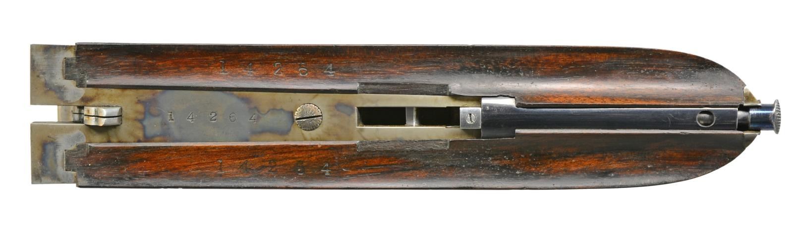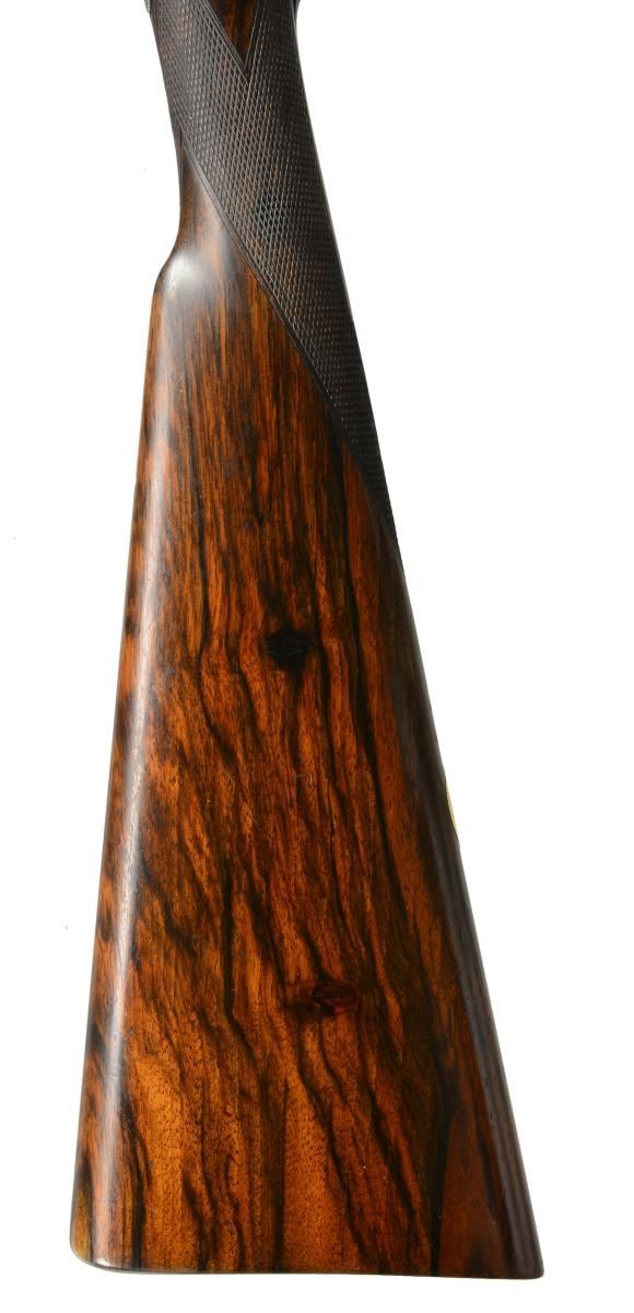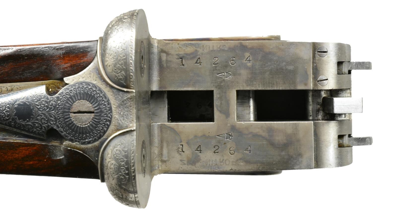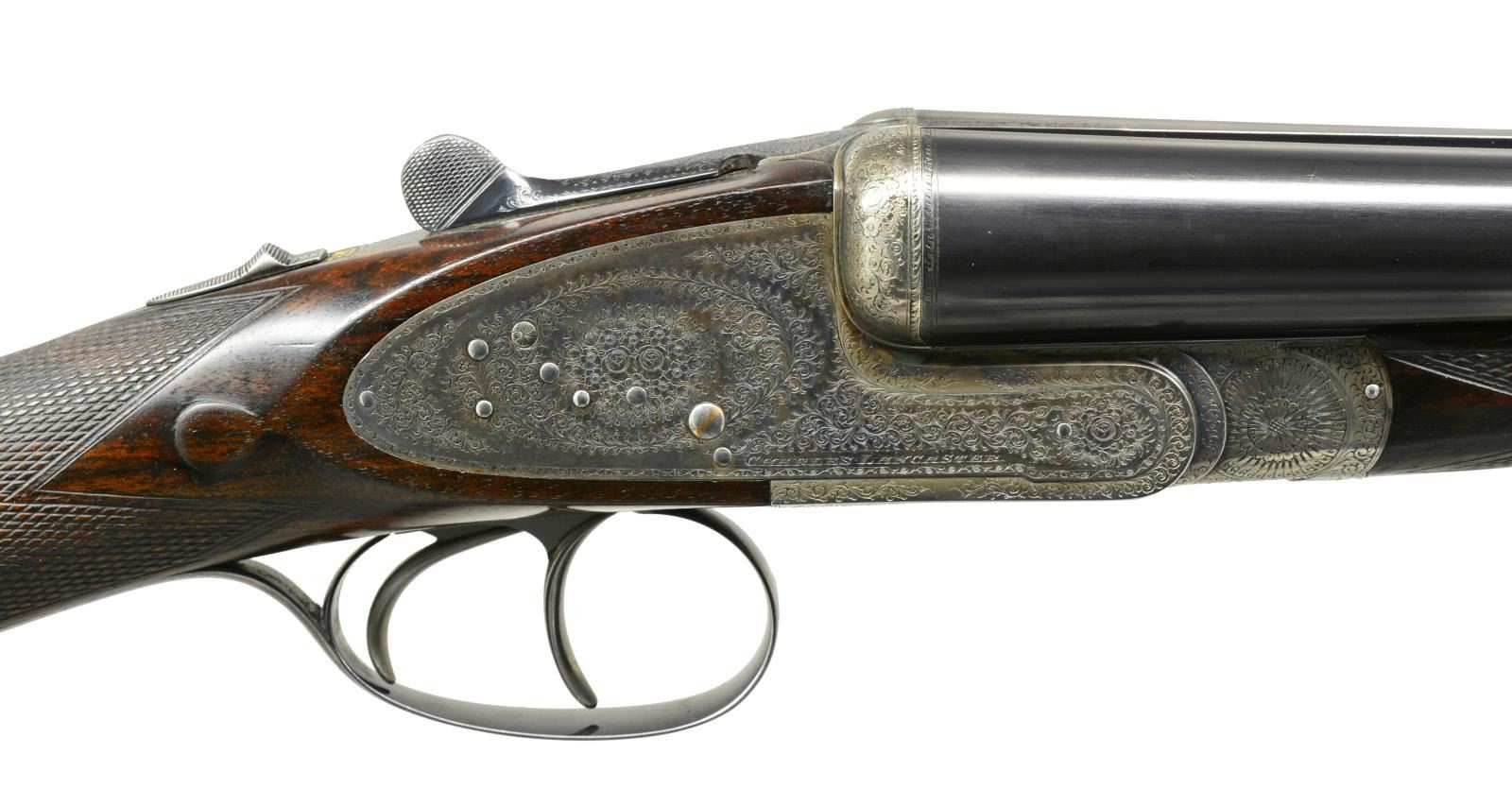 GAME GUN W/ CASE & ACCESSORIES, INCLUDING A LANCASTER CARTRIDGE MAGAZINE. Cal. 12 Ga. S# 14264. (1924). Bbls. 29" Chopperlump, are engraved "Charles Lancaster, 99 Mount Street Berkeley Square, London." on slightly swamped narrow game rib. Bbl. flats are stamped w/ London nitro proofs for 2 1/2" chambers. Case hardened sidelock action is stocked to the fences & features automatic safety (safe inlaid in gold), bushed strikers & double triggers. Action is very nicely filed w/ traditional beads & fillets around locks & on to bottom. Action is engraved w/ near full coverage very cleanly & delicately cut traditional rose & scroll. "Charles Lancaster" is on each lockplate & also in coiled ribbon device on bottom of action over "London". Trigger guard has large open scroll on bow. S# is on tang. Very nicely streaked & lightly figured European walnut straight grip buttstock, measures 14 7/8" over checkered wood butt. Styling is traditional w/ typical Lancaster rounded drop points, flat top point pattern checkering at grip & a gold oval engraved "E. L. M." on toe line. Matching splinter ejector forend has Anson release. MEASUREMENTS: BARRELS: Bore diameter: R 728 L 729. Restriction: R .009 (IC) L .018 (MOD). Min. Wall Thickness: R .025 L .022 STOCK: LOP: 14 7/8". DAC: 1 1/2". DAH: 2+". Cast: 5/8" off. WEIGHT: 6 lbs. 8 oz. UNATTACHED ACCESSORIES: what appears to be original leather case w/ brass corners & central medallion engraved "E. L. Mather COBHAM Surrey" & is embossed "ELM" on top. Interior is lined in green cloth & has gold embossed black leather Lancaster Berkeley Square label in lid. Case contains pair of Lancaster marked snapcaps & rnd. oil bottle. Unmarked accessories include ebony handled turnscrew, Dixon shot measure, the handle of a chamber brush, striker key & 2 piece cleaning rod w/ mops & brush. Also included is a leather trunk type cartridge magazine for 200 12 bore cartridges. Top of magazine is embossed "H.P.D.". A New Bond Street paper Lancaster label is in lid. CONDITION: very fine, partially refinished. Bbls. retaining nearly all of a good quality reblack. Action retains approx. 30% original case hardening color, mostly silvered on bottom & on sharp edges from normal hand wear. Lock plates retain considerably more of their color w/ left plate approaching 90% & right plate at around 60%. Top lever & trigger guard appear to have been reblacked as engraving is slightly softened. There is some subsequent silvering on thumbpiece & sides of trigger guard bow. Stocks have been lightly refinished & have a number of subsequent marks both light & heavy. Checkering does not appear to have been recut & is somewhat worn. Bores are very fine to excellent w/ some minor striations & no evidence of any dents or repairs. Action is tight. Left bbl. is on face, right bbl. shows a glimmer of light. Ejectors very strong & in time. Case leather is dark & has many old scuffs & marks. Straps are missing, original handle is good. Interior cloth is very good w/ some compressions & rubs from bbls. & accessories. Label is very fine w/ single 1/2" rub from contact w/ action. Partitions are good. Magazine case leather is also rubbed on edges, beginning to separate at rear. Interior lid is lined in green cloth which is fine. Label somewhat foxed & oil soaked. Straps & handle are good. A fine fast handling London "best". (20-1687/MGM). CURIO. $6,000-10,000.