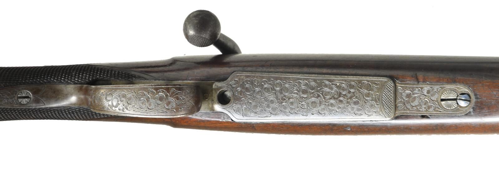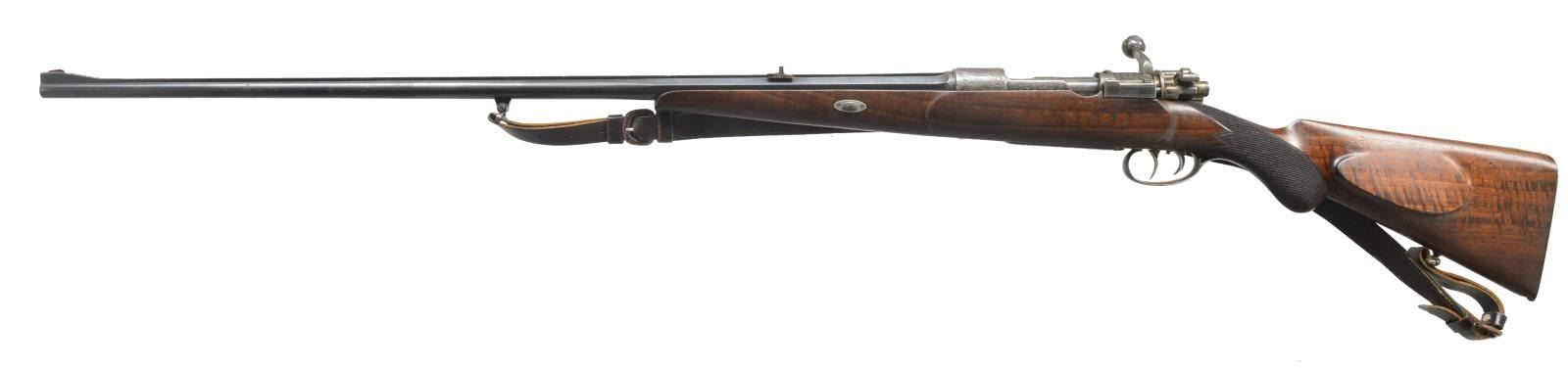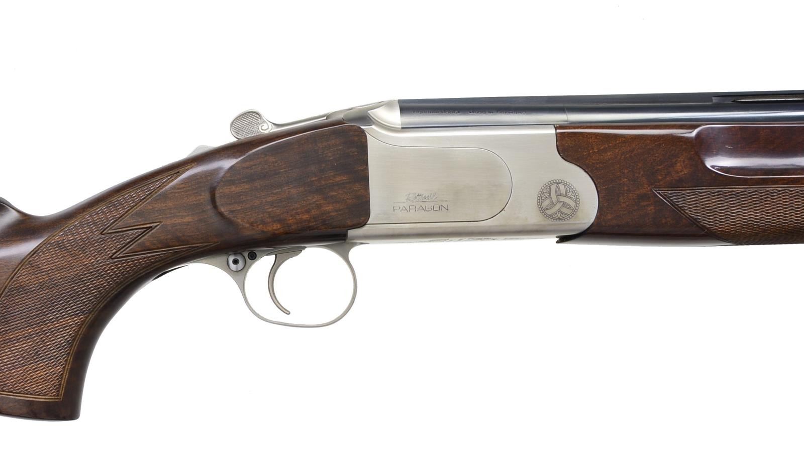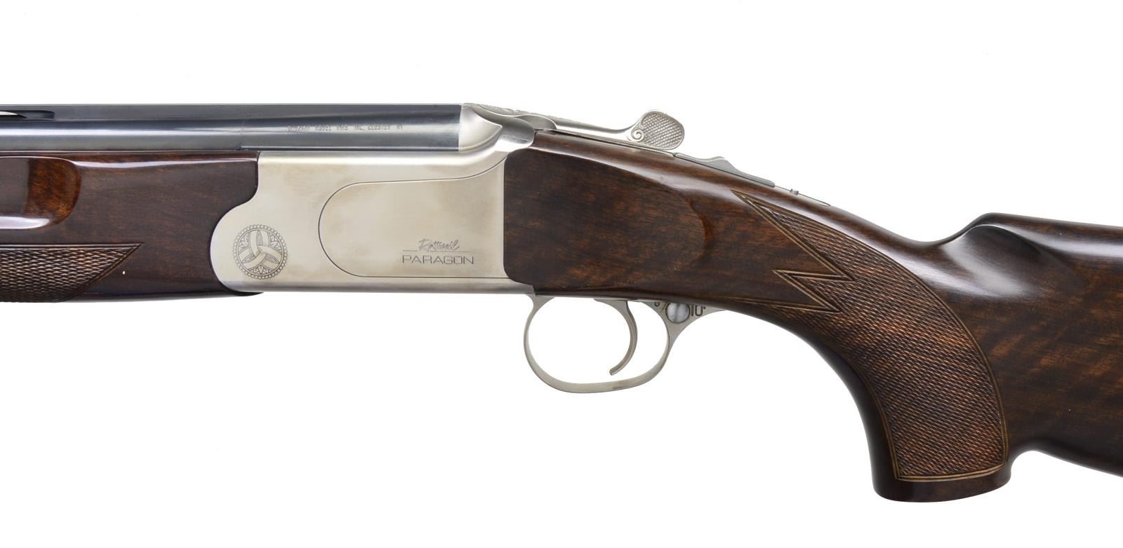 EJECTOR SYSTEM. Cal. 12 Ga. S# S50798. Designed to compete w/ Perazzi & Kriegkoff, these well-made shotguns were only made for a few years. This gun has 30" bbls. w/ broad ventilated top rib & ventilated side ribs fitted w/ interchangable chokes. Rottweil info importer's marks & "Made in Germany" are on monobloc. Bbls. which will fit any "Paragon" are numbered L11641 & are fitted w/ unique gas ejector system w/ ejector triggered by pressure from fired shell. Coin finished action w/ non automatic safety features removable trigger group & single selective trigger. Action is marked "Rottweil Paragon" on both sides, bottom w/ "Dynamit Nobel" & "Germany" surrounded by scroll engraving. Extreme pistol grip buttstock of dark fiddle figured European walnut measures 14 3/8" over thin sporting clays type pad. Point pattern checkering is at grip. Matching beavertail 1 piece forend has Anson type release. MEASUREMENTS: STOCK: LOP: 14 3/8". DAC: 1 3/8". DAH: 2 5/16". Cast: approx. 1/2" off. WEIGHT: 8 lbs. 14 oz. UNATTACHED ACCESSORIES: gun is housed in black ABS "Paragon" marked case lined in purple velvet containing 6 choke tubes, stock removal tool, wrench & instruction booklet. Also included are consignor's notes. CONDITION: very fine w/ evidence of fairly limited use w/ only a few minor handling & assembly marks in all factory finishes. Mechanically fine, ejectors not tested for functioning. Bores w/ scattered pitting toward breech ends. (20-2395/MGM87). MODERN. $2,500-4,500.