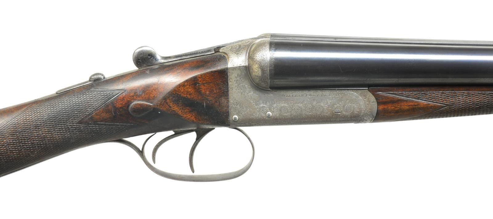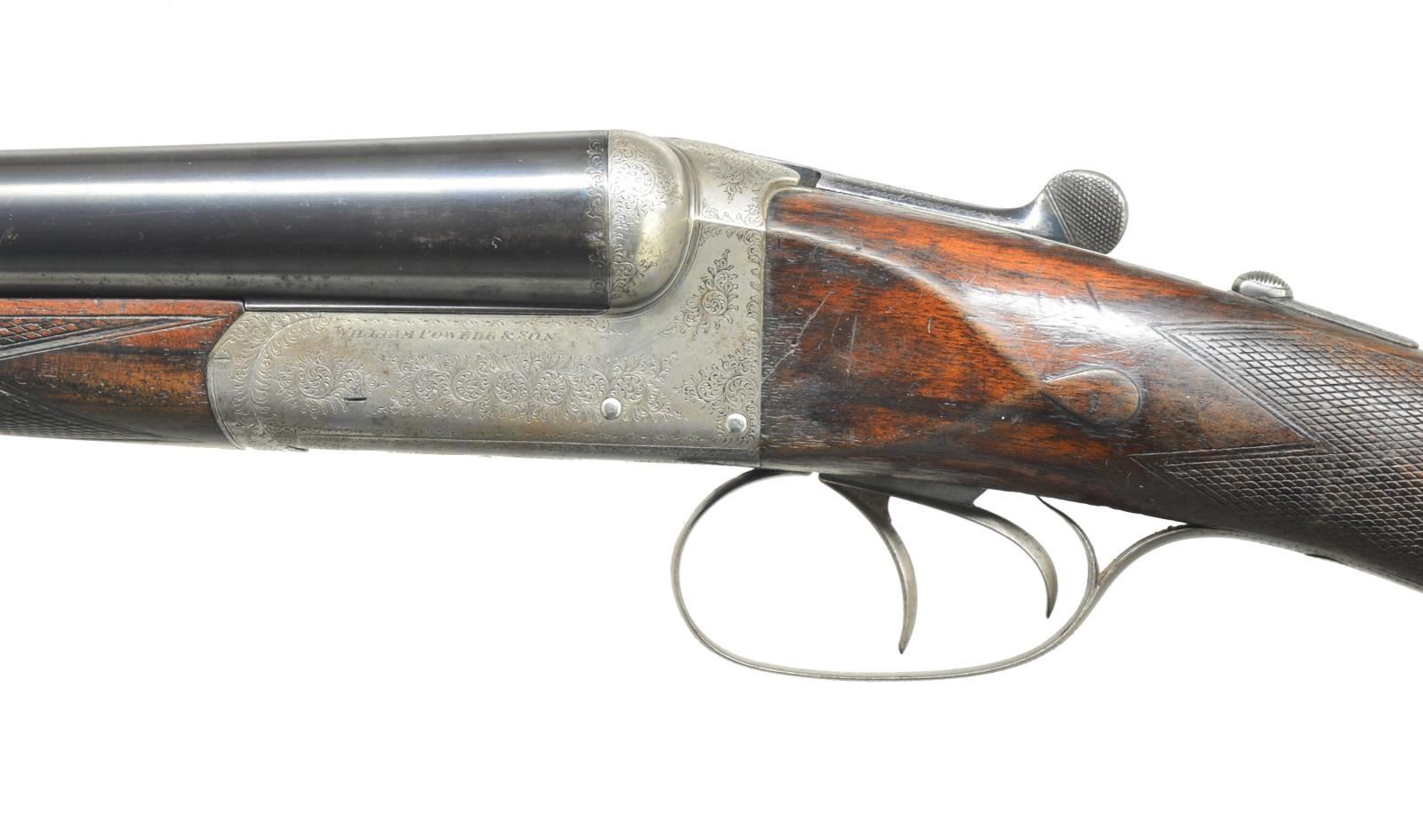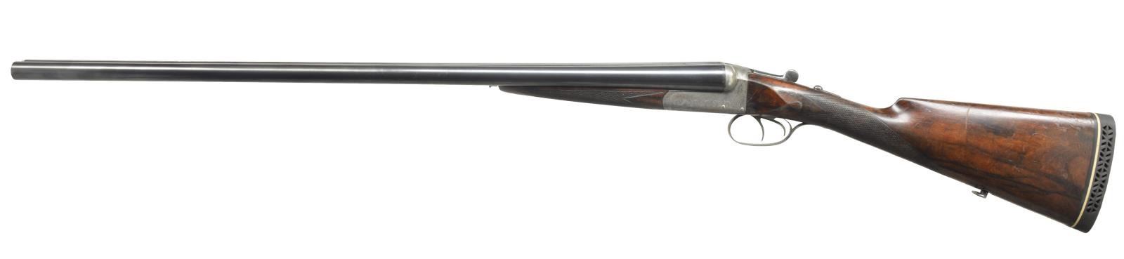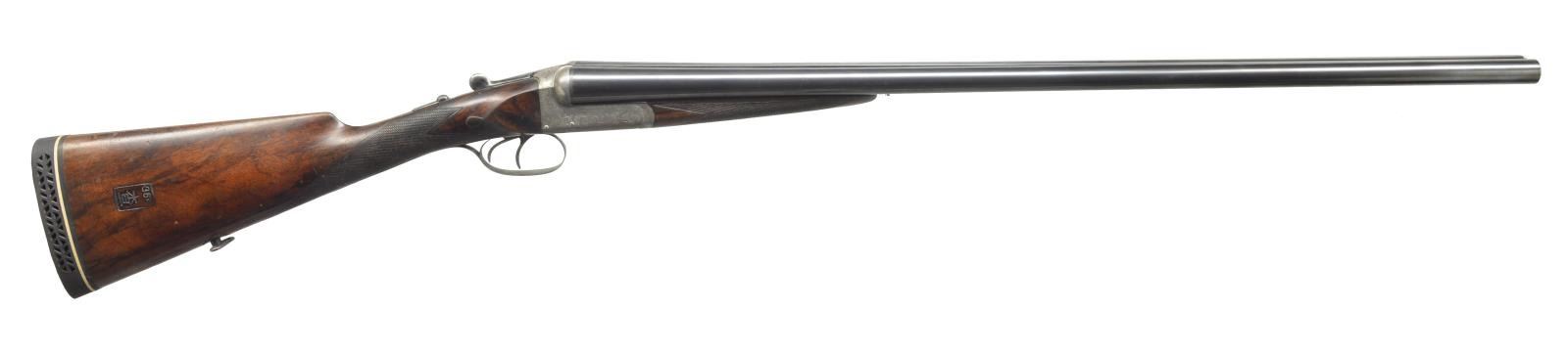 GAME SHOTGUN. Cal. 12 Ga., 2 1/2". S# 11686. Bbls. 30" dovetailed are engraved “William Powell, 35, Cars Lane, Birmingham” on narrow swamped rib w/ doll’s head extension. Bbl. flats are stamped w/ Birmingham nitro proofs for 2 1/2" chambers. Case hardened boxlock action is nicely filed & features automatic safety (“SAFE” on gold rectangle), pivoting 3rd fastener & dbl. triggers. Action is engraved w/ 60% coverage very nicely cut varying size & scroll. “William Powell & Son” is on each side. Blued top lever, floorplate & trigger guard are engraved w/ matching scroll, S# is on trigger guard tang. Lightly marbled straight grip buttstock measures 14 7/8" over black “White-line” pad. Stock features drop points, flat top point pattern checkering at grip & a sling loop on toeline. Right side of stock is branded w/ cartouche of far eastern letters. Matching splinter "Southgate" ejector forend has Anson release. MEASUREMENTS: BARRELS: Bore diameter: R .729 L .729. Restriction: R .006 (IC) L .020 (MOD). Min. Wall Thickness: R .028 L .028. STOCK: LOP: 14 7/8". DAC: 1 3/8". DAH: 2 3/16". Cast: approx. 1/2" off. WEIGHT: 6 lb. 12 oz. CONDITION: good to very good, missing parts. Bbl. retaining over 90% of an old reblack over some light marks & w/ some subsequent scratches. Action retains traces of case hardening color where protected. Top lever & floorplate retain most of their original blue, trigger guard w/ some original blue has added cold blue. Stocks retain 40-50% original finish, checkering somewhat worn. Sling loops are poorly done later additions, pad relatively new. Steel forend tip & screw missing. Bores are very good to fine w/ some light pitting. Action is a bit loose, bbls. slightly off face. In 1939, this gun retailed for $385. (20-3500/MGM113). CURIO. $800-1,200.