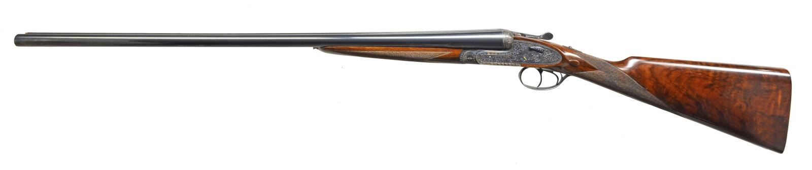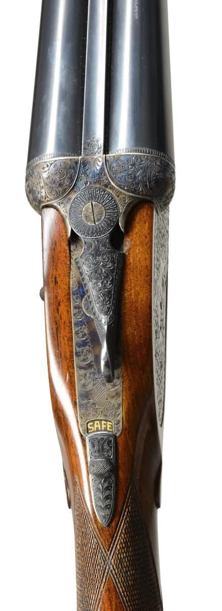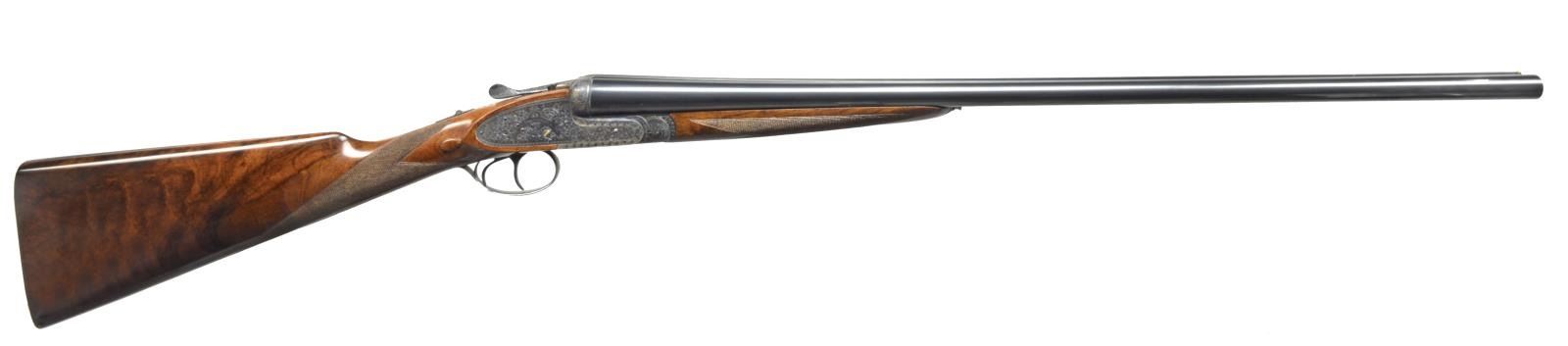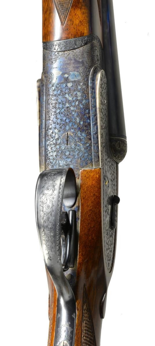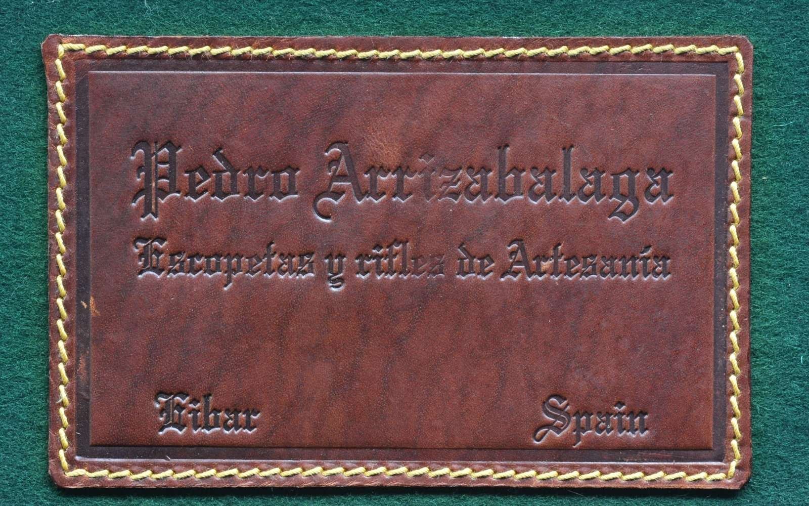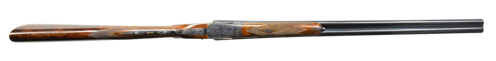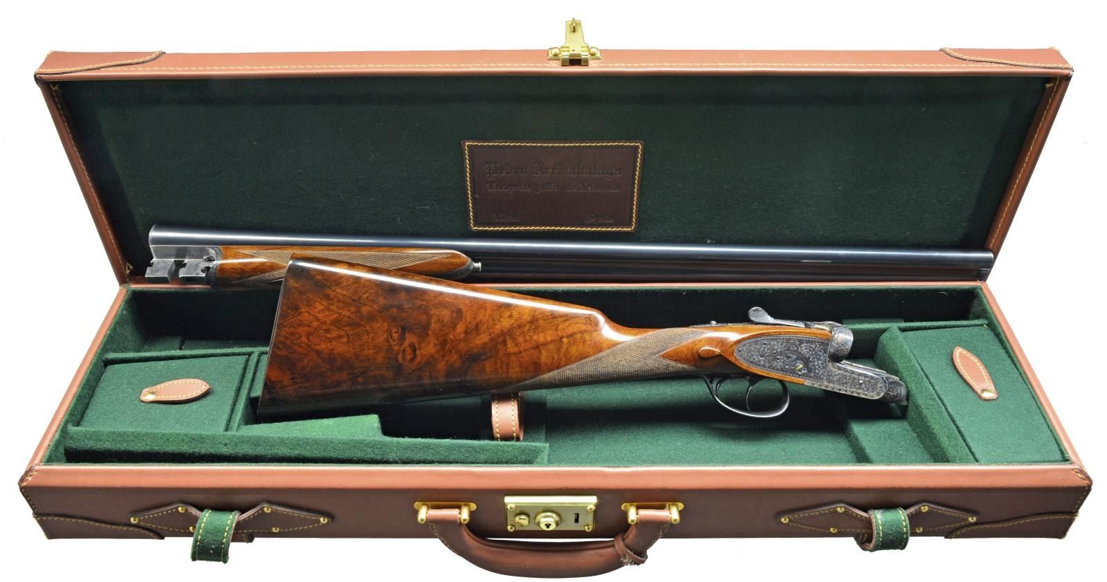 EJECTOR SELF OPENING DBL. TRIGGER GAME SHOTGUN W/ CASE. Cal. 16 Ga. S# 46-03-041-00. Bbls. 28". Pedro Arrizabalaga is known as a maker of best quality guns only & is considered to be the top Spanish gun maker. This fine gun w/ 28" well struck chopper lump bbls. fitted w/ narrow swamped game rib are engraved w/ his name & Eibar address on top right. Engine turned bbl. flats are stamped w/ Spanish nitro proofs for 16 Ga., 2 3/4" chambers. Importers information (High Grade Imports) is neatly engraved on bottom of right bbl. Bbls. are fitted w/ H&H type self opening assist spring assembly. Case hardened sidelock action features automatic safety (“SAFE” inlaid in gold), bushed strikers, gold band tumbler end cocking indicators, H&H type hand detachable locks, & dbl. triggers (front articulated). Action is engraved w/ H&H type “English Scroll” w/ near full coverage very well cut lg. shaded scroll surrounding maker’s name in arched device on each lockplate. Maker’s name over “Eibar” is on bottom of action. Single beaded trigger guard w/ open scroll on bow & has S# in gold on tang. Well marbled, stump figured European walnut straight grip buttstock measures 14 1/2" over checkered wood butt. Stock is classically styled w/ drop points & closely spaced point pattern checkering w/ mullered borders at grip. Matching splinter ejector forend has Anson release. MEASUREMENTS: BARRELS: Bore diameter: R .663 L .663. Restriction: R .004 (IC) L .020 (MOD). Min. Wall Thickness: R .023 L .024. STOCK: LOP: 14 1/2" DAC: 1 5/8". DAH: 2 1/2". Cast: 1/2" off. WEIGHT: 6 lb. 4 oz. UNATTACHED ACCESSORIES: tan leather case w/ stitched leather corners is lined in green felt & has leather Arrizabalaga label stitched into lid. Case contains spare mainsprings & firing pins in covered compartment & bag for action in another. CONDITION: very fine, very close to “as new” w/ evidence of very little firing & casual field use. Metal parts retaining nearly all of their fine factory finishes w/ just a hint of silvering on sharpest edges of action. There are a few scattered very light marks in wood finish. Checkering shows very little wear, still light in color. Bright, shiny bores. Mechanically crisp. Ejectors are in time. Case is very fine w/ only a few minor marks on exterior. This fine gun retails for over $27,000. (20-4192/MGM). MODERN. $7,500-12,500.
