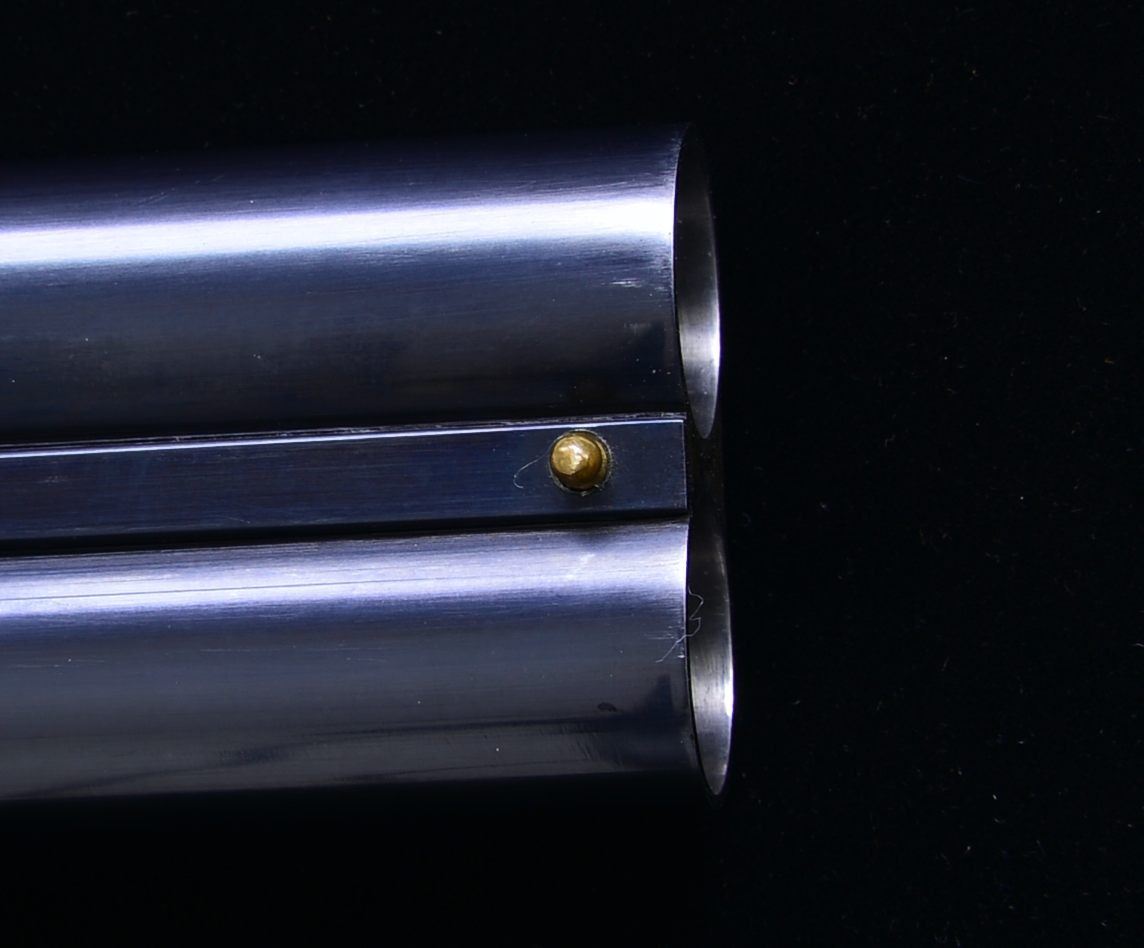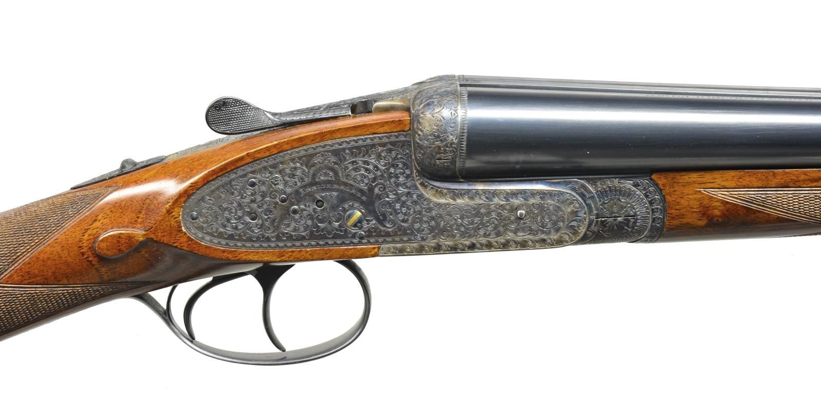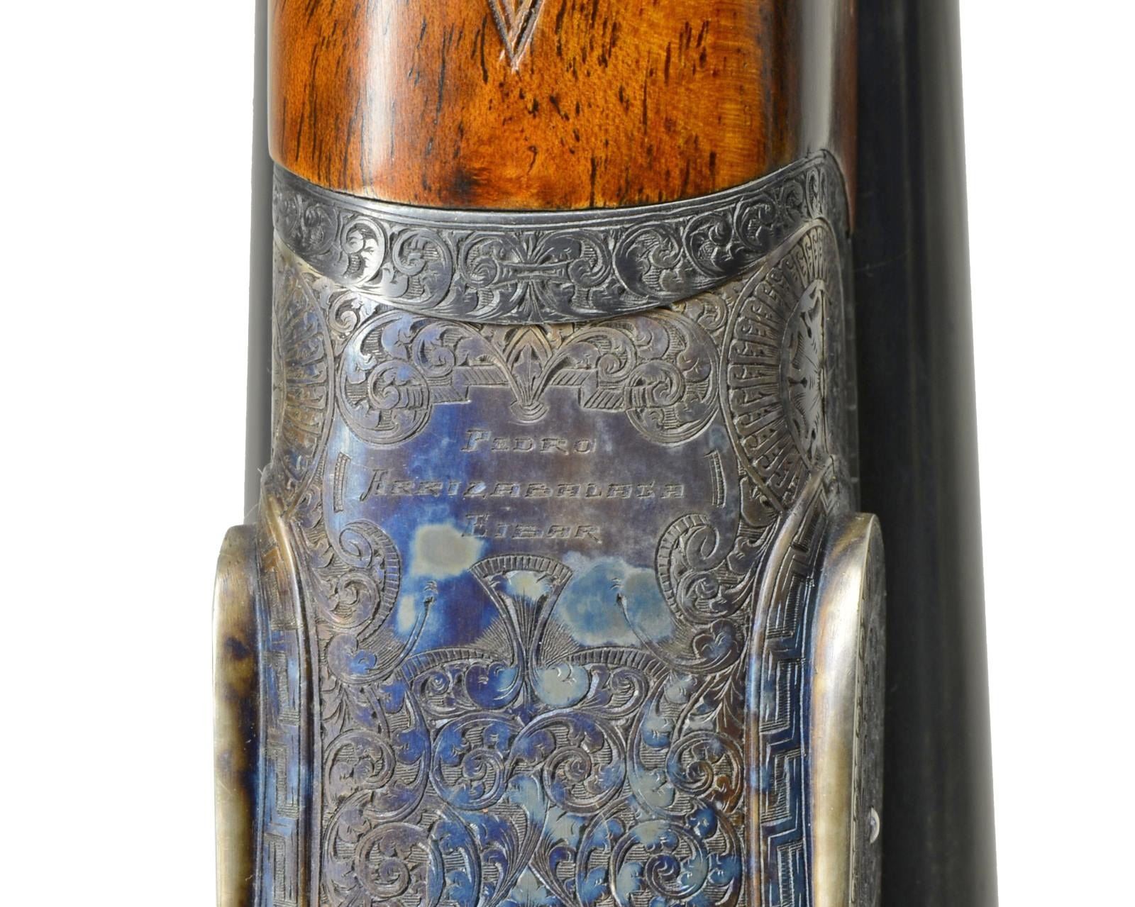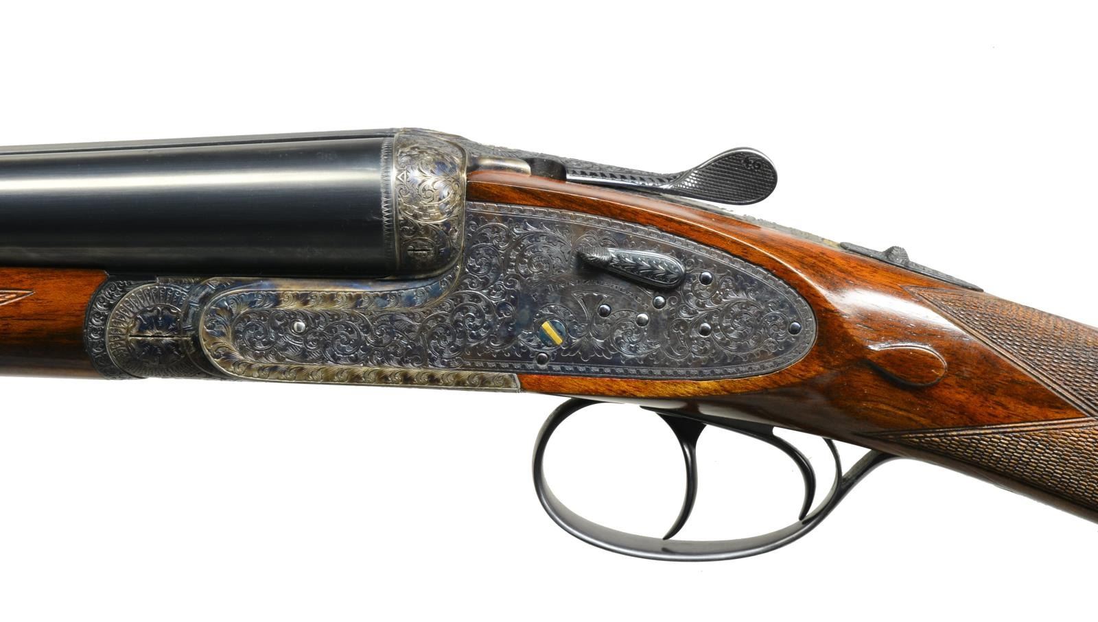 EJECTOR SELF OPENING DBL. TRIGGER GAME SHOTGUN W/ CASE. Cal. 16 Ga. S# 46-03-041-00. Bbls. 28". Pedro Arrizabalaga is known as a maker of best quality guns only & is considered to be the top Spanish gun maker. This fine gun w/ 28" well struck chopper lump bbls. fitted w/ narrow swamped game rib are engraved w/ his name & Eibar address on top right. Engine turned bbl. flats are stamped w/ Spanish nitro proofs for 16 Ga., 2 3/4" chambers. Importers information (High Grade Imports) is neatly engraved on bottom of right bbl. Bbls. are fitted w/ H&H type self opening assist spring assembly. Case hardened sidelock action features automatic safety (“SAFE” inlaid in gold), bushed strikers, gold band tumbler end cocking indicators, H&H type hand detachable locks, & dbl. triggers (front articulated). Action is engraved w/ H&H type “English Scroll” w/ near full coverage very well cut lg. shaded scroll surrounding maker’s name in arched device on each lockplate. Maker’s name over “Eibar” is on bottom of action. Single beaded trigger guard w/ open scroll on bow & has S# in gold on tang. Well marbled, stump figured European walnut straight grip buttstock measures 14 1/2" over checkered wood butt. Stock is classically styled w/ drop points & closely spaced point pattern checkering w/ mullered borders at grip. Matching splinter ejector forend has Anson release. MEASUREMENTS: BARRELS: Bore diameter: R .663 L .663. Restriction: R .004 (IC) L .020 (MOD). Min. Wall Thickness: R .023 L .024. STOCK: LOP: 14 1/2" DAC: 1 5/8". DAH: 2 1/2". Cast: 1/2" off. WEIGHT: 6 lb. 4 oz. UNATTACHED ACCESSORIES: tan leather case w/ stitched leather corners is lined in green felt & has leather Arrizabalaga label stitched into lid. Case contains spare mainsprings & firing pins in covered compartment & bag for action in another. CONDITION: very fine, very close to “as new” w/ evidence of very little firing & casual field use. Metal parts retaining nearly all of their fine factory finishes w/ just a hint of silvering on sharpest edges of action. There are a few scattered very light marks in wood finish. Checkering shows very little wear, still light in color. Bright, shiny bores. Mechanically crisp. Ejectors are in time. Case is very fine w/ only a few minor marks on exterior. This fine gun retails for over $27,000. (20-4192/MGM). MODERN. $7,500-12,500.