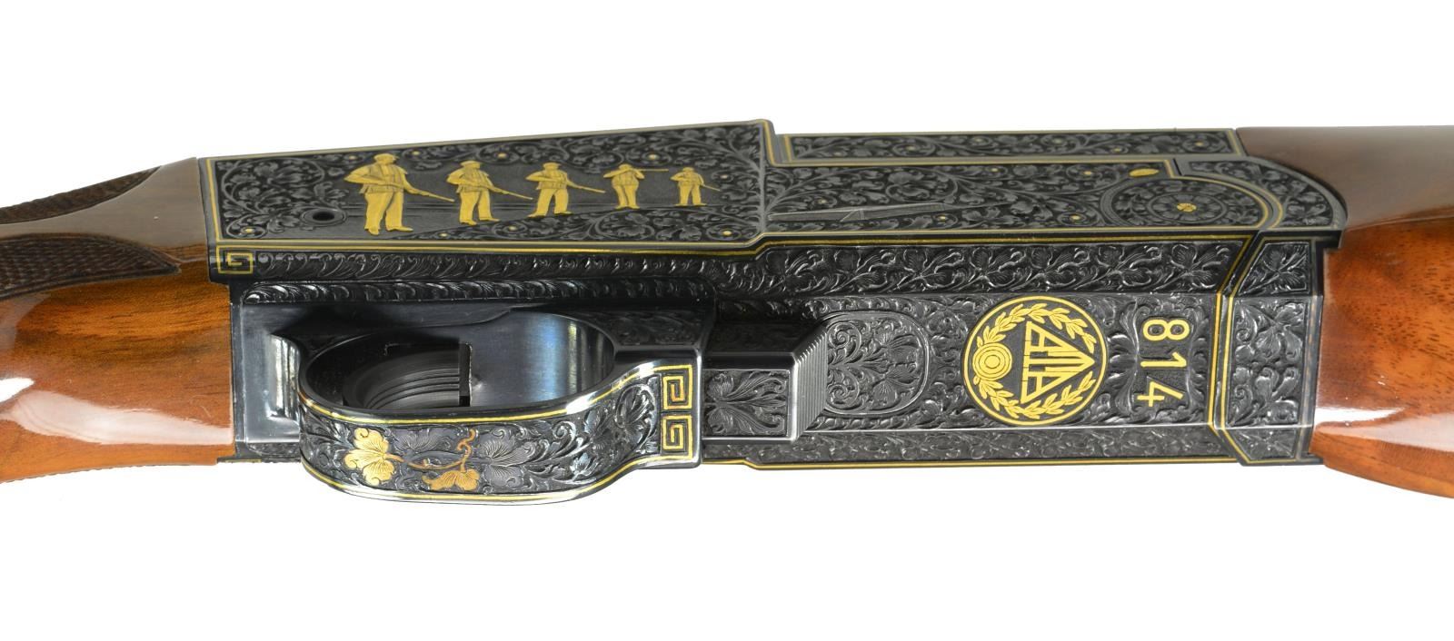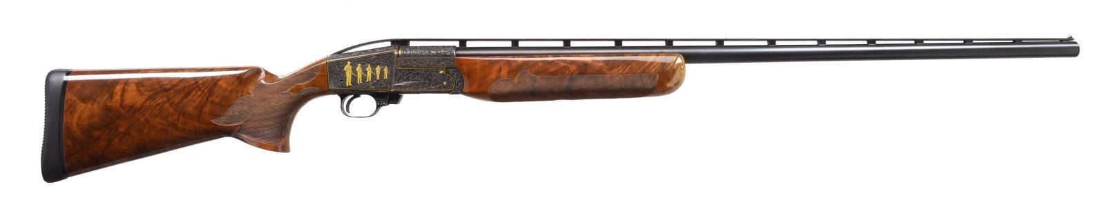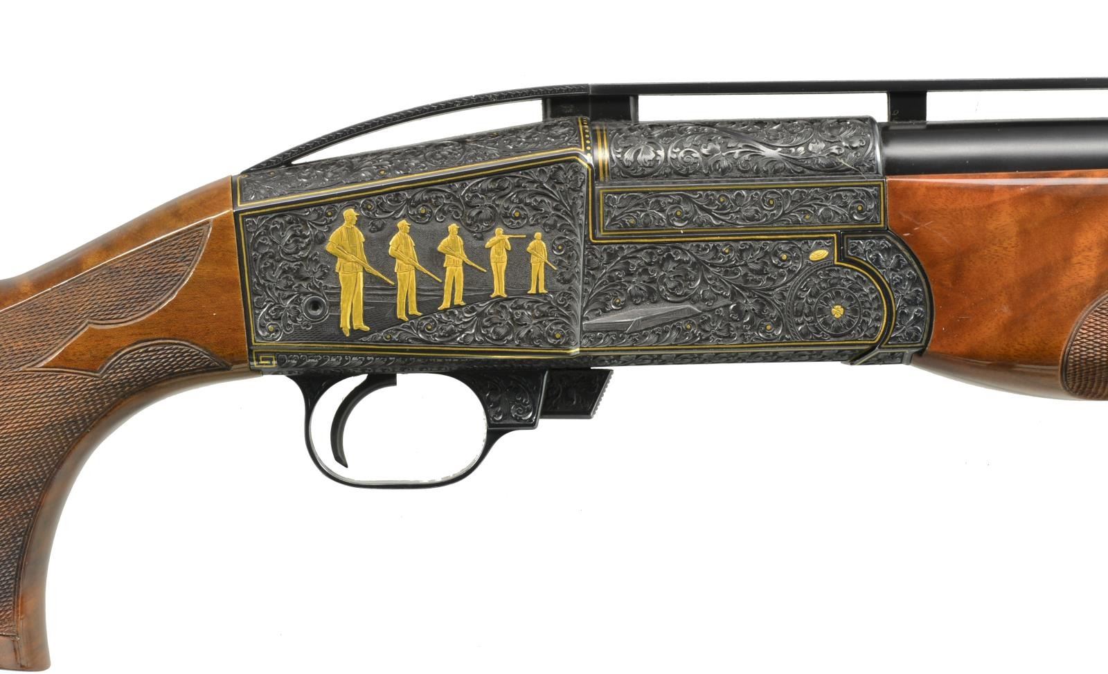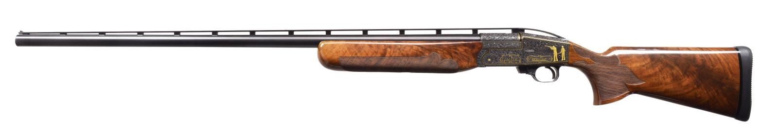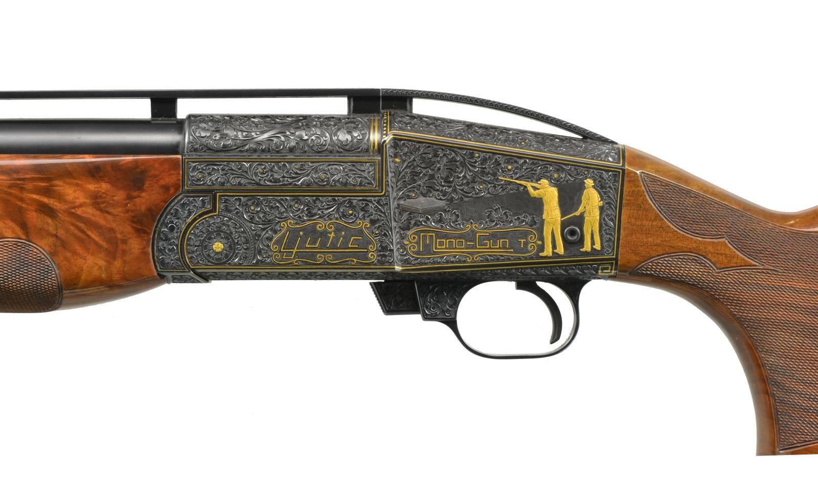 Cal. 12 Ga., 2 3/4". S# 814. Ornate fully engraved version of the famous Mono-Gun. Action, trigger guard, breech end of bbl. & forearm iron have full coverage vine type foliate scroll hand engraving w/ straight line gold borders having highlights of gold dots & flowers. The scroll foliate surrounds trap shooting scenes. Right side of receiver features 5 raised gold trap shooters. Left side shows 2 raised gold trap shooters & 2 gold bordered monograms marked "LJUTIC" & "MONO-GUN T". Bbl. 34" w/ fixed Full choke (.030") & raised matted VR that continues over the top of the receiver. White target front sight w/ white mid bead. Pull trigger & automatic ejector. Blue metal finish. Beavertail forearm & pistol grip palm swell trap dimension stock of gloss finished exhibition grade thin shell walnut having burl figure w/ contrasting vivid orange & brown tones. Stock & forearm have elaborate 22 LPI hand checkering. LOP: 14 1/4" over Decelerator solid black strap pad. DAC: 1 3/8". DAH: 1 1/2". Stock has a very slight cast on. Weight: 9 lbs. 13.4 oz. CONDITION: bbl. & action retain over 99% original blue. Gloss finished wood shows sm. scratches. Tight action w/ crisp mechanics. Bright near excellent bore. (20-1977/DS). MODERN. $5,000-7,000.
