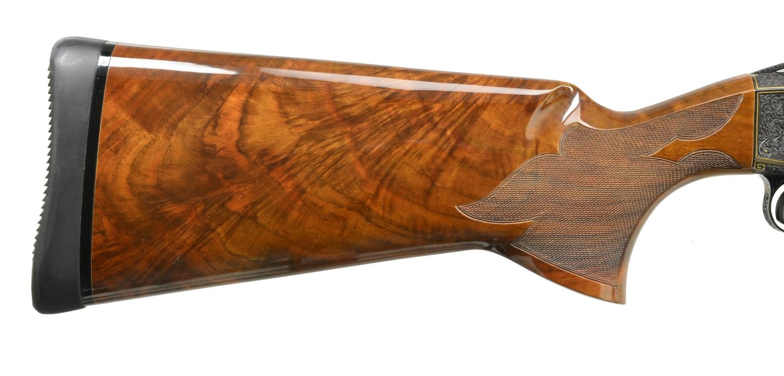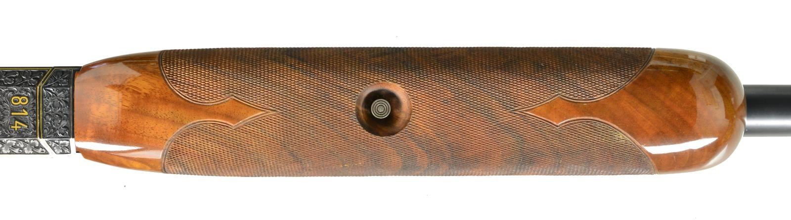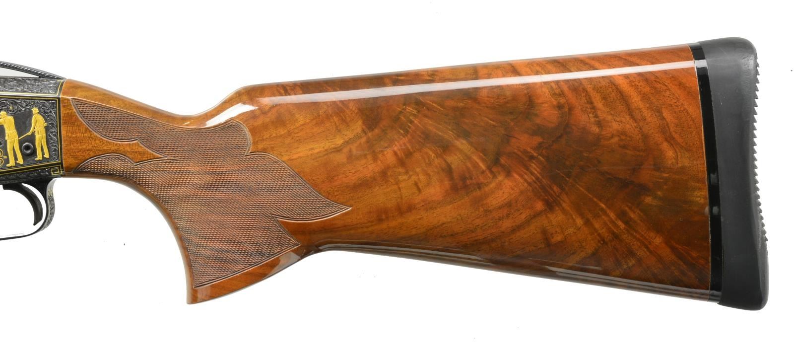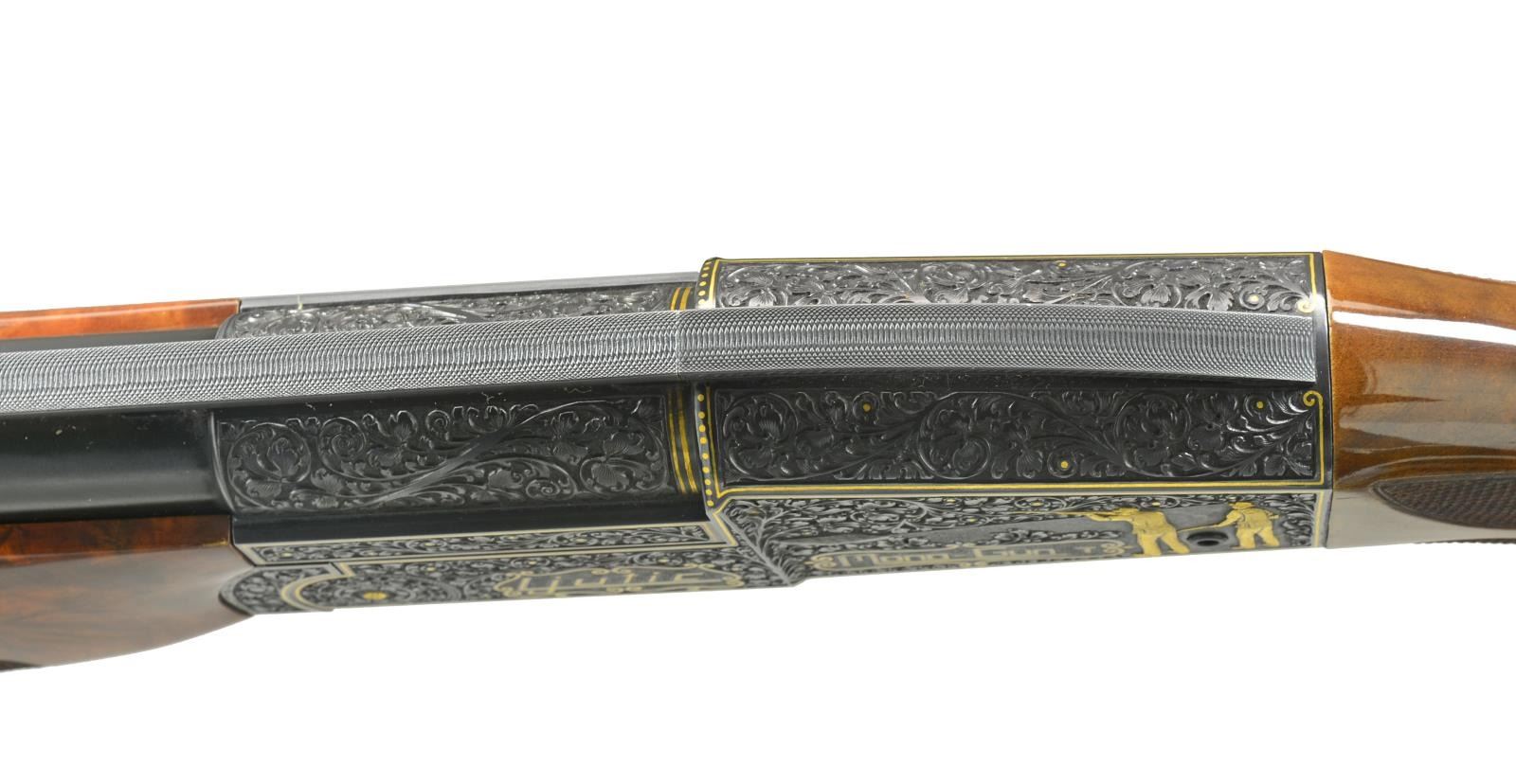 Cal. 12 Ga., 2 3/4". S# 814. Ornate fully engraved version of the famous Mono-Gun. Action, trigger guard, breech end of bbl. & forearm iron have full coverage vine type foliate scroll hand engraving w/ straight line gold borders having highlights of gold dots & flowers. The scroll foliate surrounds trap shooting scenes. Right side of receiver features 5 raised gold trap shooters. Left side shows 2 raised gold trap shooters & 2 gold bordered monograms marked "LJUTIC" & "MONO-GUN T". Bbl. 34" w/ fixed Full choke (.030") & raised matted VR that continues over the top of the receiver. White target front sight w/ white mid bead. Pull trigger & automatic ejector. Blue metal finish. Beavertail forearm & pistol grip palm swell trap dimension stock of gloss finished exhibition grade thin shell walnut having burl figure w/ contrasting vivid orange & brown tones. Stock & forearm have elaborate 22 LPI hand checkering. LOP: 14 1/4" over Decelerator solid black strap pad. DAC: 1 3/8". DAH: 1 1/2". Stock has a very slight cast on. Weight: 9 lbs. 13.4 oz. CONDITION: bbl. & action retain over 99% original blue. Gloss finished wood shows sm. scratches. Tight action w/ crisp mechanics. Bright near excellent bore. (20-1977/DS). MODERN. $5,000-7,000.