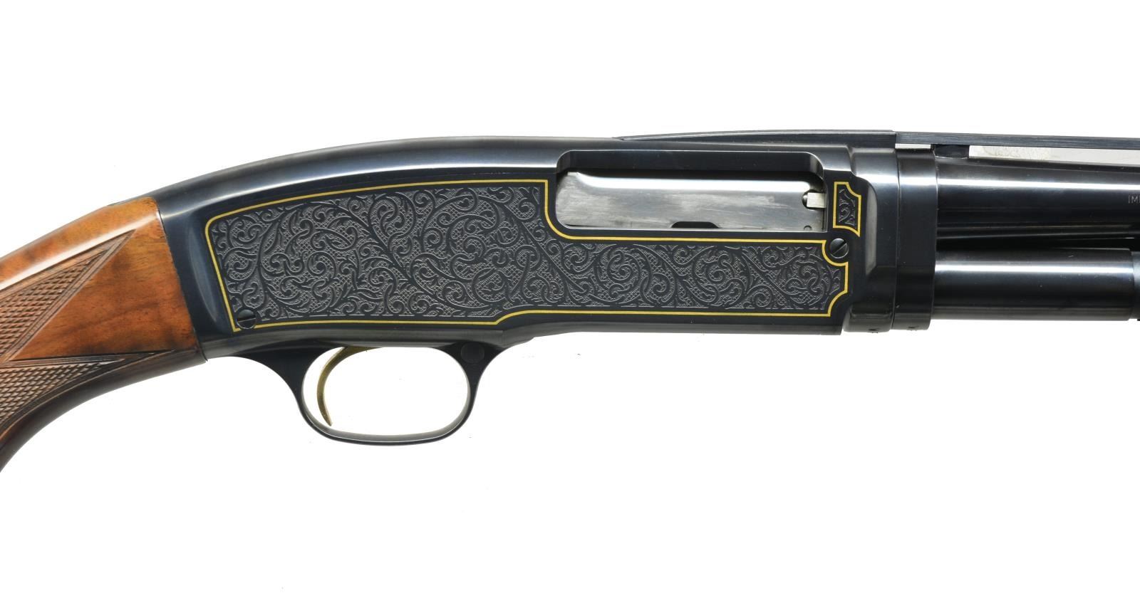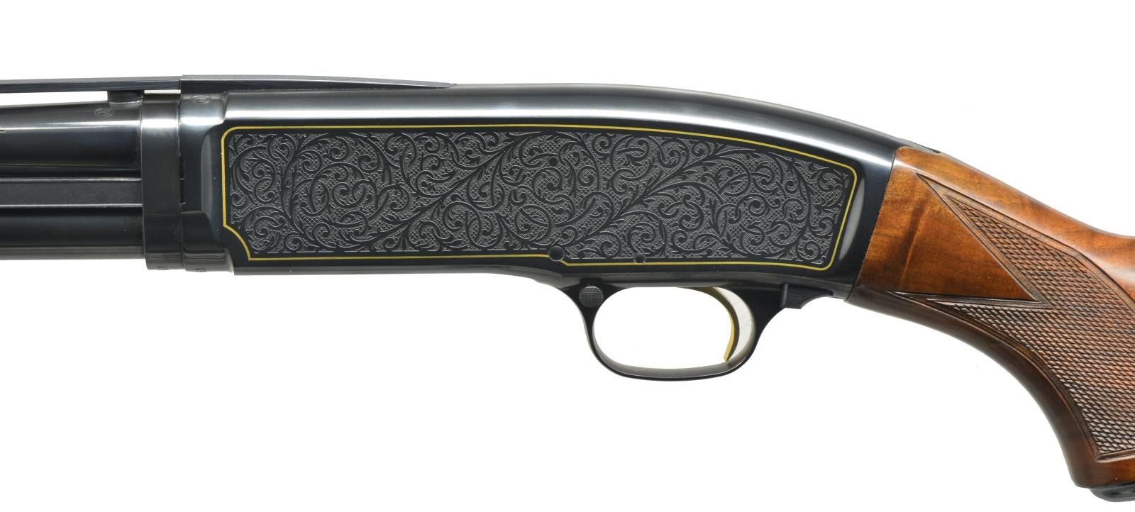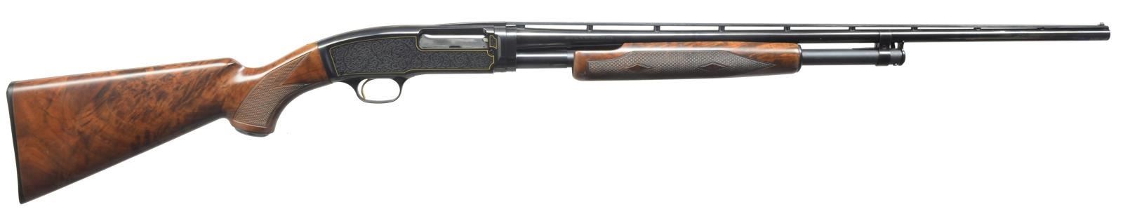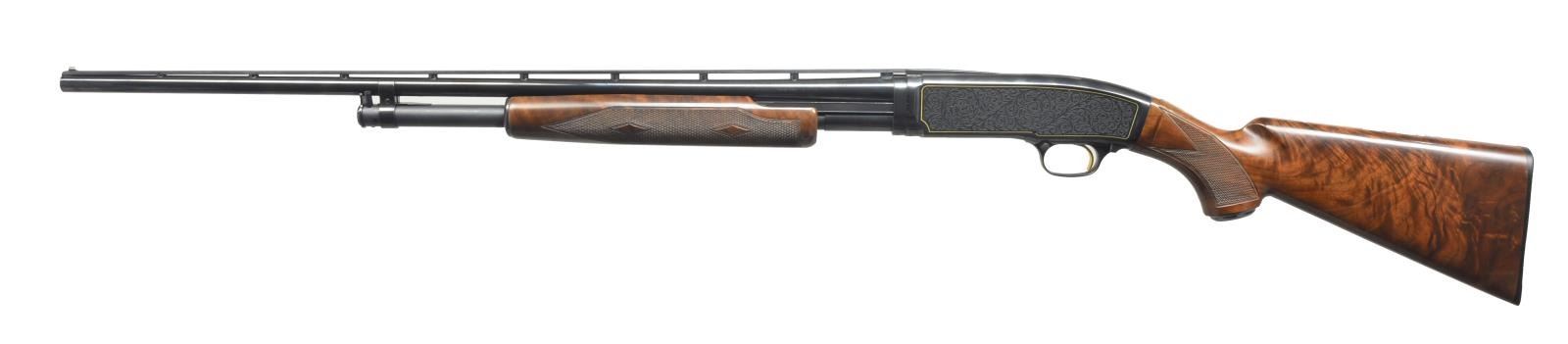 PUMP SHOTGUN. Cal. 410, 3". S# WFT561. Bbl. 26" w/ rnd. post VR & white target front sight. Fixed full choke. Sides of action has special scroll ornamentation w/ gold borders. Gold plated trigger. Fancy Grade V-VI wood w/ hand checkering including dbl. diamond pattern on forend. Limited quantity of 850 mfg. by Miroku in 1993. CONDITION: over 97% original finish showing slide wear on mag. tube. Bright bore. PROVENANCE: Collection of Alan Bradley Shepherd. (20-4006/DS). MODERN. $1,200-1,800.