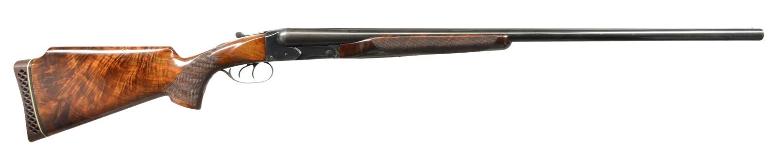 Cal. 12 Ga., 2 3/4". S# 599. Bbls. are 30", are marked for Mod. & full chokes, & have Winchester info on tops. Bbl. flats are stamped w/ S# & an additional number “43183 S”. Standard action w/ automatic safety & dbl. triggers is unmarked on water table except for proof. Custom Monte Carlo target type buttstock of crotch figured American walnut measures 15" over “White Line” trap pad. Point pattern checkering is at grip. What appears to be factory beavertail forend wood has been fitted to non-ejector iron. MEASUREMENTS: BARRELS: Bore diameter: R .729 L .730. Restriction: R .007 (IC) L .032 (FULL). Min. Wall Thickness: R .030. L .030. STOCK: LOP: 15". DAC: 1 1/8”. At rear of Monte Carlo: 1 1/8". DAH: 2 1/16" WEIGHT: 8 lb. 6 oz. UNATTACHED ACCESSORIES: 2 splinter forends, both unnumbered, 1 w/ factory style checkering & good condition, another w/ no checkering & some oak leaf carving. CONDITION: good as refurbished. Bbls. w/ most of an old reblue over some scattered pitting, action same. Buttstock w/ nearly all of its original custom finish, forend w/ added oil, checkering lightly worn. Bores are fine, action is tight. (20-3092/MGM102). CURIO. $800-1,500.