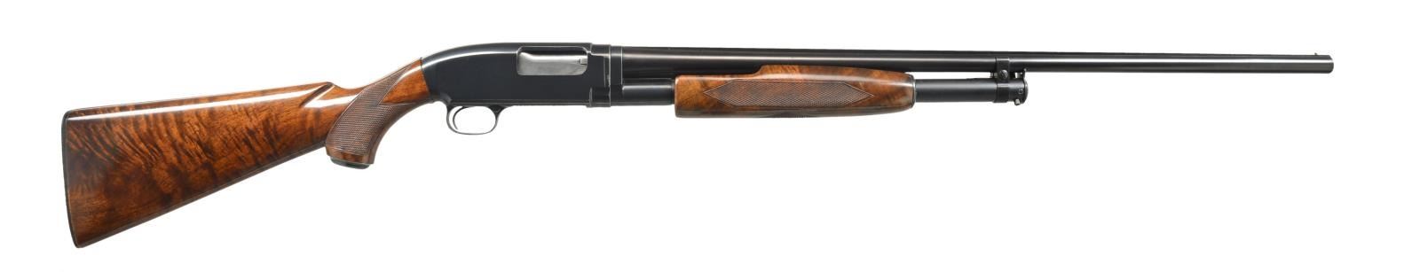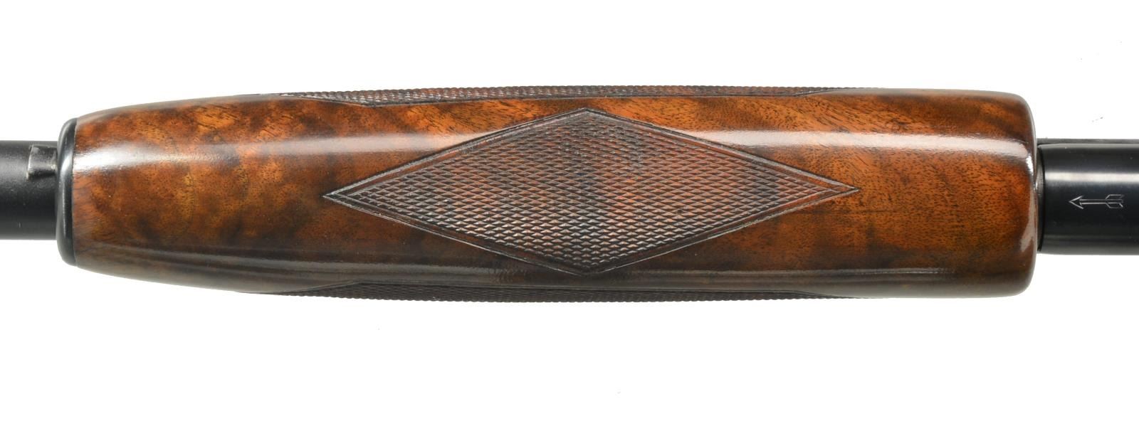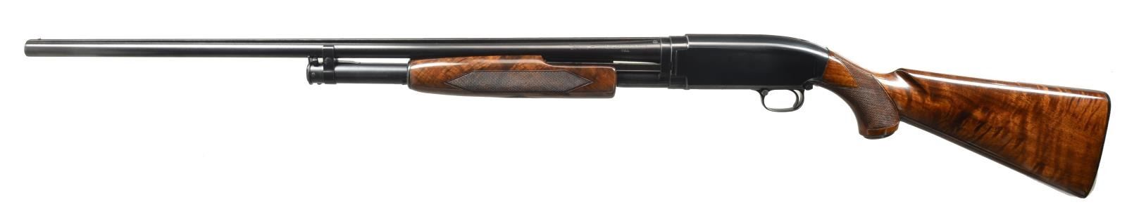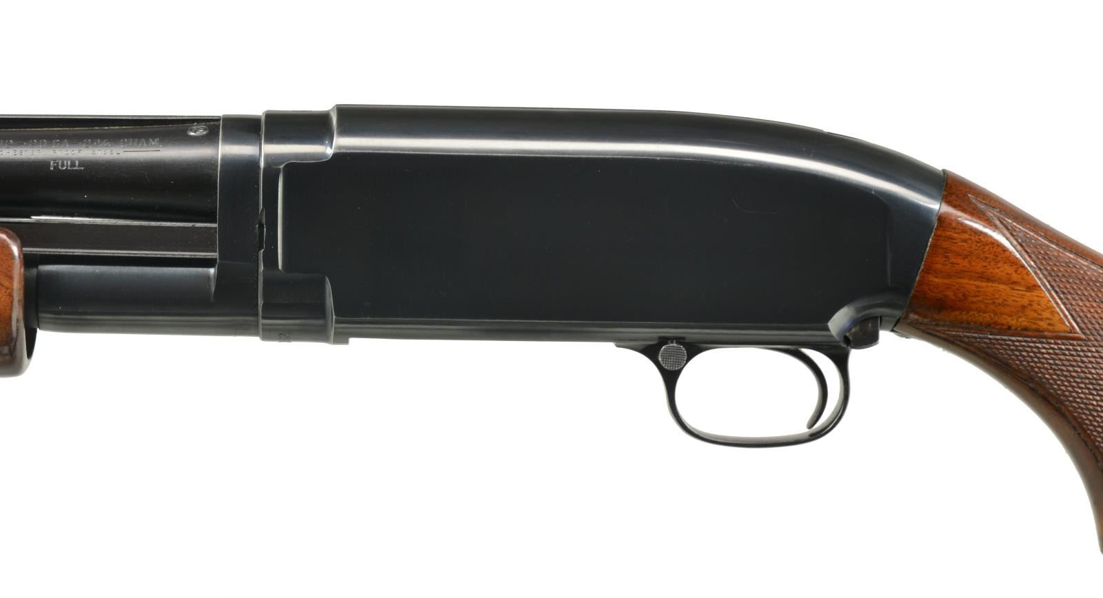 SHOTGUN. Cal. 20 Ga., 2 3/4". S# 1654062. Bbl. 28" full choke solid rib bbl. w/ silver bead front sight. Checkered skeet forend. Checkered pistol grip w/ sculpted metal grip cap & Winchester hard rubber buttplate. CONDITION: bbl. retains most of its original blue w/ minor wear at muzzle & a couple sm. spots of faint surface oxidation. Thinning on slide arm. Receiver has original blue w/ minor thinning on sharp edges. Minor rub mark on front edge, right side from forend. Forend has original finish w/ sharp checkering. Buttstock has coat of added finish w/ good checkering. Bore is bright. (20-1727/BT). CURIO. $1,500-2,500.