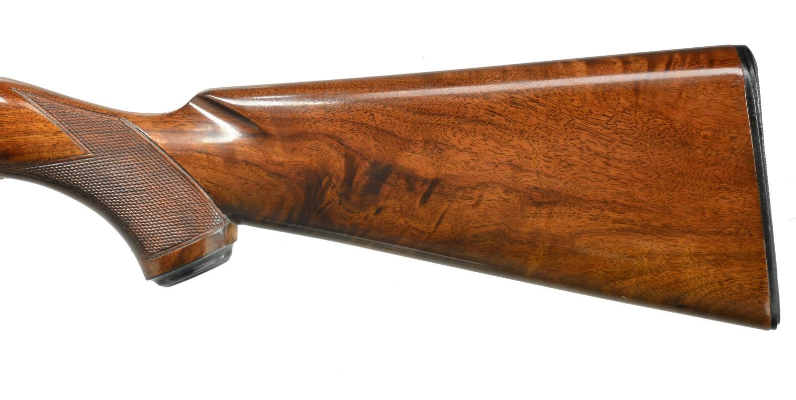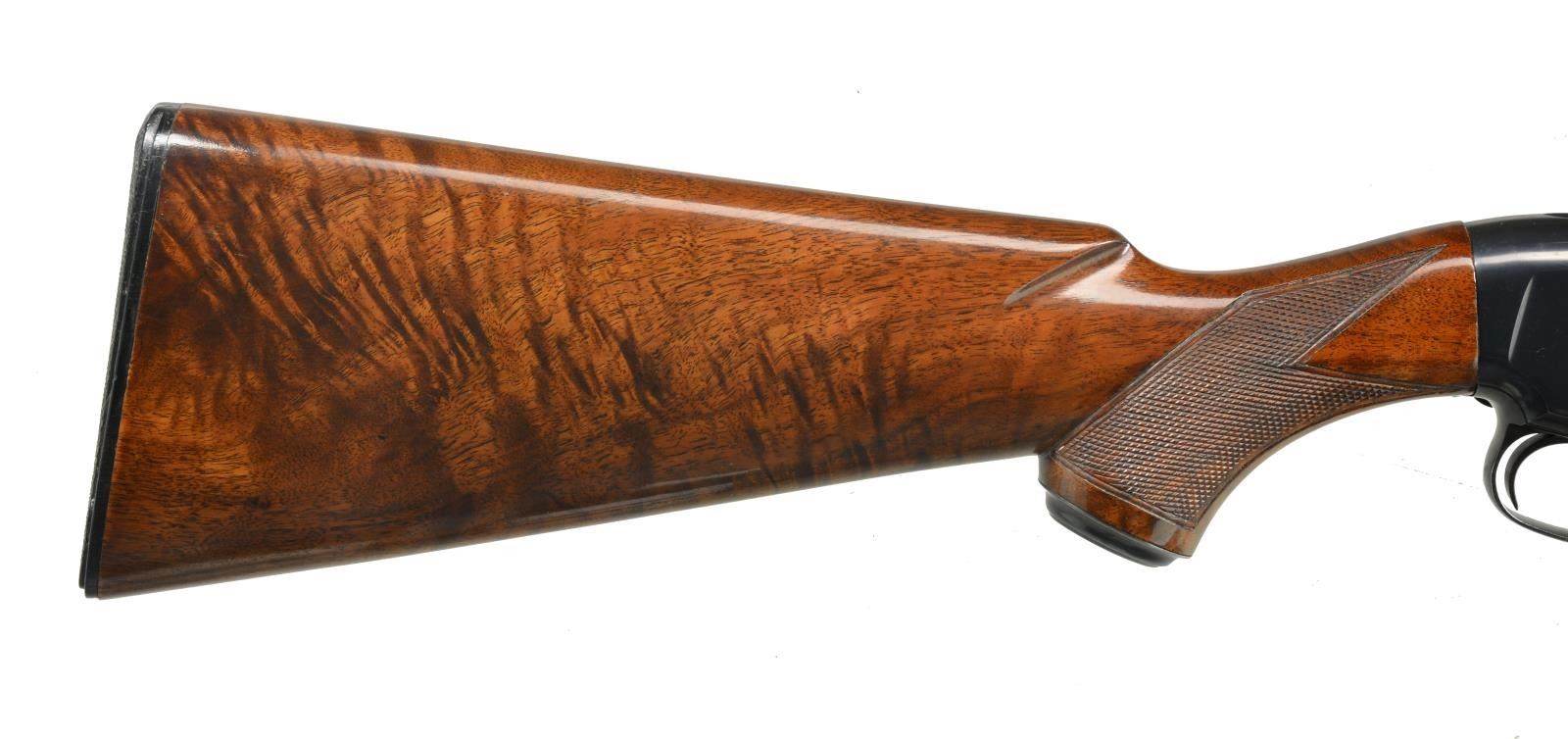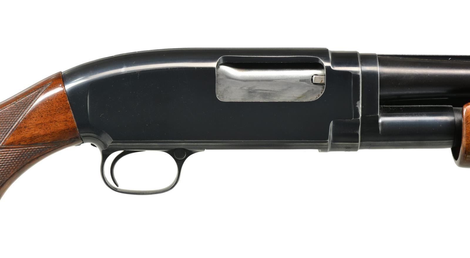 SHOTGUN. Cal. 20 Ga., 2 3/4". S# 1654062. Bbl. 28" full choke solid rib bbl. w/ silver bead front sight. Checkered skeet forend. Checkered pistol grip w/ sculpted metal grip cap & Winchester hard rubber buttplate. CONDITION: bbl. retains most of its original blue w/ minor wear at muzzle & a couple sm. spots of faint surface oxidation. Thinning on slide arm. Receiver has original blue w/ minor thinning on sharp edges. Minor rub mark on front edge, right side from forend. Forend has original finish w/ sharp checkering. Buttstock has coat of added finish w/ good checkering. Bore is bright. (20-1727/BT). CURIO. $1,500-2,500.