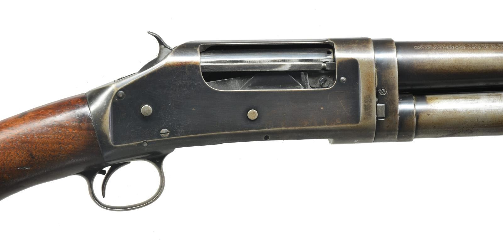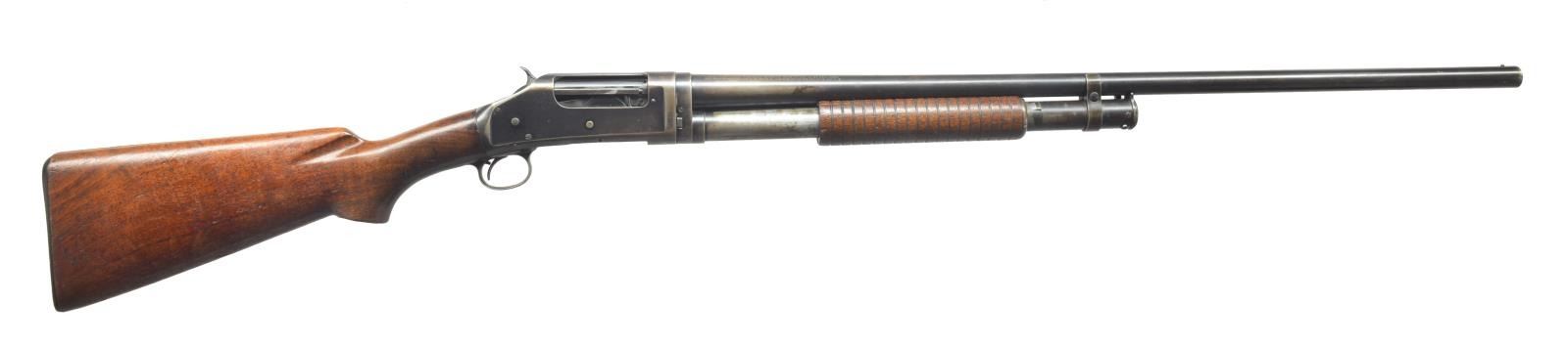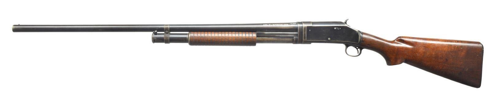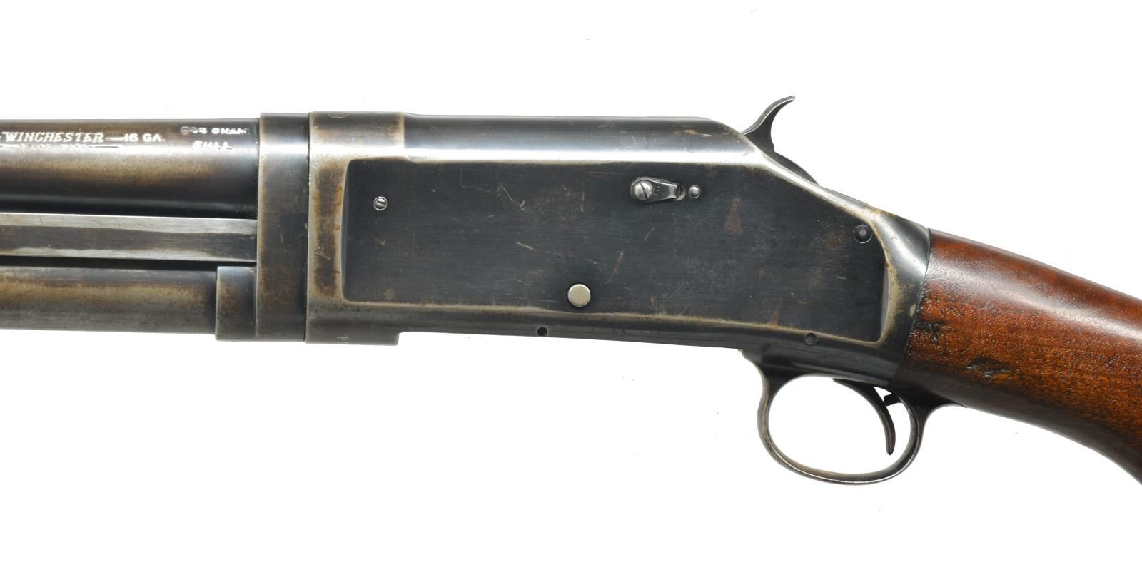 Cal. 16 Ga., 2 3/4". S# 920906. Bbl. 30" plain w/ fixed Full choke & steel mid bead. Grooved pump handle & pistol grip stock w/ original buttplate. 1945 Mfg. CONDITION: 50% dull blue fading to brown. Wood has worn & peeling finish showing scratches, dents & marks. Good mechanics. Bore is bright w/ spots of pitting near muzzle. (20-3378/DS). CURIO. $400-600.