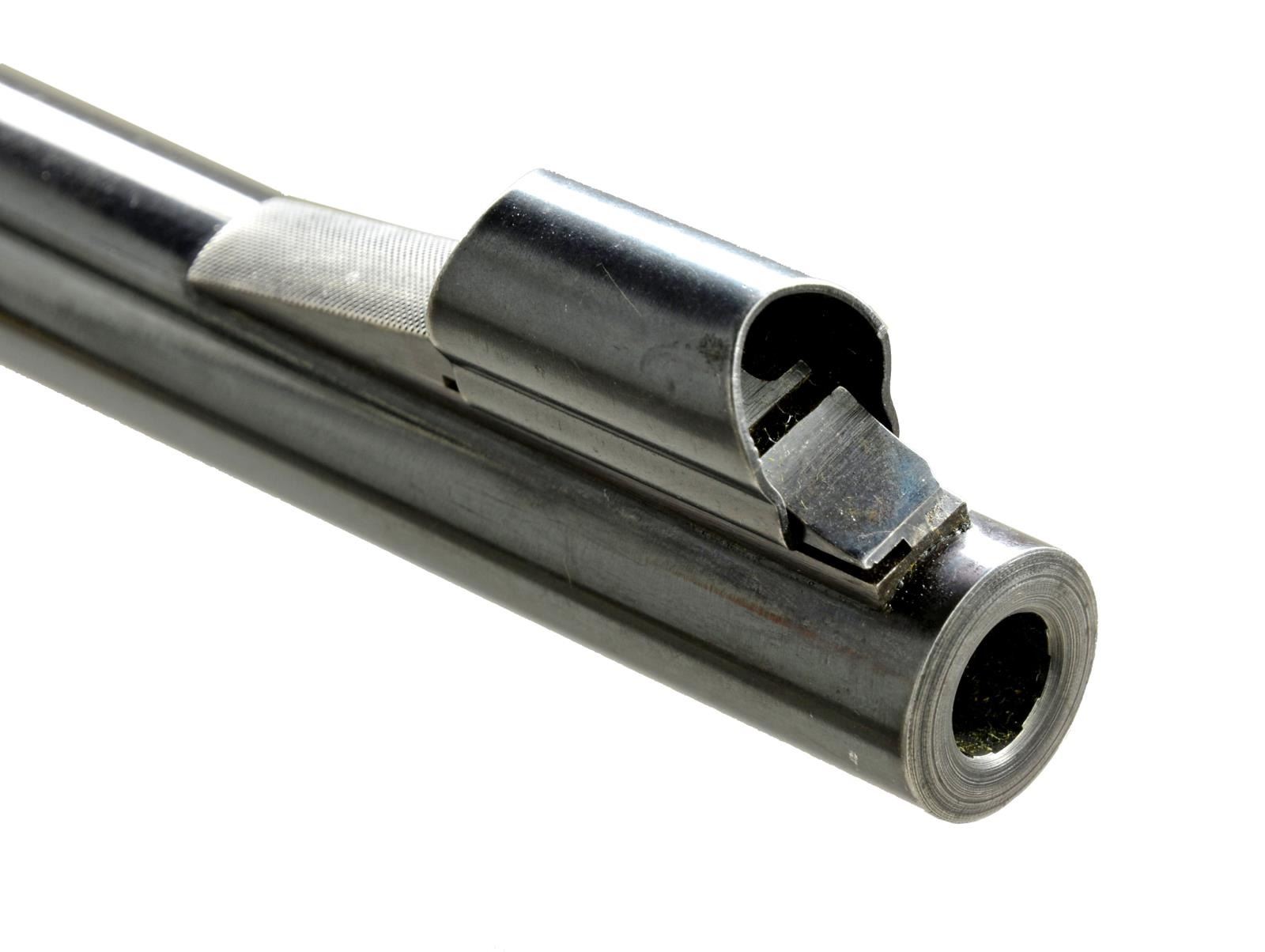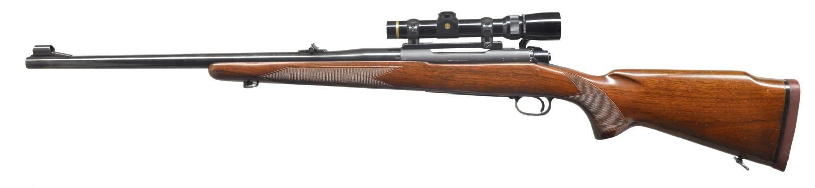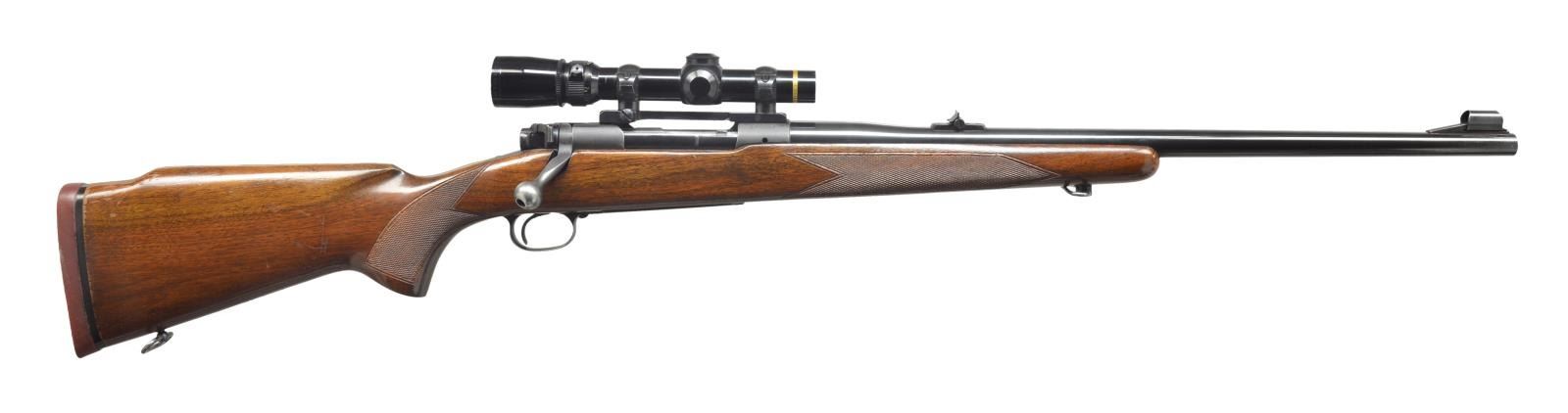 CARBINE W/ SCOPE. Cal. .375 H&H. S# 369334 (1956). Bbl. 22" medium weight w/ Winchester 70B rollover rear sight & silver bead front sight in unusual number 5 version ramp (experimental?) w/ checkered pattern of matting w/ hood. Matte blued action. Bolt body bright polish. Steel bottom metal w/ hinged floorplate. American walnut Monte Carlo pistol grip stock features red Winchester pad & sling loops & point pattern checkering at grip & forend. Rifle is fitted w/ Leupold “Vari-X III” 1.5-5x scope w/ duplex reticle in Redfield rings w/ one piece base. CONDITION: bbl. retaining nearly all of what appears to be original blue, but is possibly a reblue if bbl. was shortened (.375 H&H mag. was only offered in 25" bbl. length in 1956). Action retains over 90% of its original blue, silvered on sharp edges, especially on floorplate. Bolt knob considerably silvered. There are quite a few knocks, marks, & scratches in original finish of stock, most noticeable on right side of butt. Shiny bore. Mechanically good. Body of scope has some marks from use & repositioning of rings. Optically good. (20-3972/MGM). CURIO. $2,500-3,500.