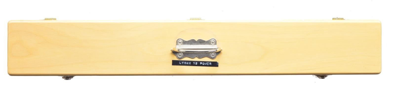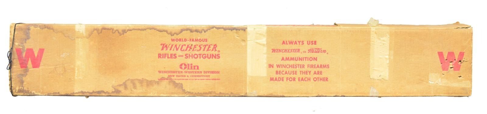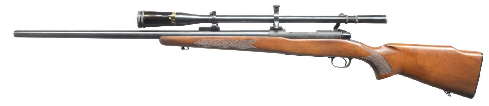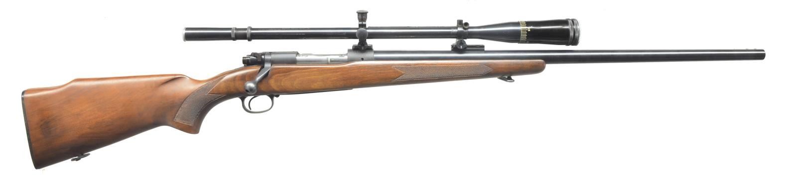ORIGINAL BOX. Cal. 220 Swift. S# 566528. Bbl. 26" Heavy Winchester proof steel bbl. has all correct markings on left side. Standard model 70 action has steel hinged floorplate. Pistol grip stock of American walnut features hard rubber Winchester buttplate, sling loops, & point pattern checkering at grip & forend. Rifle is mounted w/ factory scope blocks holding Lyman “SUPER TARGET SPOT” 12X scope, S# 11321 in micrometer rear mount. UNATTACHED ACCESSORIES: brown & red printed cardboard shipping box w/ end label for this rifle & wooden carrying case for scope. CONDITION: very fine, retaining nearly all factory blue on bbl. & action, bolt body has some light pitting at rear. There is a hint of high edge wear on floorplate w/ some very light flaking of blue toward front. Bright sharp bore, mechanically fine. Stock retains essentially all of its original finish w/ only 1 or 2 minor handling marks. Scope is fine w/ some light marks & rubs. Box is kinked, dented, chipped, & water damaged. Label has considerable chipping & insect damage. Scope case is fine. Optically good. A very rare rifle, fewer than 900 made. (20-4088/MGM). CURIO. $2,000-3,000.