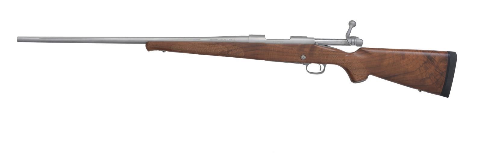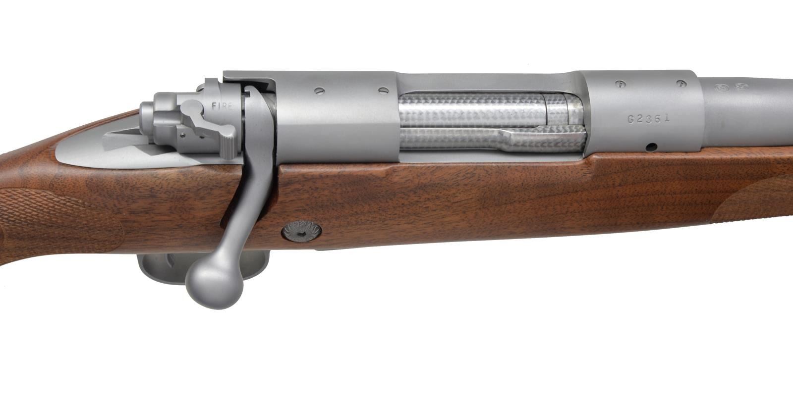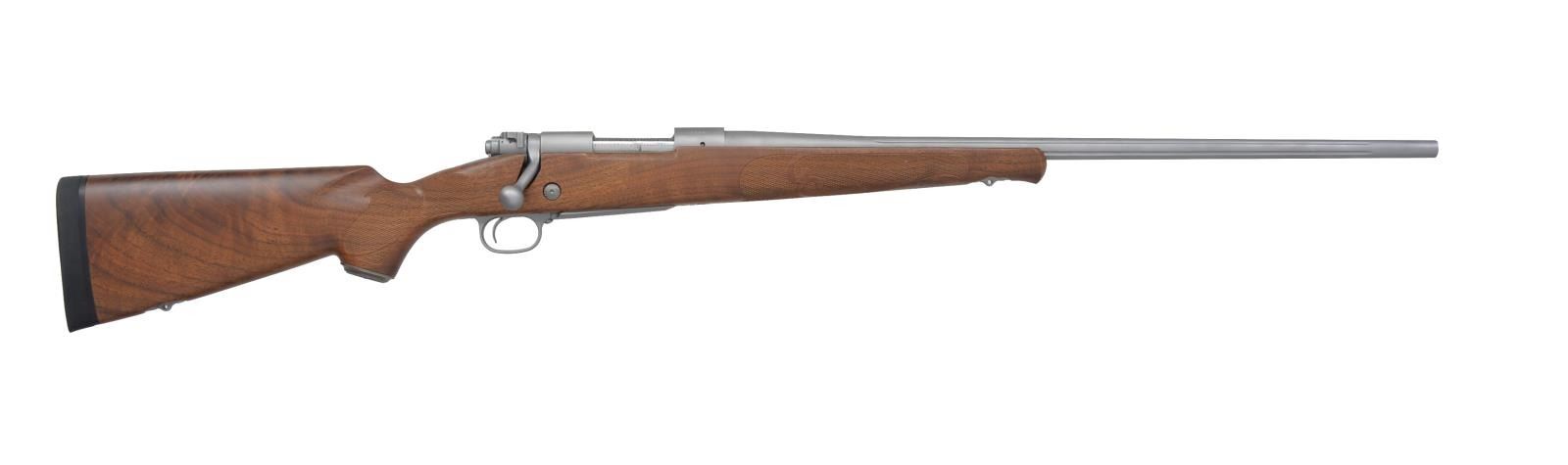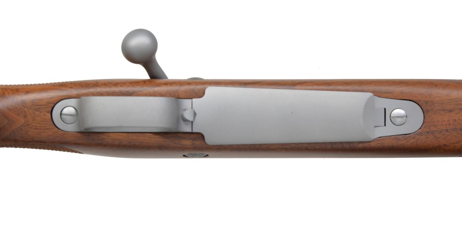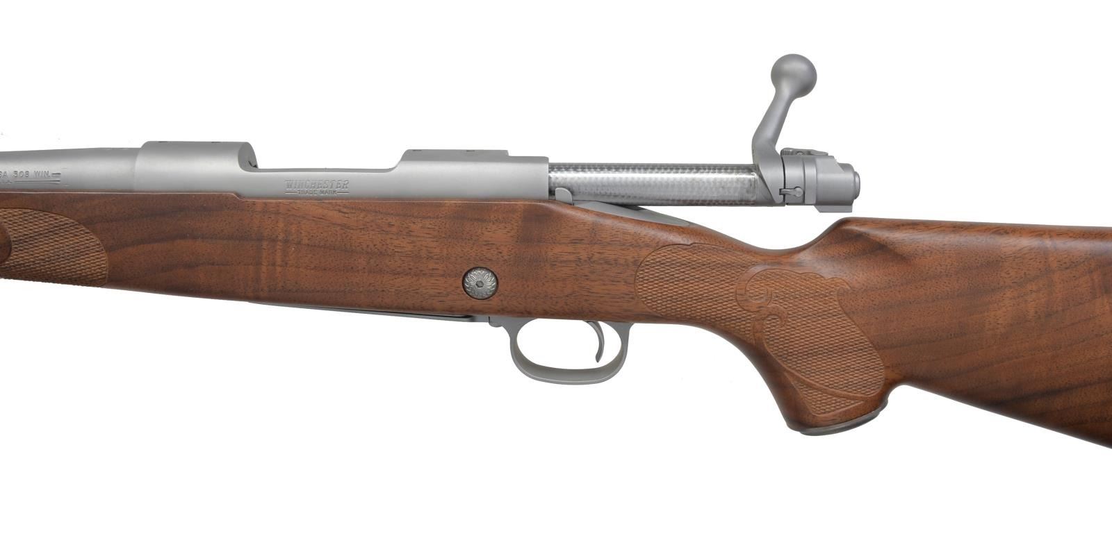 BOLT ACTION RIFLE. Cal. 308 Win. S# G2361. Bbl. 24" Krieger match grade, cut rifled, stainless steel fluted rnd. w/out sights. Bbl. has special custom shop proof stamp along w/ standard "WP" proof mark. Short action features hand engine turned bolt, claw extractor & extractor ring, unknurled bolt handle, single crossbolt & 1 piece stainless steel trigger guard & mag. cover. Bbl., action, & bottom metal have satin glass bead blast finish. Classic configuration sporter stock of semi fancy American walnut w/ satin polyurethane finish. Features include schnabel tip, steel grip cap, inletted swivel bases, segmented cut checkering, w/ LOP: 13 1/2" over 1" black Decelerator recoil pad. UNATTACHED ACCESSORIES: black molded hard case containing instruction manual, trigger lock & Custom Shop letter. CONDITION: as new, appears unused. (20-601/DS). MODERN. $1,750-2,250.