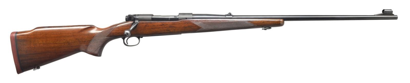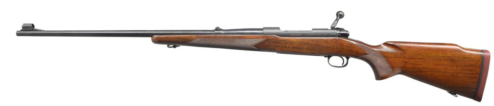 Cal. .338 Win. Mag. S# 450817. Bbl. 25" w/ Lyman 16B folding rear sight & silver front sight bead in striated ramp w/ hood. Standard matte blued action w/ steel bottom metal has bolt body brightly polished. American walnut pistol grip Monte Carlo stock features red Winchester marked pad, sling loops, & point pattern checkering at grip & forend. CONDITION: very fine. Metal parts retaining nearly all of what appears to be original blue, but is probably a good quality reblue over considerable freckling & light pitting on bottom metal. Stocks have a few scattered marks in what appears to be original finish. Shiny bore. Mechanically good. (20-3975/MGM). CURIO. $1,000-1,500.