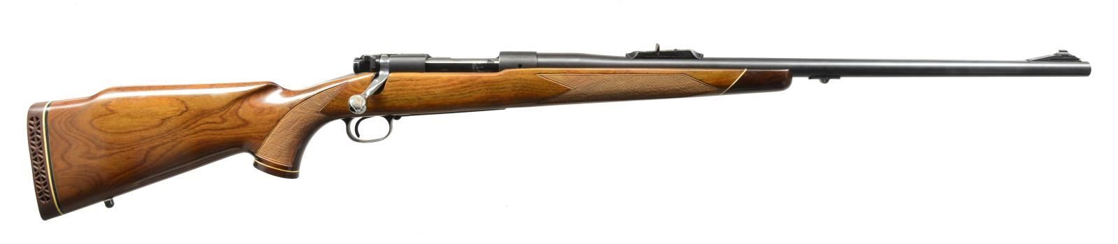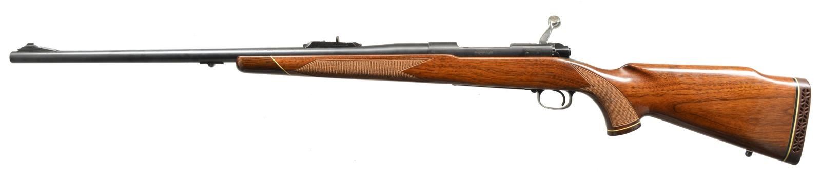 REPLACEMENT STOCK. Cal. 458 Win. Mag. S# 407646. Bbl. 25". A working rifle in .458, 25" bbl. is fitted w/ special Winchester express rear sight w/ knurled wheel to adjust elevation. Winchester information & cal. markings are on upper left side. Pre 64 action has had bolt handle polished & knob checkered. Newly made stock of relatively plain American walnut features rosewood gripcap & forend tip separated by white line spacers. Point pattern checkering is at grip & forend. Stock measures 13 7/8" over white line pad. CONDITION: bbl. & action retaining nearly all their reblue, bottom metal w/ wear to floorplate & trigger guard bow. Stock retains over 90% of its original finish, checkering is a bit coarse. Bore is excellent, action is smooth. (20-1664/MGM20). CURIO. $1,000-2,000.