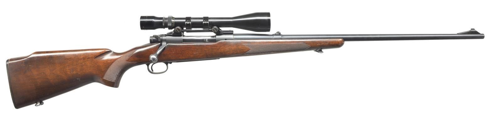 Cal. 264 Win. Mag. S# 537537. Bbl. 26". Ramp front sight w/ dovetail bead. Dovetail flip up adj. rear sight. Top of receiver has B&L mount & rings w/ Belvar 8 scope. 2.5-8 Power w/ fine crosshairs. Standard Model 70 stock w/ narrow paneling checkers on forend, checkered pistol grip & black hard rubber buttplate. Bolt has etched matching S# to gun. UNATTACHED ACCESSORIES: box of reloading equipment, including a Lyman 2 die set w/ box, 2 sm. bags of fired brass, 3 boxes of Remington loaded ammo 140 grain soft points & a box of Remington fired brass. CONDITION: bbl. has good, original bluing w/ minor muzzle wear. Receiver has original finish. Floorplate & trigger guard have original blue w/ minor thinning on sharp edges. Bolt handle has thinned to blend w/ gray patina. Stock has original finish w/ minor scratches & a couple areas where the finish has flaked. Original sling swivels. Bore is fair. (20-3173/BT). MODERN. $900-1,400.