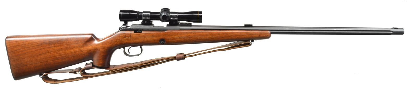TARGET RIFLE. Cal. 22 LR. S# 63969. Bbl. 28" heavy weight w/ aftermarket custom fluting, filler in front sight dovetail & bbl. mounted target scope blocks. Leupold 4x RF Special gloss finished scope w/ duplex reticle on Weaver mts. Action is cut & welded w/ reversed bolt to create a true left handed custom action. Bead blasted blue finish. Original pistol grip target stock w/ filler in original bolt slot on right side. Custom leather buttplate. Leather military sling on original swivels. MAGS: 2 detachable 5 rd. CONDITION: 98% reblued metal finish. Stock finish shows scattered scratches & marks. Bright bore w/ strong rifling. Scope has bright optics. (20-3022/DS). MODERN. $500-700.