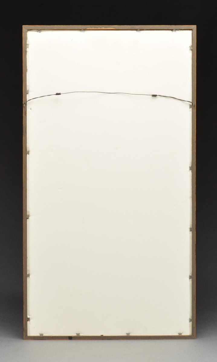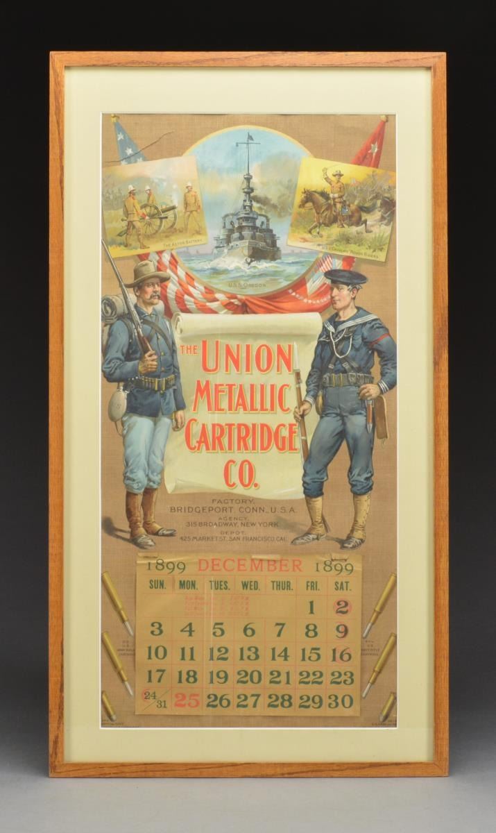 FOR 1899. This calendar was issued the year after the Spanish-American War & the vignettes depict images that would appear to relate to the Spanish-American War. There are various military images; the main scene is of a soldier standing at attention & a sailor in full period dress w/ draped flags behind. The images at the top are titled “The Astor Battery with Soldiers and Cannon”; the second image is of the “U.S.S. Oregon” & the right side image is of “T. Roosevelt and the 1st USV Cavalry Roughriders”. The calendar also depicts 6 popular military cartridges; 3 on each side. The calendar page for December 1899 is still intact however the other pages have been used up. This beautiful & desirable calendar is professionally framed & matted & what is very important is that beneath the matting is the original metal bands. We have removed the calendar from the frame & created a photograph of both the front & the back & have attached it to the back of the framed calendar so it can be clearly seen that the metal bands are in fact in place beneath the matting. SIZE: 28" x 13 1/2". CONDITION: near excellent & the calendar retains bright colors. A wonderful example. (02-14688). $1,250-1,750.