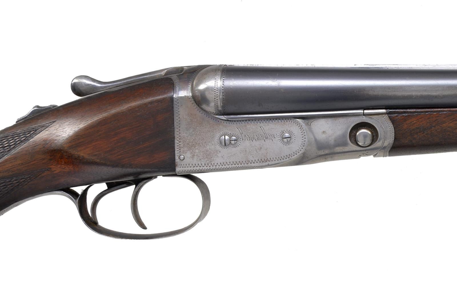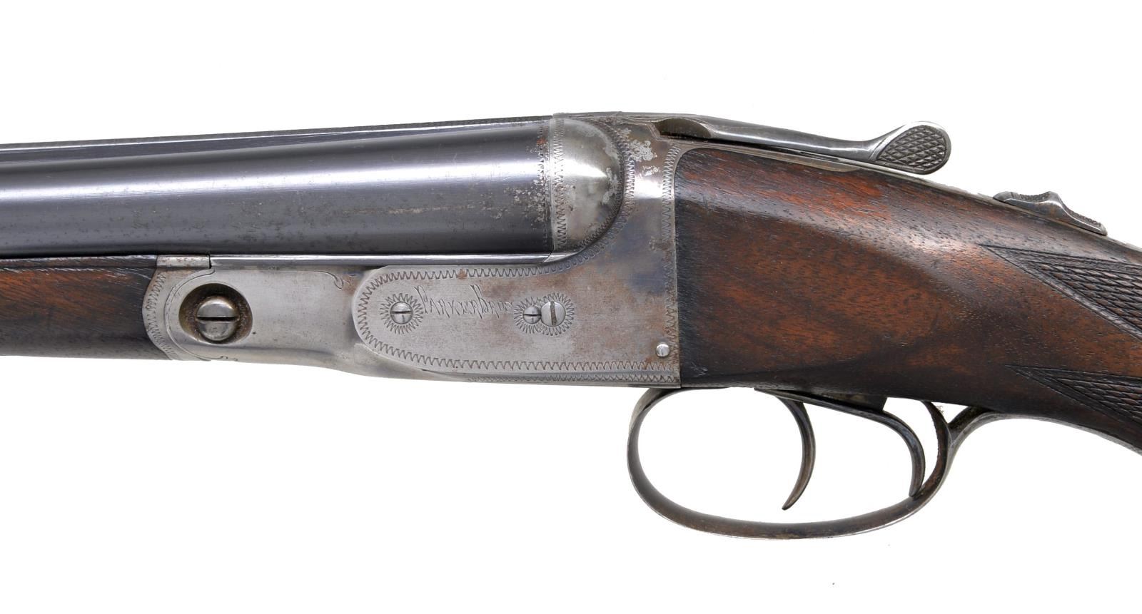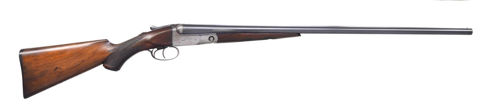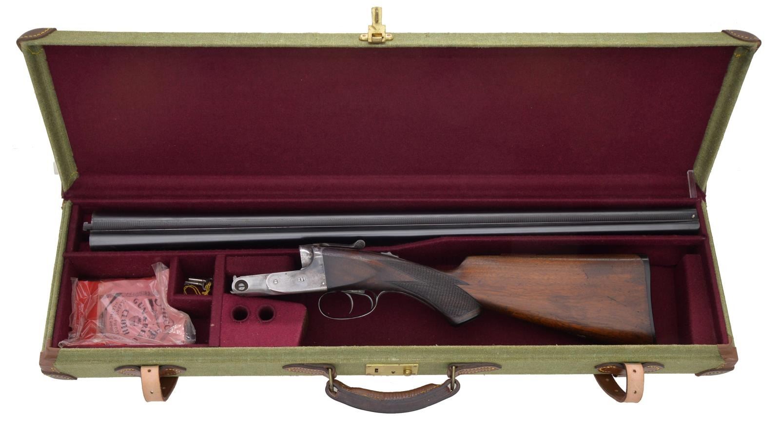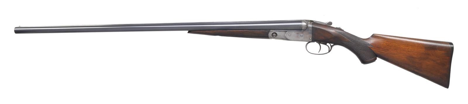 W/ CASE. Cal. 20 Ga. S# 165192. Bbl. 28". Sm. bore Parkers that haven't been messed w/ or augmented are not often found. This good handling 20 bore has 28" bbls. of Vulcan steel w/ usual makers marks on matted rib. Bottom of rear lump marked for "0" frame. Typical Parker boxlock action has automatic safety & dbl. triggers. Engraving is usual wiggle borders w/ "Parker Bros." on both sides. S# is on trigger guard tang. Relatively plain American walnut Parker capped pistol grip buttstock measures 13 5/8" over Parker dogshead buttplate w/ spur. Typical point pattern checkering is at grip & the usual German silver shield is on bottom. Matching splinter forend has usual Deely type release w/ patent date & steel tip. This gun is not listed in the Parker Gun Identification ledger. "The Parker Story" relates that about 5,000 guns were made in this configuration. MEASUREMENTS: BARRELS: Bore diameter) R: 614. L: 616. Restriction) R: .012 (IC). L: .023 (MOD). Min. Wall Thickness) R: .024. L: .023. STOCK: LOP: 13 5/8". DAC: 1 1/2". DAH: 2 1/2-". Cast: neutral. WEIGHT: 6 lbs. 3 oz. UNATTACHED ACCESSORIES: green canvas case w/ stitched leather corners lined in burgundy cloth which contains a key. CONDITION: very good to fine. Bbls. retaining approx. 80% what appears to be original blue w/ some scattering of marks & scratches, thinning at breech end from normal hand wear. Action retains approx. 20% original case hardening color, hand worn to silver around bottom w/ some cleaned light oxidation on sides & some splotches on top left. Stocks retain most of their original varnish finish worn through & considerably darkened at grip & head of stock. Checkering lightly worn. Bores are very fine to excellent w/ only 1 minor very shallow dent about 5" back from muzzle in left bbl. Action is tight, mechanically fine. Relatively new case is very good. Straps & handle are good as is interior cloth. (20-1658/MGM11). CURIO. $1,750-3,250.