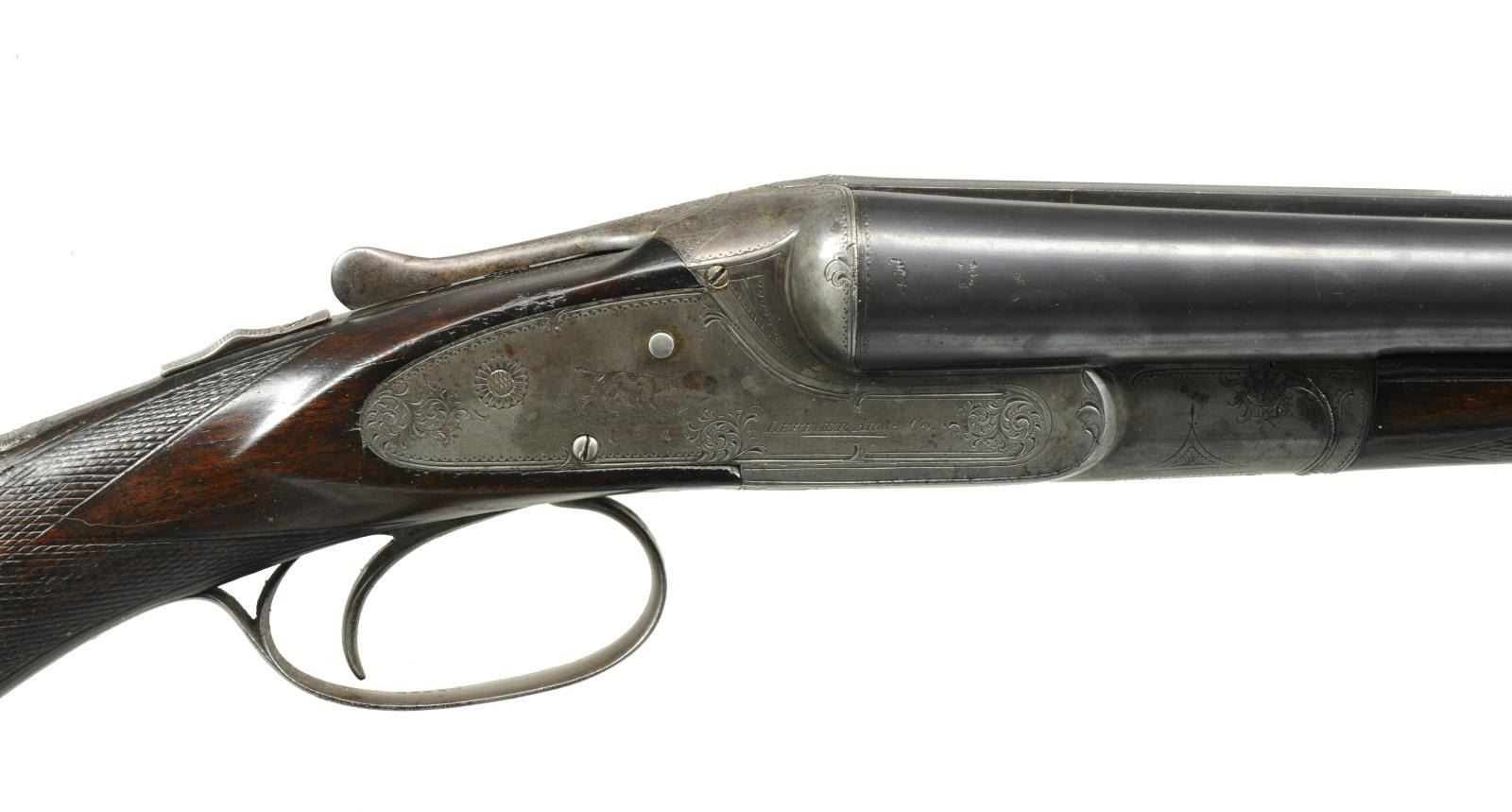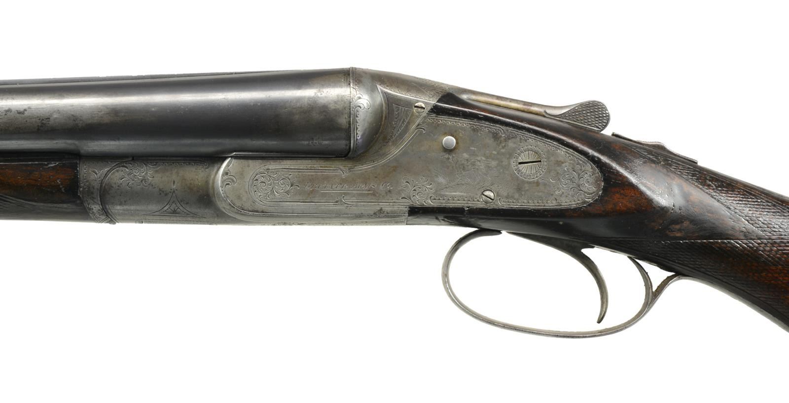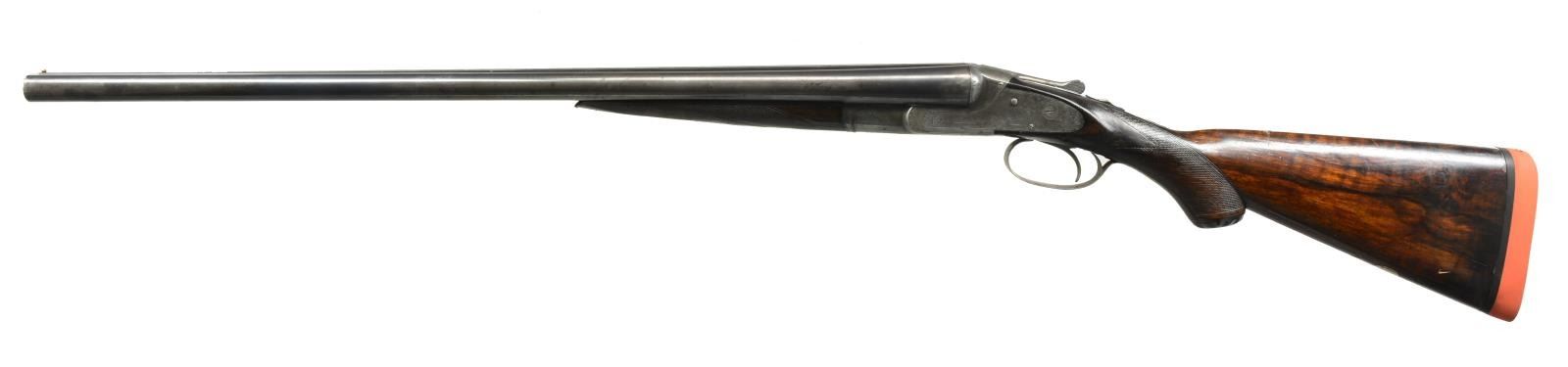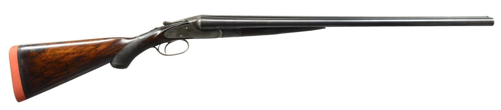 TRIGGER. Cal. 12 Ga., 2 5/8". S# 35082. Bbl. 26 1/16" w/ flat matted rib are engraved "KRUPP FLUID" "STEEL" on tops. Bottoms of bbls. are marked for steel type & w/ S#. There are no grade markings. Case hardened action w/ in frame ejectors & later style cocking hook marked w/ S# & grade on water table. Action features automatic safety, cocking indicators & non selective Lefever single trigger. Action & lockplates engraved w/ Lefever's usual superbly cut scroll w/ in geometric & line borders at about 30% coverage. This surrounds usual very finely detailed dogs w/ pointing pointer in tall grass on left plate & alert setter on right. A spaniel's head is on trigger guard bow, S# is on tang. Well marbled & fiddle figured European walnut capped pistol grip buttstock measures 13 1/2" over Silver type pad. Single trigger blade is in back position. The LOP would measure approx. 14 1/4" from a standard front trigger. The comb is of unusual low profile as is sometimes found on guns & rifles of this period & is quite possibly original. Point pattern checkering is at grip & a vacant silver oval is on toeline. Matching splinter forend w/ steel tip has shaped steel cover to friction release. MEASUREMENTS: BARRELS: Bore diameter: R .737 L .738. Restriction: R .001 (IC) L .010 (IC). Min. Wall Thickness: R .022 L .018 at 3" area on bottom approx. 12" back from muzzle, the rest mostly .021 to .025. STOCK: LOP: 13 1/2". DAC: 2". DAH: 2 5/8" Cast: 1/2". WEIGHT: 6 lbs. 7oz. CONDITION: good to fine. Bbls. retaining most of what appears to be an old reblue, action & locks retain 20-30% case hardening color w/ some scattered areas of pitting. Stocks retain a good amount of finish, possibly original, checkering considerably worn. There is evidence of repair to left side of grip behind lockplate. There is a sm. crack extending onto right side. Stock repair left side of wrist now flexes. Bores are good to fine, shiny w/ some frosting & 1 or 2 minor dents. Action is tight. Mechanically fine. (20-2384/MGM25). CURIO. $900-1,800.