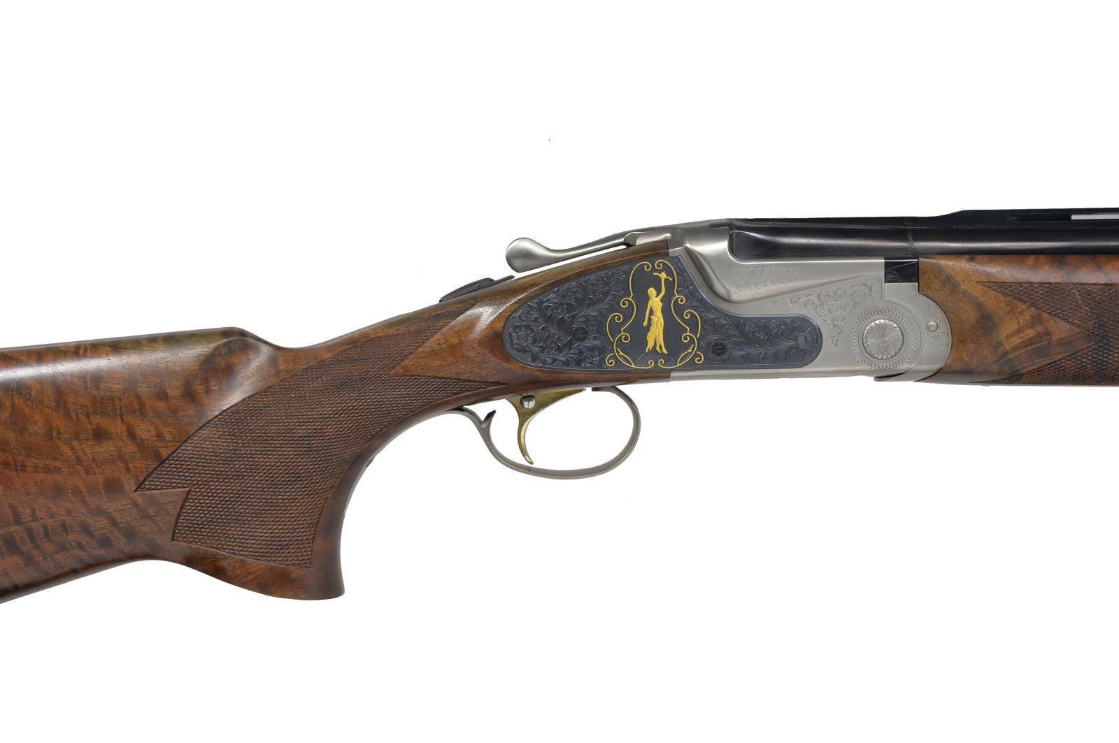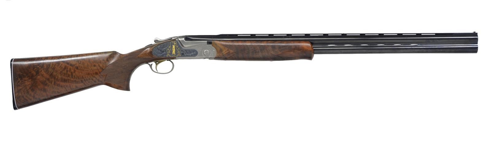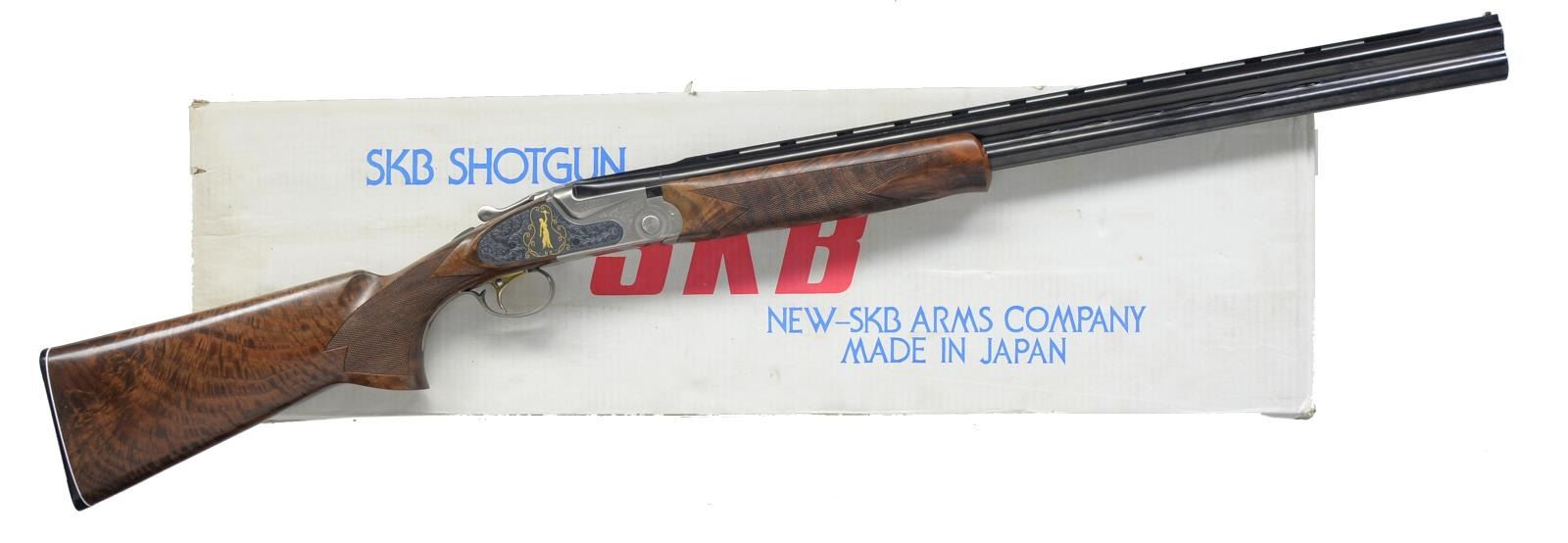 HUNT" EDITION TARGET O/U SHOTGUN. Cal. 12 Ga., 3". S# AS05361. Sporting Clays model having 28” mono-bloc bbls. Fitted w/ Broadway type ventilated rib & ventilated side ribs, have all factory markings on left side of top bbl. Bbls. are fitted w/ choke tubes. Coin finished low profile O/U action w/ gold plated single selective trigger has sprays of scroll engraving. Blued ornamental sideplates are very nicely engraved w/ well shaded & cut lg. flowing acanthus. On both sides central motif is of a relief gold inlaid portrait of nude “Diana” Goddess of the Hunt, bow held aloft. Her pet deer is at her side. This scene is flanked by flush gold inlaid scrolling wire border. Nicely crotch figured Claro walnut extreme pistol grip buttstock measures 15” over SKB buttplate w/ white line spacer. Point pattern checkering is at grip w/ ambidextrous palm swell. Matching one piece schnabel forend has Deeley type release. DAH: 2 3/8”. DAC: 1 9/16”. WEIGHT: 8 lbs. 12 oz. UNATTACHED ACCESSORIES: white cardboard box w/ end label for this gun contains one choke tube, installation tool & other paperwork. CONDITION: essentially “as new” appears unfired since proof w/ only the faintest of handling marks in all factory surfaces. Mechanically crisp. Box is fine. (20-634/MGM135). MODERN. $2,800-3,800.