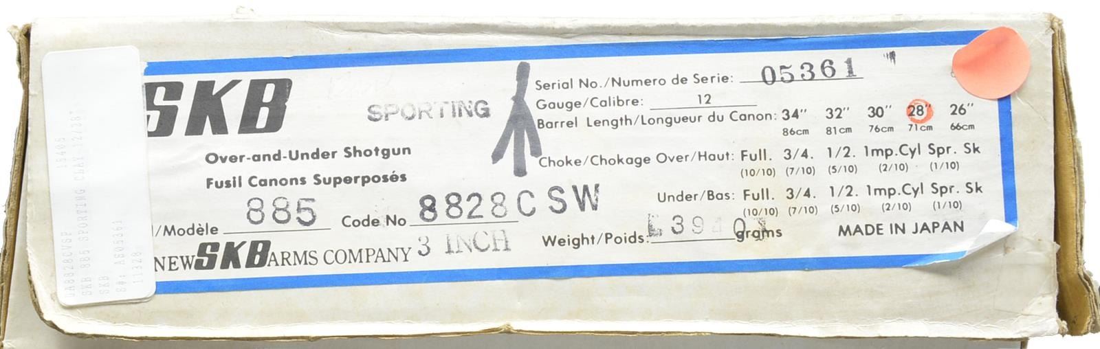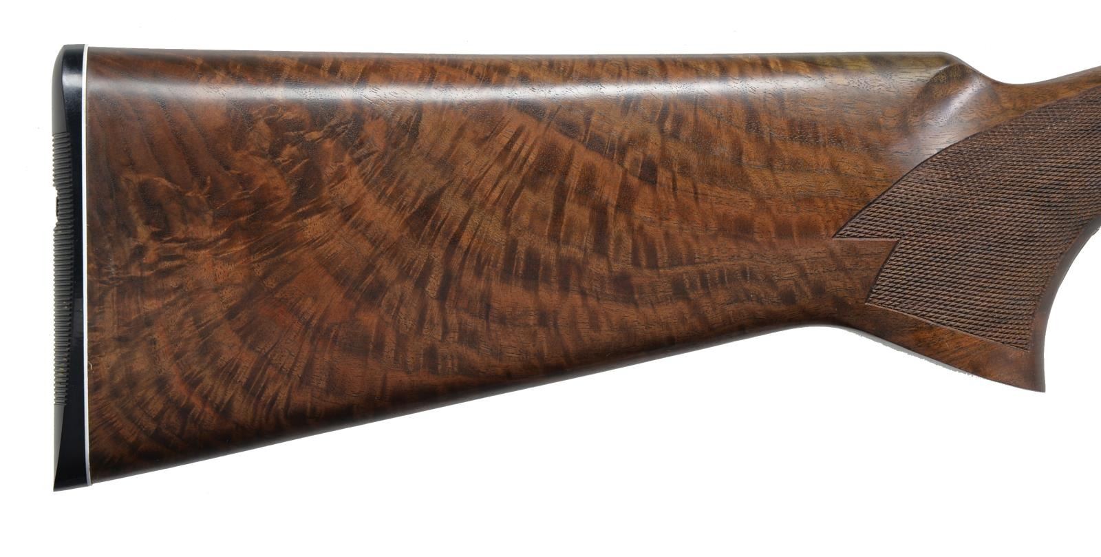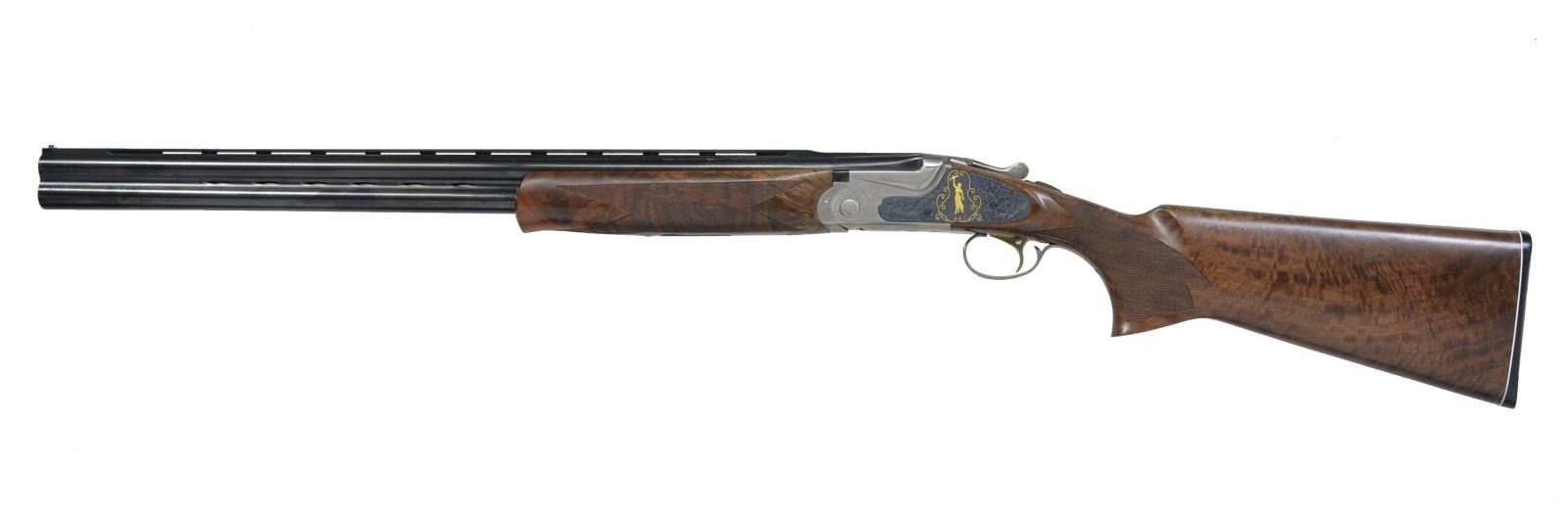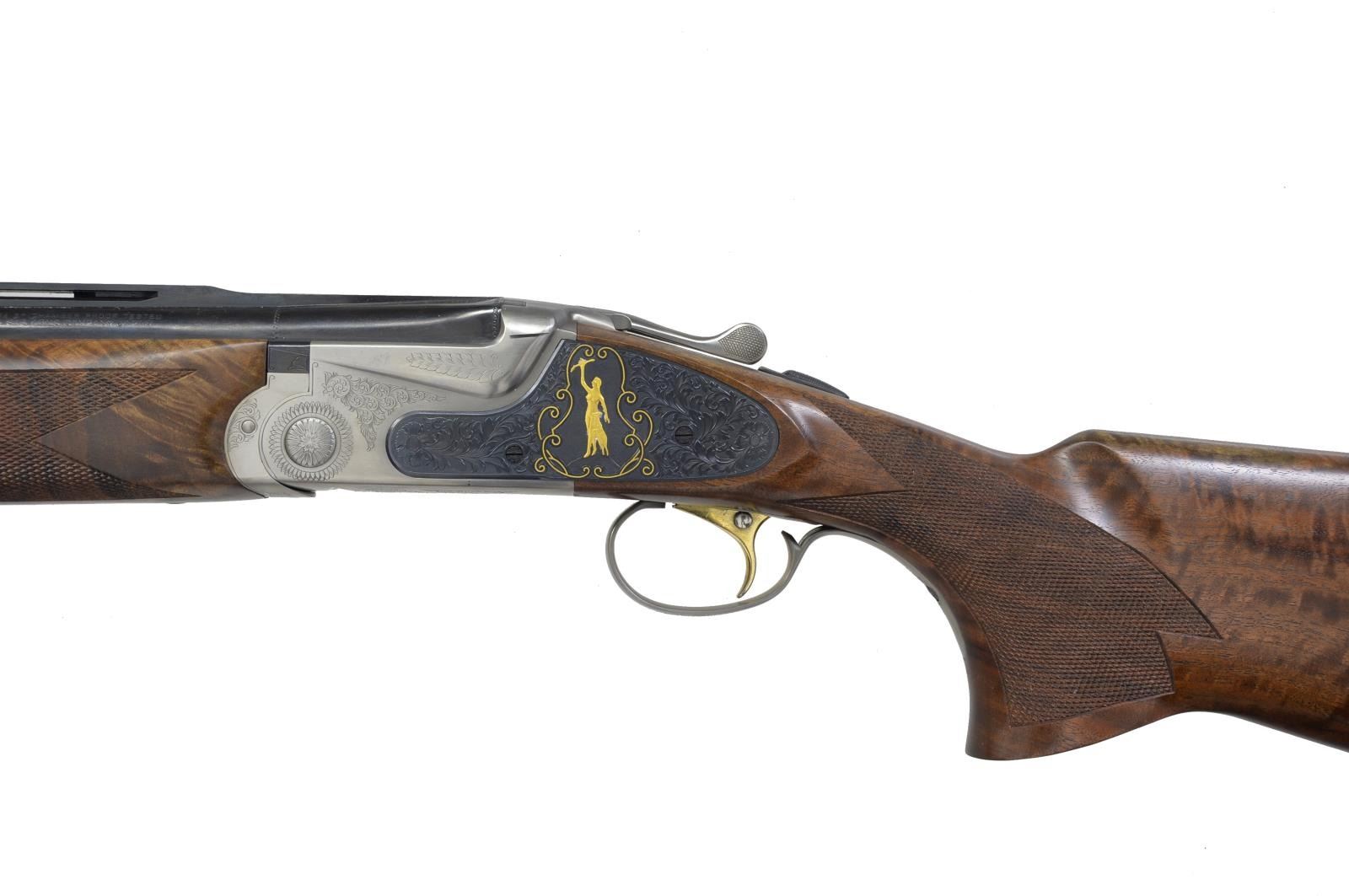 HUNT" EDITION TARGET O/U SHOTGUN. Cal. 12 Ga., 3". S# AS05361. Sporting Clays model having 28” mono-bloc bbls. Fitted w/ Broadway type ventilated rib & ventilated side ribs, have all factory markings on left side of top bbl. Bbls. are fitted w/ choke tubes. Coin finished low profile O/U action w/ gold plated single selective trigger has sprays of scroll engraving. Blued ornamental sideplates are very nicely engraved w/ well shaded & cut lg. flowing acanthus. On both sides central motif is of a relief gold inlaid portrait of nude “Diana” Goddess of the Hunt, bow held aloft. Her pet deer is at her side. This scene is flanked by flush gold inlaid scrolling wire border. Nicely crotch figured Claro walnut extreme pistol grip buttstock measures 15” over SKB buttplate w/ white line spacer. Point pattern checkering is at grip w/ ambidextrous palm swell. Matching one piece schnabel forend has Deeley type release. DAH: 2 3/8”. DAC: 1 9/16”. WEIGHT: 8 lbs. 12 oz. UNATTACHED ACCESSORIES: white cardboard box w/ end label for this gun contains one choke tube, installation tool & other paperwork. CONDITION: essentially “as new” appears unfired since proof w/ only the faintest of handling marks in all factory surfaces. Mechanically crisp. Box is fine. (20-634/MGM135). MODERN. $2,800-3,800.