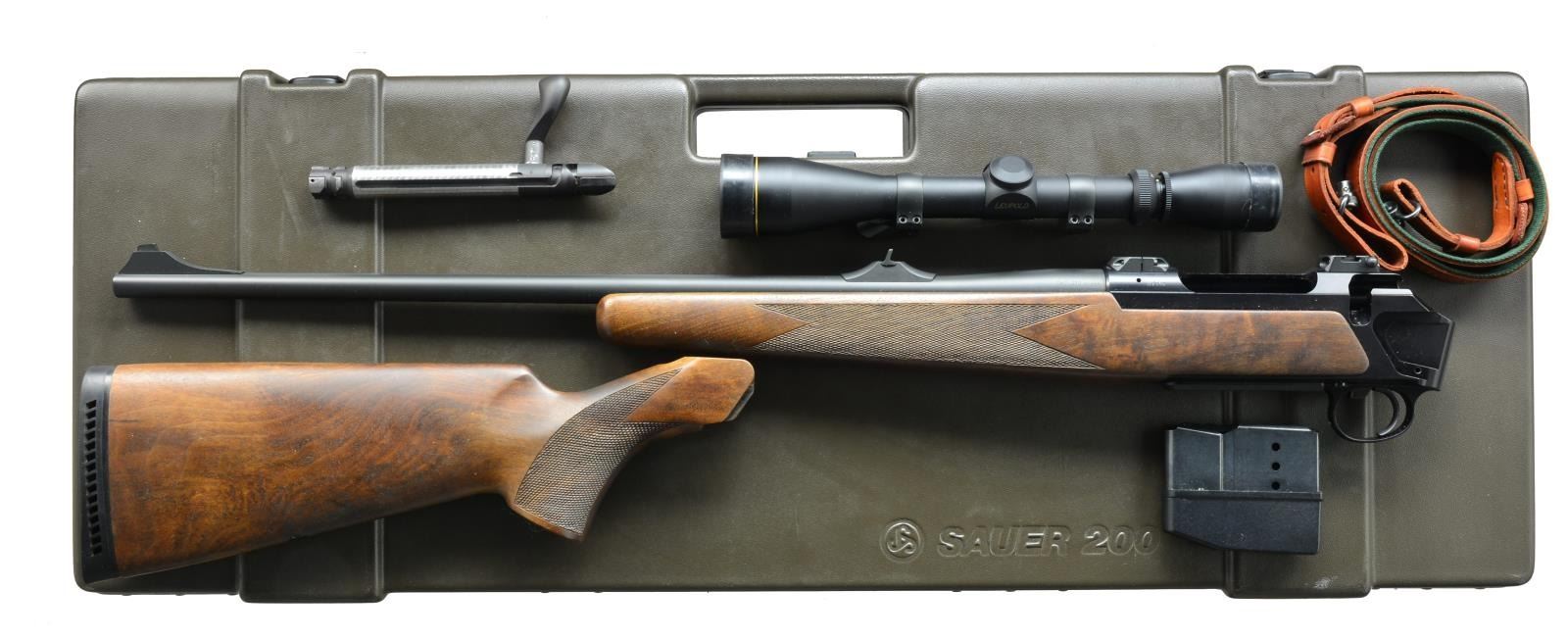 COMPONENTS & DIES. Cal. .270 Win. S# H7140. This rifle was the property of gun writer Jim Fender & his notes indicate that there were only 150 true left hand versions of this, the "Lux" model. He further relates "this rifle is extremely accurate & has accounted for a number of 1 shot kills on North American game". Rifle has 24" bbl. fitted w/ iron sights, alloy receiver w/ removable box magazine is fitted w/ E.A.W. QD scope mounts holding Leupold 3x9 "Vari-X IIC" scope w/ crosshair & dot reticle. Oil finished checkered stock features black recoil pad & left hand palm swell. UNATTACHED ACCESSORIES: included w/ rifle are cloth lined leather sling, spare mag. & stock takedown tool in ABS case marked "Sauer 200". Also included is an orange "Cantico" storage box containing a lg. number of fired cases, RCBS dies & a lg. variety of bullets ranging from 110-160 grains by Hornaday, Nosler, Speer, Sierra & Barnes along w/ consignor's notes & Sauer catalogs. CONDITION: very fine w/ only a few light handling marks. Mechanically fine, scope is clear. (20-2393/MGM85). MODERN. $1,500-2,250.