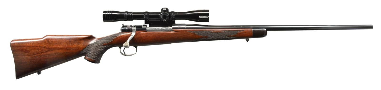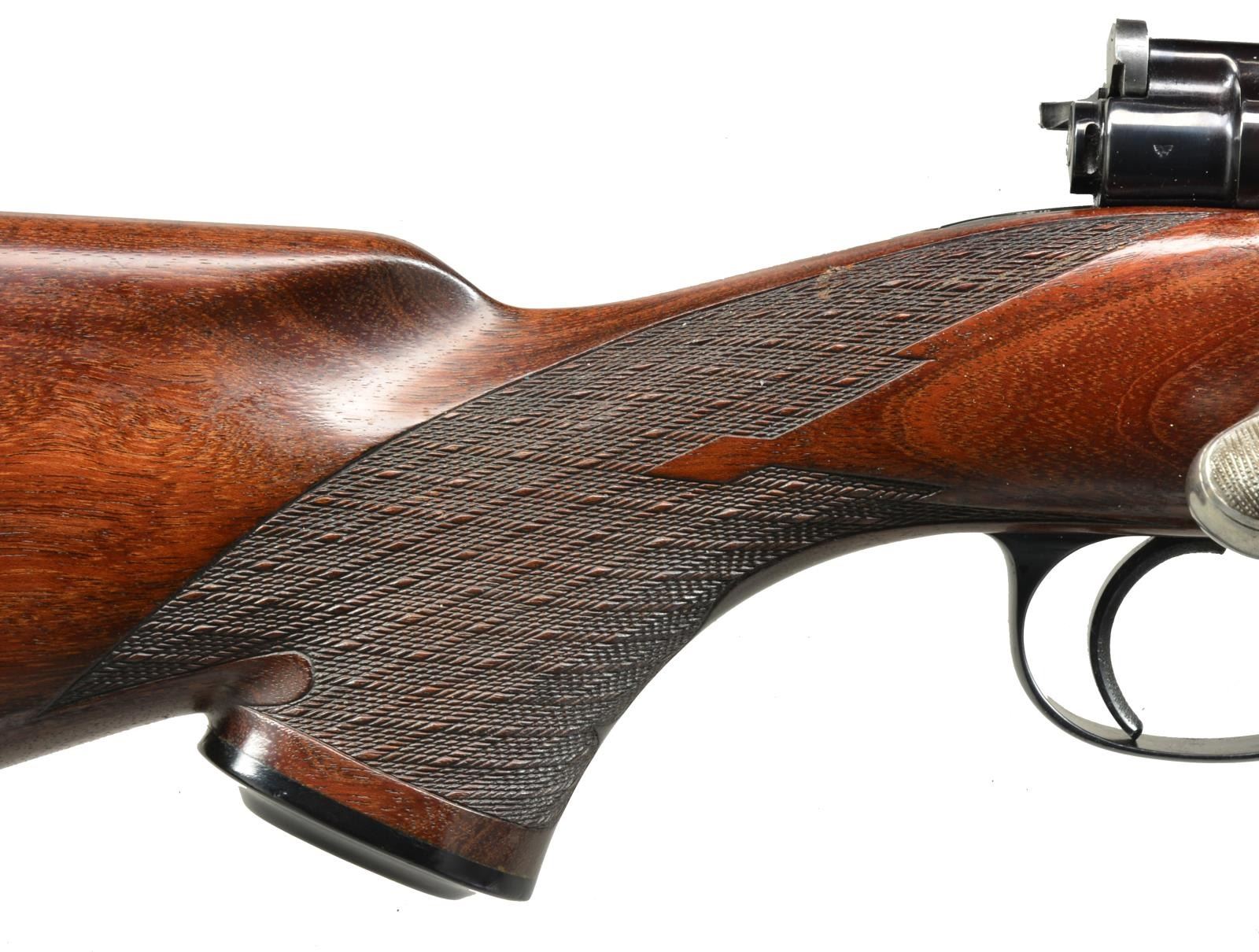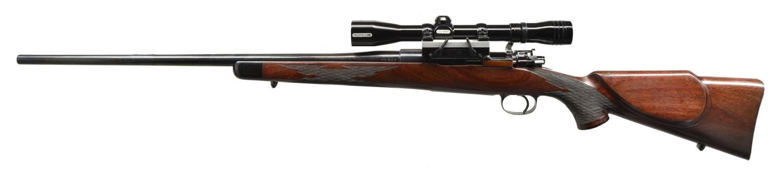 Cal. 270 WCF. S# 1874. Bbl. 24" w/out sights. Model 98 action w/ stripper clip guide. Features include stippled front ring, jeweled bolt, extractor & follower, 2 panel checkered bolt handle, low swing safety & commercial single stage trigger. Floorplate has checkered release button & leading edge. Redfield Lo-Pro fixed power scope w/ duplex reticle & gloss finish on a B-Square QD side mt. Leonard Mews walnut Monte Carlo sporting stock. Mews worked for Weatherby in the late 1940's & early 50's & is credited w/ designing the Weatherby stock as it's known today. According to Roy Weatherby, Mews was his "first & best stock maker ever". Features include shadow line cheekpiece, ebony forearm tip, sculpted ebony grip cap, swivel bases & Niedner checkered steel buttplate. Wrist & forearm have fancy French style skip line borderless hand checkering. Stock inletting is marked "WEATHERBY" under front ring & "L MEW" in bbl. channel. Mfg. 1953. CONDITION: over 98% original blue. Stock has very good finish showing scattered scratches & marks. Bright bore w/ sharp rifling. Scope has clear optics. (20-2262/DS). CURIO. $1,500-2,000.