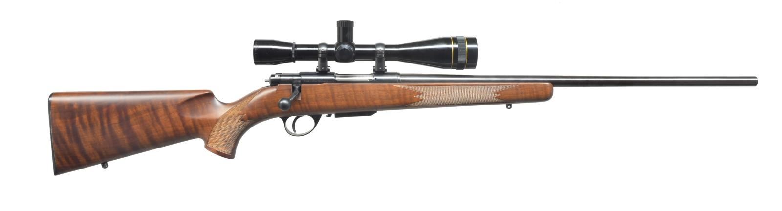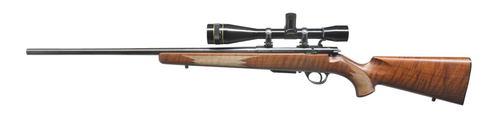 SCOPE. Cal. .222 Rem. S# 1464634. Bbl. 23" medium weight marked w/ model & cal. & “FACTORY LOAD ONLY” on top. Rear is stamped w/ German Obendorf proofs. Sm. bolt action marked “J. G. Anschutz Ulm Germany” on left side. Right rear marked w/ instruction warning. “Meistergrade" tiger figured European walnut pistol grip stock measures 14 3/8" over ribbed hard rubber buttplate & features sling studs & point pattern checkering at grip & forend. Rifle is fitted w/ Leupold “High Turrent” 12X scope w/ duplex reticle in Weaver type steel rings & alloy bases. MAGS: 1- box, 3 rd. UNATTACHED ACCESSORIES: instruction book numbered to this gun w/ target & warranty card & foam shipping container for this rifle. CONDITION: very fine, essentially “as new” w/ only some minor handling & assembly marks in all factory finishes. Bright shiny bore, mechanically crisp. Scope is very fine, optically clear. (20-4089/MGM). MODERN. $1,500-2,000.