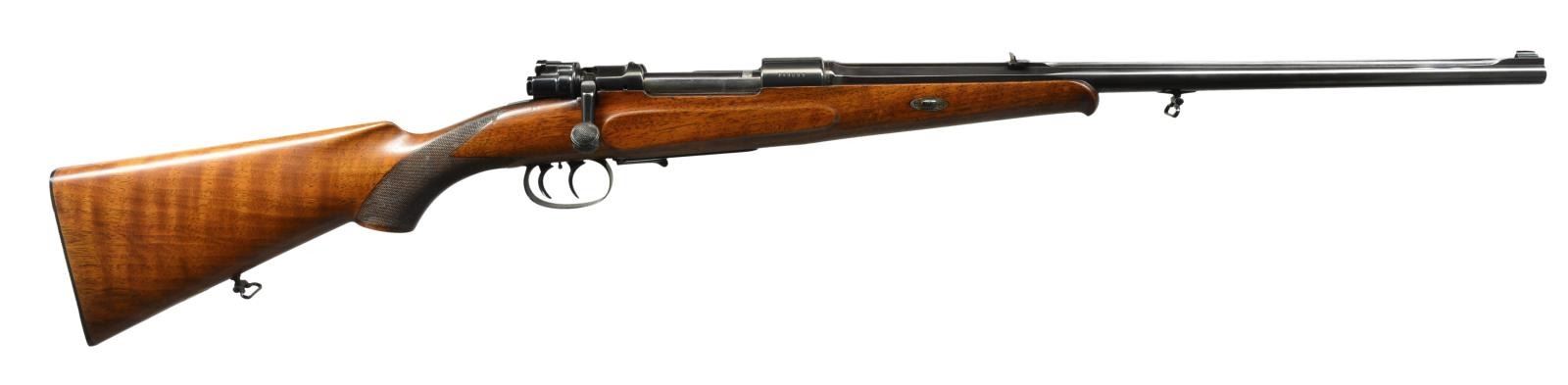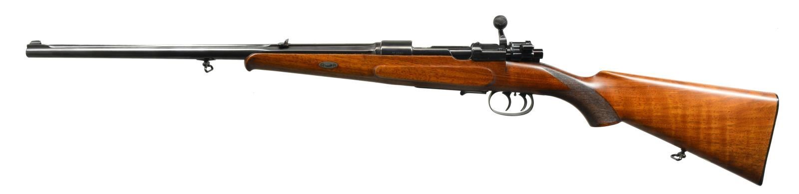 Cal. 9x57 Mauser. S# 141897. W/ .357 Groove diameter. Bbl. 20 1/2" 3rd oct. ribbed w/ attractive secondary milling cuts in front portion of rib is fitted w/ 1 standing 1 folding leaf U-notch rear sight & silver bead front. Milled out portion at rear of rib engraved "Mod. Mauser J.P. Sauer & Son". S# is on right side of receiver ring which has stippled top. Right side of bridge is drilled & tapped for a Lyman sight, wood is intact. Bolt handle has been forged down & w/ knob cranked out in H&H style. Knob is checkered in two panels. Bottom metal has original double set triggers & lever type floorplate release. Tiger striped European walnut pistol grip buttstock measures 14" over ribbed horn buttplate. Stock features side panels, schnabled tip & point pattern checkering at grip. A sling loop matching that on bbl. along w/ a vacant silver oval are on toeline. Secondary attachment of stock to bbl. is a sliding side bolt through oval steel escutcheons. UNATTACHED ACCESSORIES: Norris Morgan inventory sheet. CONDITION: fine as refinished. Metal parts w/ nearly all shiny immersion blue, stock w/ hand rubbed oil finish w/ a few subsequent marks. Checkering has not been recut & is lightly worn. Bore is very fine w/ some slight erosion at throat. Mechanically fine. This rifle was also the property of Norris Morgan & is accompanied by his inventory sheet & cancelled check dated 1958 in the amount of $110. (20-1679/MGM56). CURIO. $800-1,500.
