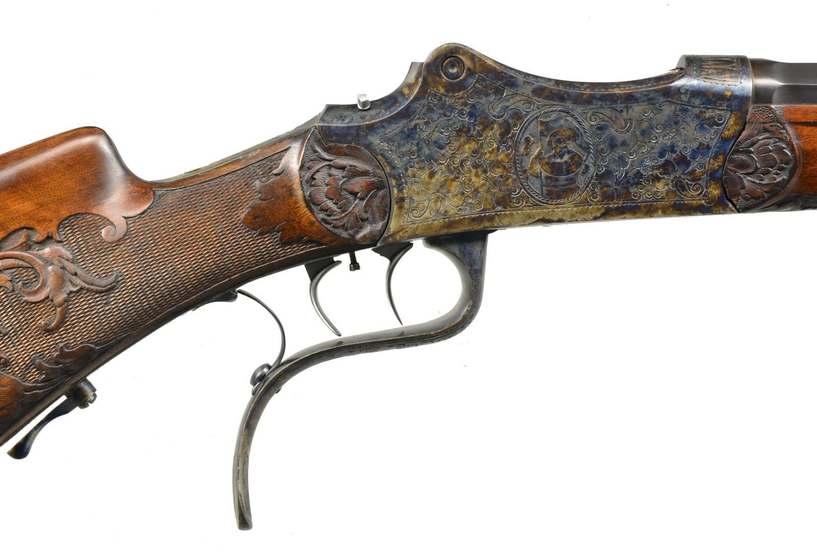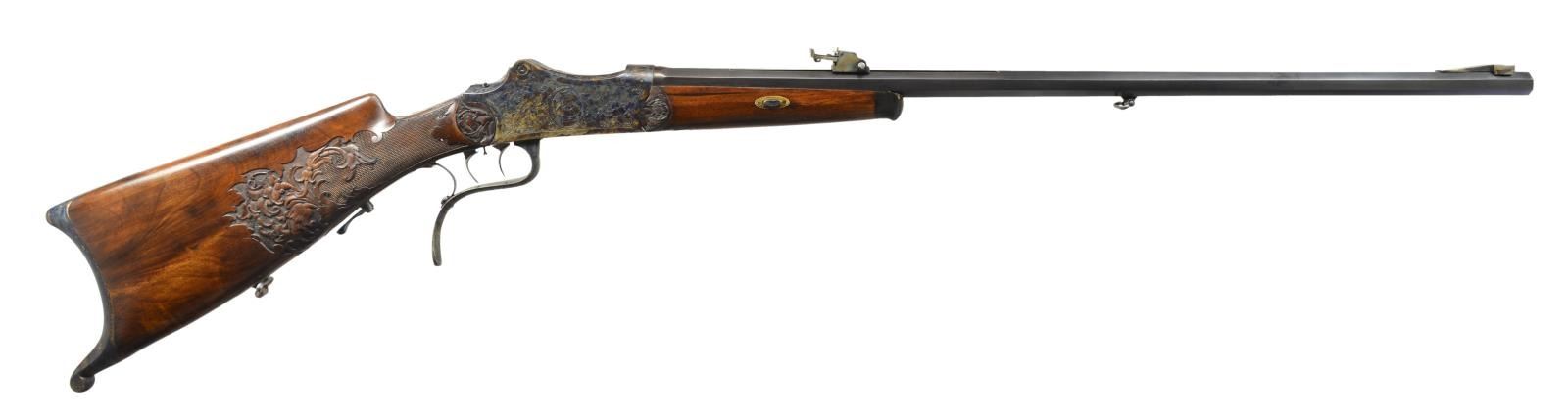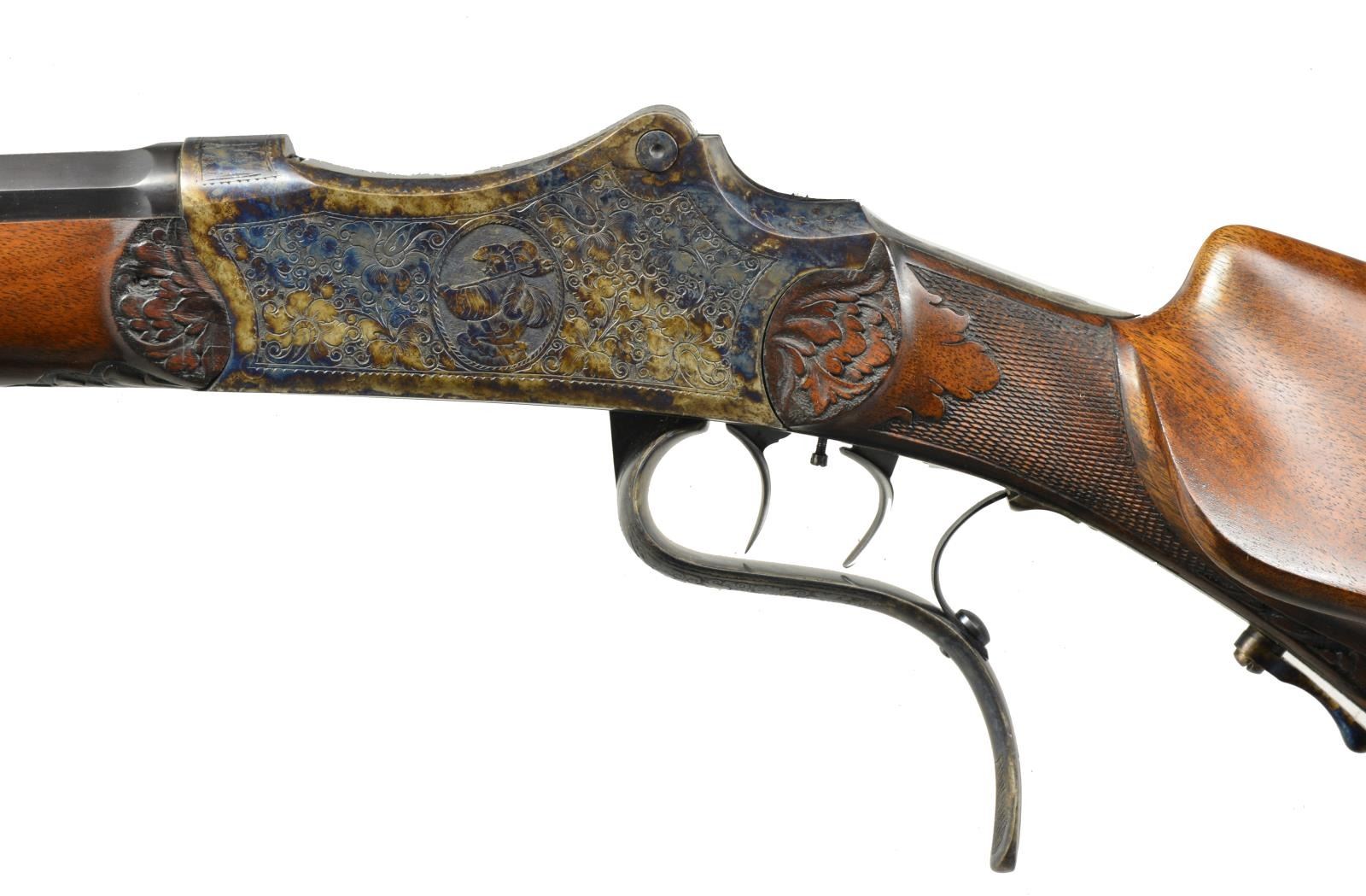 PISTOR & KOST. Cal. 8.15x46R. NSN. Bbl. 30" octagonal engraved "Pistor & Kost, Schmalkalden" on unmatted portion of matted top flat. Rear integral dovetail is fitted w/ U-notch rear sight. Case hardened martini type tipping block action features removable trigger group & dbl. set triggers. Action engraved w/ nicely cut shaded scrolling acanthus w/ lg. floral highlights surrounding oval vignettes of medieval soldiers on each side. Stocks of somewhat figured European walnut are very nicely relief carved w/ acanthus motif at rear of checkering, behind right hand cheekpiece on butt & at intersection w/ action of matching forend w/ schnabled horn tip. CONDITION: fine as lightly refinished. Bbl. w/ nearly all high quality rust reblue. Action & buttplate recolor case hardened & retain nearly all of that color. Stocks also lightly refinished, sharp edges & carving detail preserved. Bore is fine & appears to be shiny w/ strong rifling, should clean. Trigger will not set, rear action sight missing, as is front bead. (20-2255/MGM67). CURIO. $1,000-1,500.