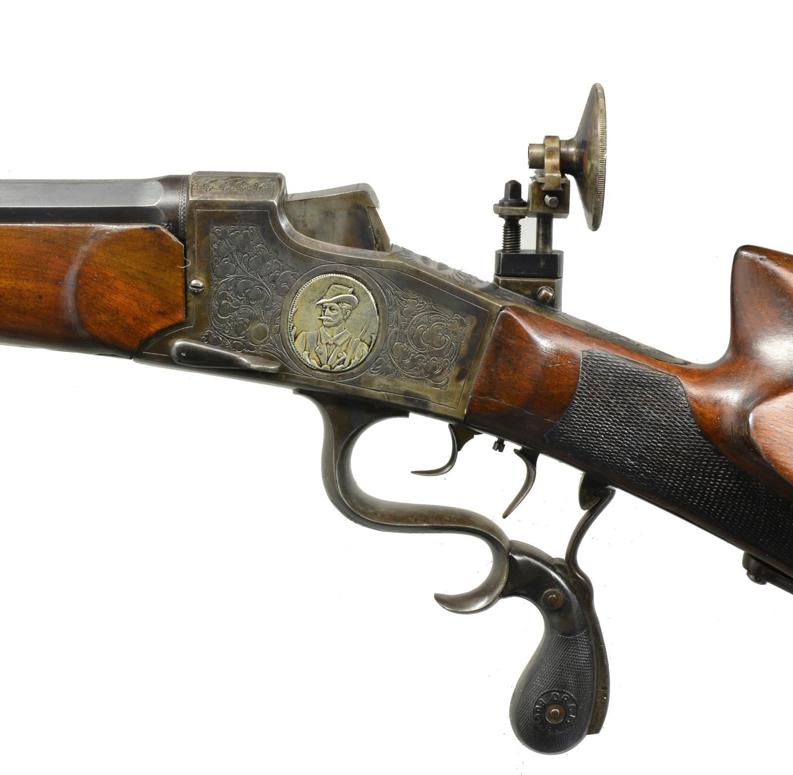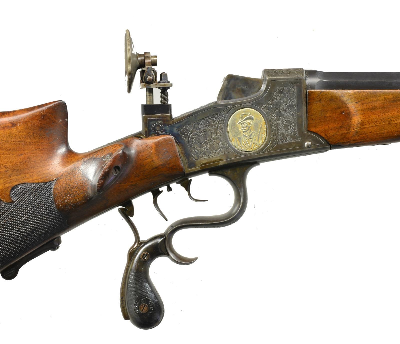 BY E. KONIG. Cal. 8.15X46R. NSN. Bbl. 31" octagonal retains adj. rear sight mounted on integral dovetail. Top of bbl. engraved "E. Konig, Sorau N.L.". Rear portion marked "PRIMA WITTENER STAHL". Buchel patent action w/ removable trigger assembly has hard rubber Buchel marked finger lever grips. Action is engraved w/ 80% coverage shaded acanthus scroll surrounding inset oval silver inlays depicting Germanic hunter on each side. Top of action is silver inlaid "BUCHEL" "MEISTER" "D.R.G.M.". Original diopter, tang sight is retained & rifle features dbl. set triggers. Schuetzen style stock of relatively plain European walnut has heavy steel single pronged "Schuetzen" buttplate & features high sculpted right hand cheekpiece mirrored by carved volute on right side of stock along w/ thumbrest. Checkering is of fancy pattern, matching very plain slightly schnabled forend (uncheckered) attaches to bbl. w/ sidebolt through oval steel escutcheons. CONDITION: fine as refinished. Bbl. w/ nearly all of an old reblack over some scratches & bumps. Action recase colored w/ some subsequent wear. Gutta percha handles are somewhat worn. Stocks retain nearly all their oil refinish, sharp edges rounded. Checkering lightly worn & soiled. Shiny bore w/ strong rifling. (20-2256/MGM65). MODERN. $1,000-2,000.
