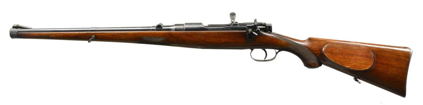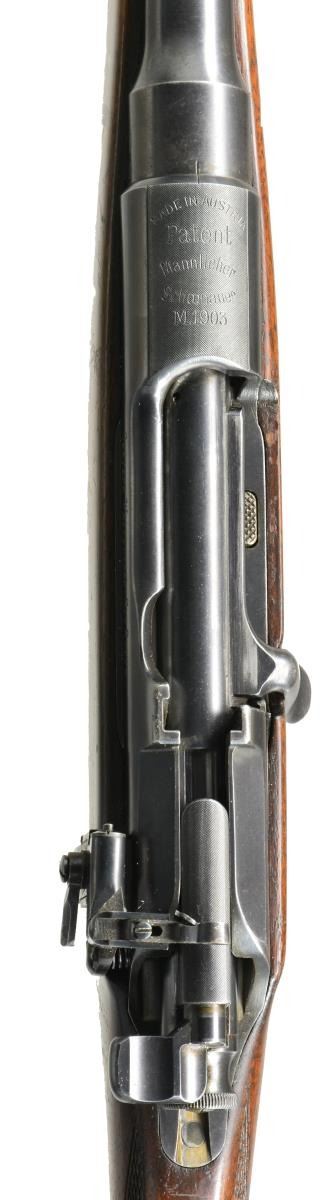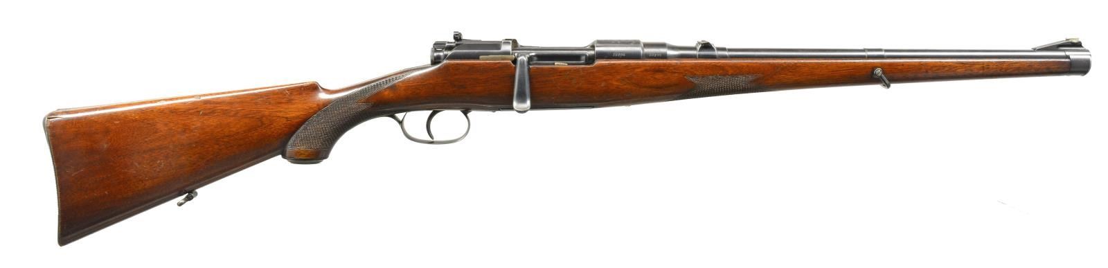 MANNLICHER SCHOENAUER. Cal. 6.5x54 MS. S# 18104. Bbl. 18" rnd. These handy little rifles are always popular & are hard to find in better than average condition w/ good bores. This rifle is in standard configuration except that trigger is of single stage type not the usual double set. The 6.5 carbines like this one had 18" tapered rnd. bbls. This rifle is fitted w/ single folding leaf rear sight marked for 300 yds. & usual German silver front bead in short matted ramp. Typical action w/ rotary magazine, has all correct factory markings on matted receiver ring & left side wall. Bolt stop has been fitted w/ Lyman 36 sight w/ spring loaded swinging aperture, allowing bolt to clear. Stock of relatively plain European walnut extends to muzzle in typical fashion w/ steel cap, bail type sling attachment & horn capped pistol grip. Steel buttplate has trap for cleaning equipment (not present). Stock also features sm. right hand cheekpiece & point pattern checkering at grip & forend. LOP: 13 3/4". WEIGHT: 6 lbs. 11 oz. CONDITION: fine. Bbl. & action retaining 85-90% original blue, silvered on high edges. Floorplate retains most of its blue, beginning to rub through from normal hand wear. Stock retains 70-80% original varnish finish w/ numerous scratches & a few scrapes. Areas of wear are seen at grip & on bottom at balance point. Checkering is lightly worn. There are some sm. cracks radiating from top of buttplate at heel. Bore is very fine to excellent, shiny w/ sharp rifling throughout. Mechanically smooth. (20-1663/MGM14). CURIO. $1,000-2,250.