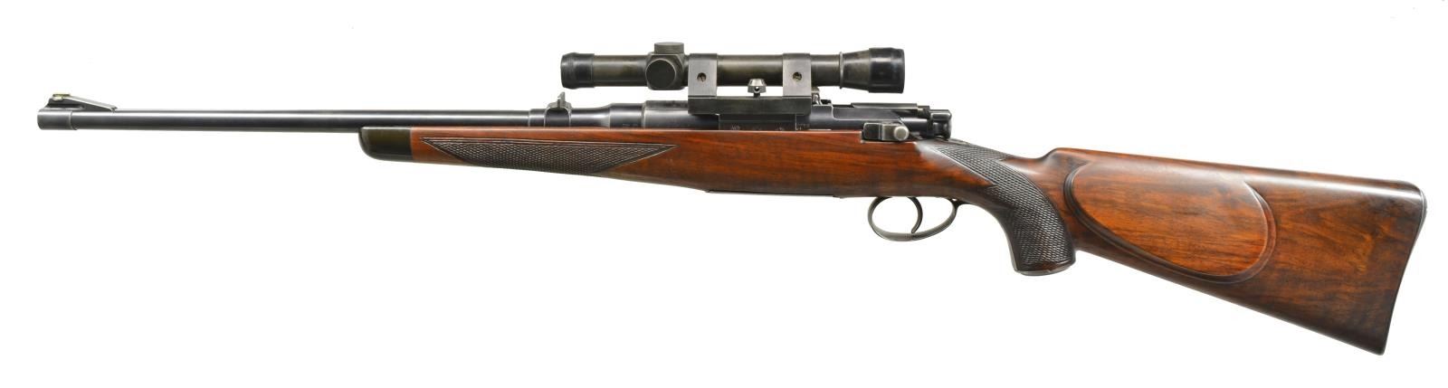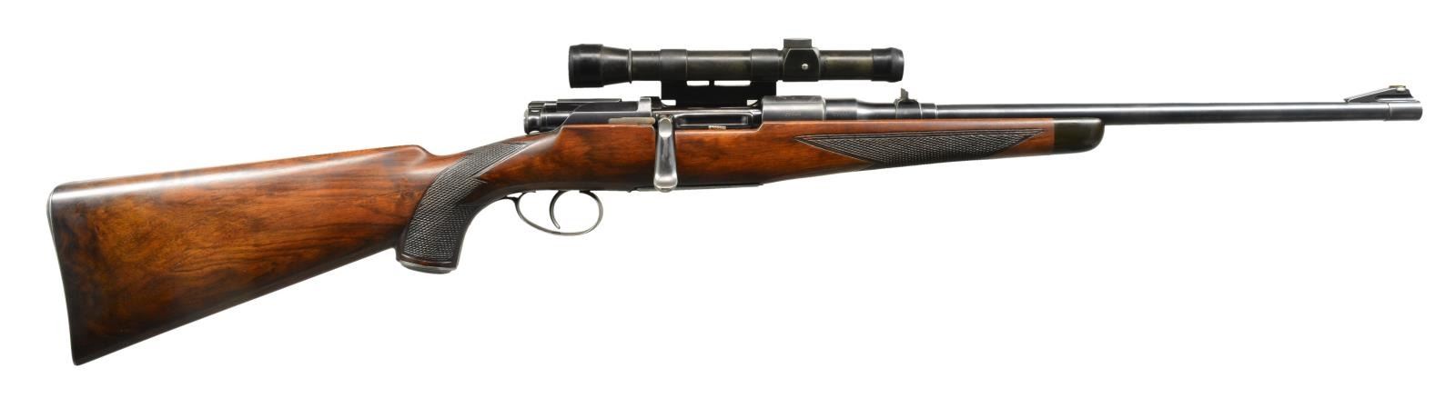 SPORTING RIFLE. Cal. 6.5x54 Mannlicher Schoenauer. S# 21535. Bbl. 18" w/ band fastened German silver blade ramp front sight & fixed U notch rear sight. R. Nosky No. 802 scope w/ dot reticle on unmarked side mt. Action features detachable rotary mag., butterknife bolt handle, 2 stage trigger & wing type safety on bolt shroud. Straight comb sporting stock of fancy European walnut. Features include shadow line cheekpiece, ebony forearm tip, steel grip cap & checkered steel trapdoor buttplate. UNATTACHED ACCESSORIES: knife, compass & matches found in trapdoor butt. CONDITION: over 70% lightly faded blue showing wear on floorplate, trigger guard & grip cap. Stock shows light wear w/ scattered handling marks. Bore is bright w/ strong rifling. Scope has clear optics. (20-2242/DS). CURIO. $700-1,100.